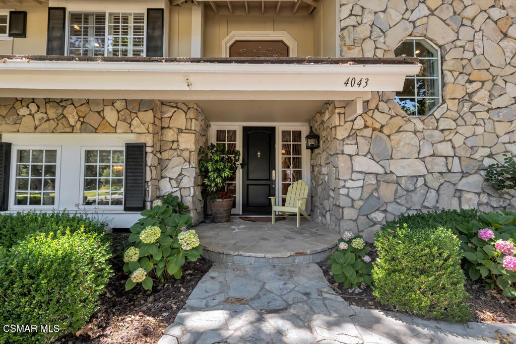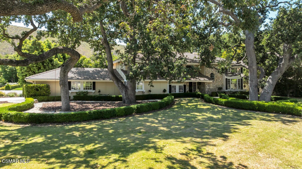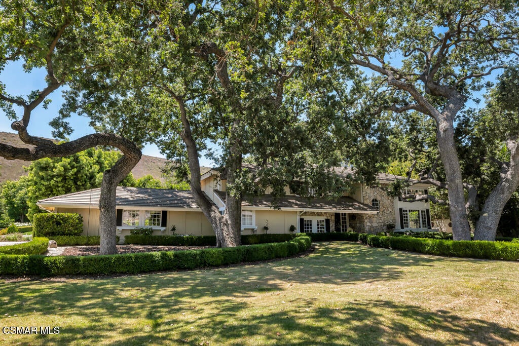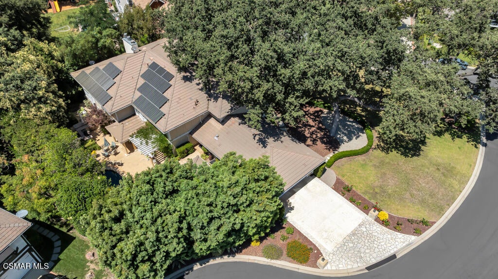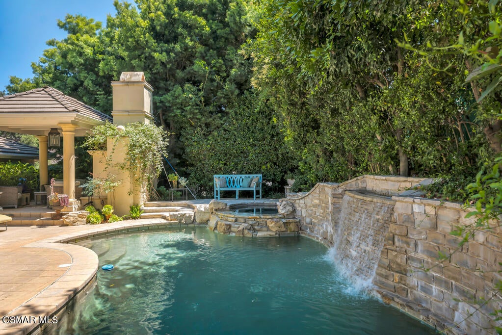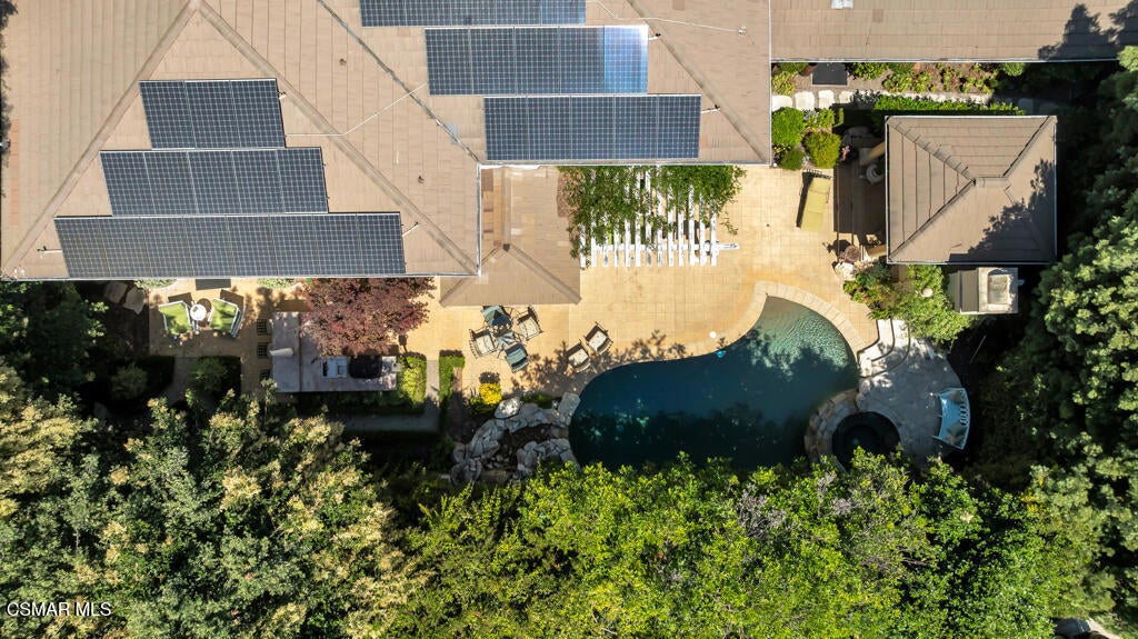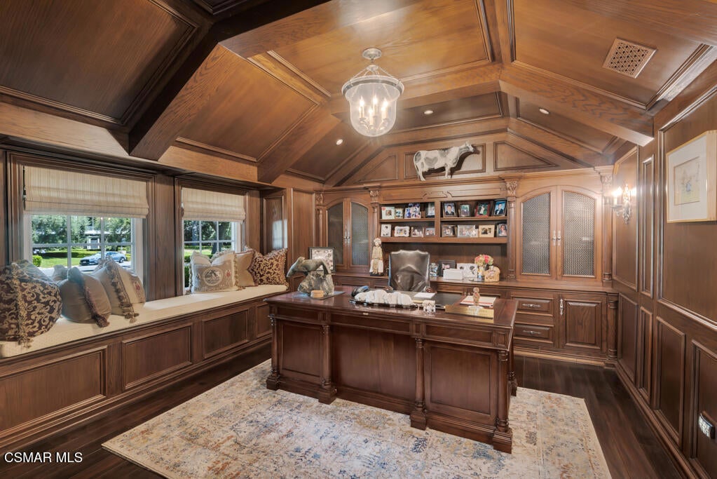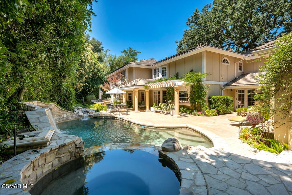 This is the ONE! EXCEPTIONAL QUALITY IN NORTH RANCH: If you value fine craftsmanship, timeless design, and attention to detail, this exquisite North Ranch estate is for you. No expense was spared in the construction and design of this traditional masterpiece executed with refined taste and top-tier materials throughout.A dramatic two-story foyer and custom-crafted staircase set the tone upon entry. Gorgeous walnut floors run throughout most of the home, complemented by designer carpeting and extensive use of classic white Carrara marble. The chef's kitchen is a true showpiece, featuring rich wainscoting, intricate custom millwork, top-of-the-line gourmet appliances, a walk-in pantry, and French doors that open to the backyard.The flexible floor plan offers two inviting family rooms one of which could serve as a spacious bonus room. Throughout the home you'll find stunning hand-hewn beams, floor-to-ceiling wainscoting, and bespoke cabinetry. An impressive oak-paneled office with detailed wall and ceiling treatments provides an ideal work-from-home setting.The luxurious primary suite offers a peaceful retreat, complete with a cozy fireplace, an elegant marble bathroom with a steam shower, and a fully customized walk-in closet. Upstairs are three additional bedrooms and two beautifully appointed bathrooms.Outside, the private, wooded yard is an entertainer's dream, with a pebble-finish pool, spa, and cascading waterfall. A covered loggia with fireplace, a built-in BBQ island, and bar seating create the perfect outdoor living and dining spaces.Additional features include a 4-car tandem garage, plus fully payed for 34 panel solar system that reduces huge cost to almost nothing. All on an incredible lush tree lined lot with such a sense of privacy.A rare offering in the heart of prestigious North Ranch uncompromising in quality, and rich in character.