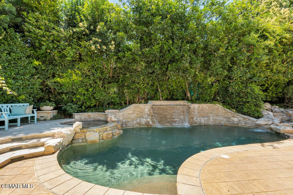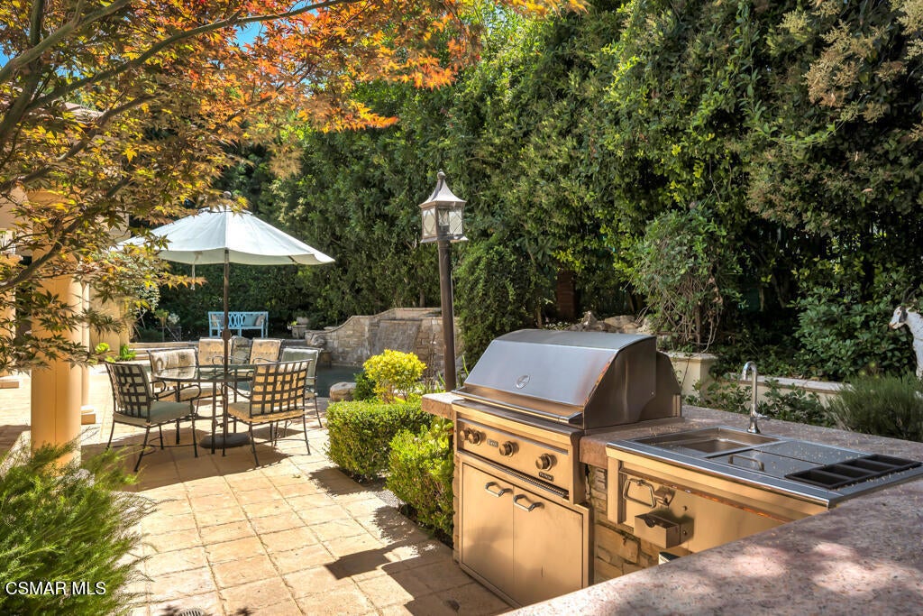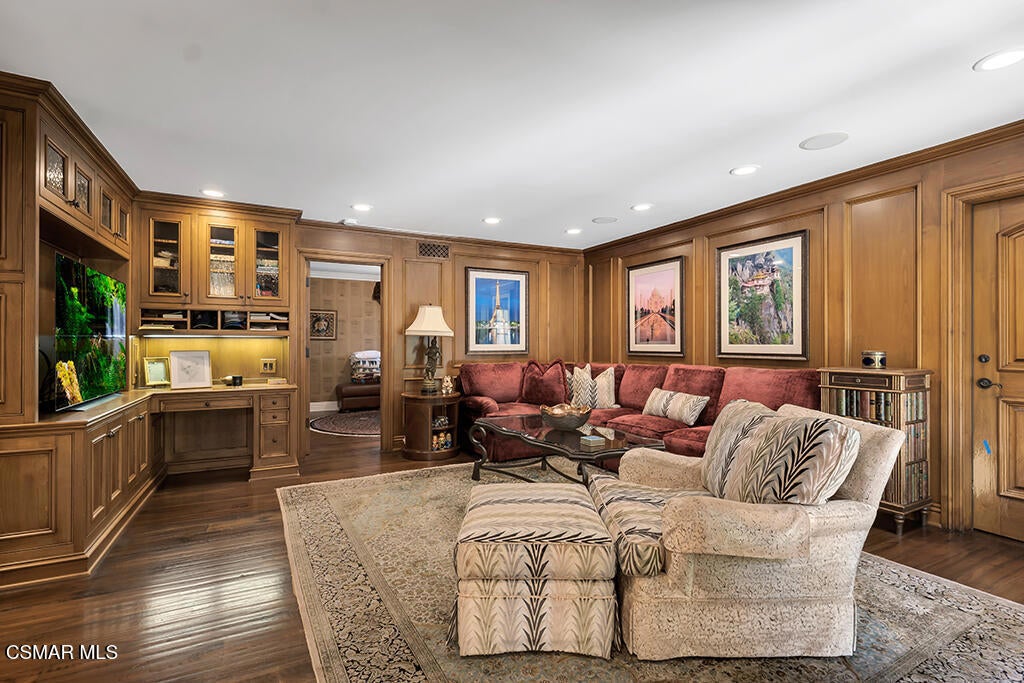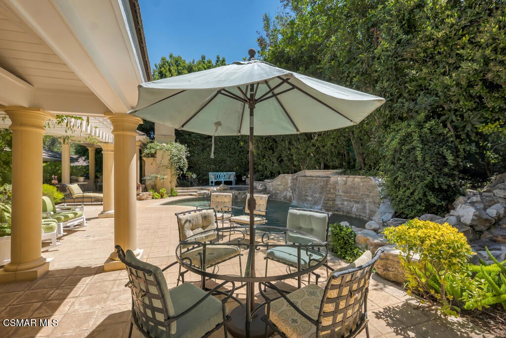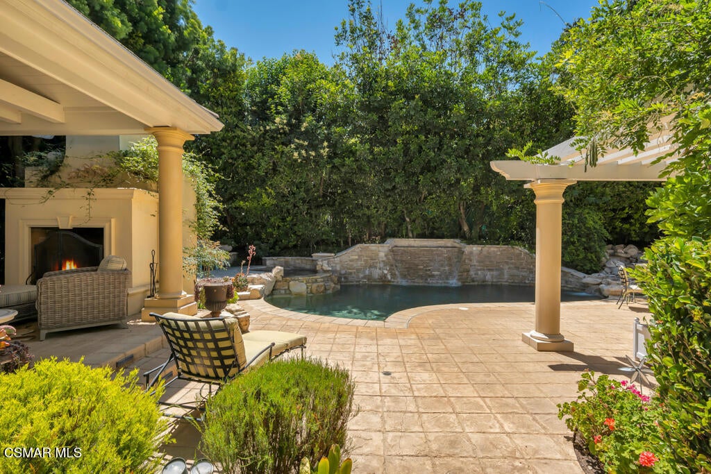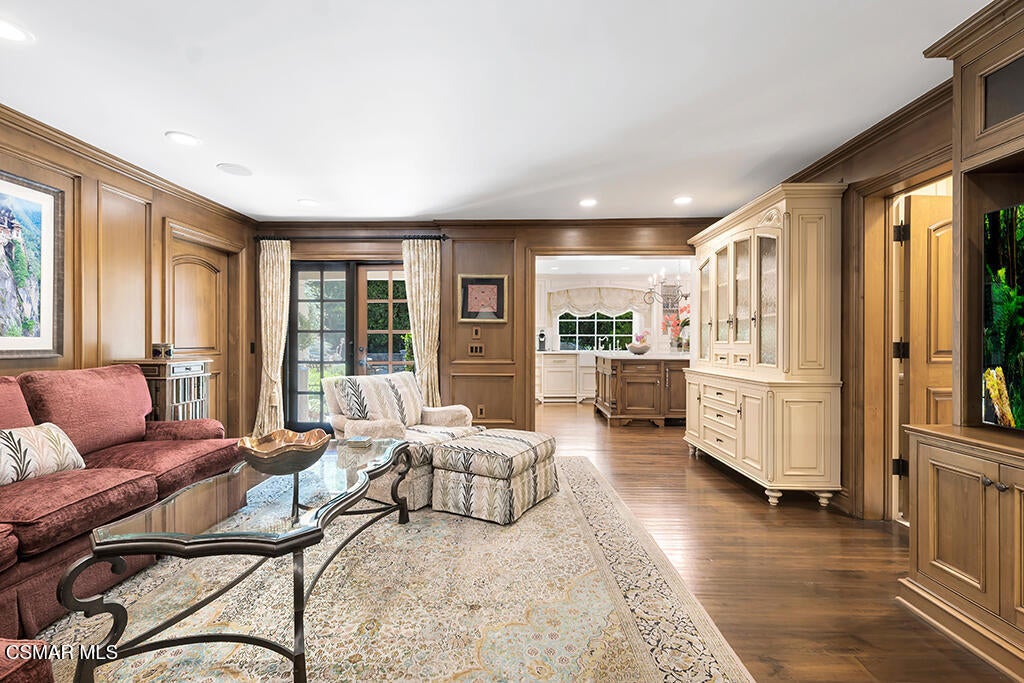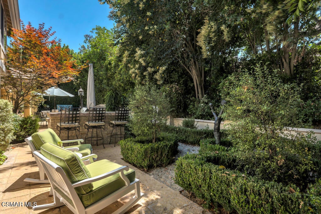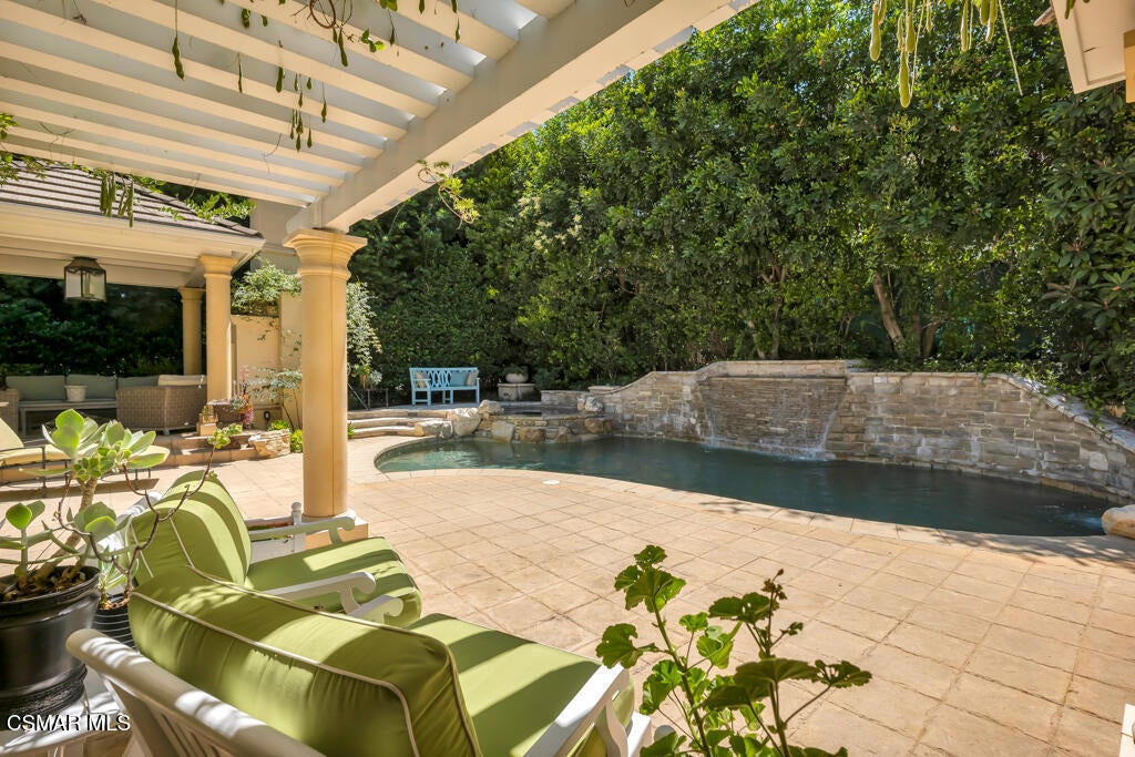 This is the ONE! EXCEPTIONAL QUALITY IN NORTH RANCH: If you value fine craftsmanship, timeless design, and attention to detail, this exquisite North Ranch estate is for you. No expense was spared in the construction and design of this traditional masterpiece executed with refined taste and top-tier materials throughout.A dramatic two-story foyer and custom-crafted staircase set the tone upon entry. Gorgeous walnut floors run throughout most of the home, complemented by designer carpeting and extensive use of classic white Carrara marble. The chef's kitchen is a true showpiece, featuring rich wainscoting, intricate custom millwork, top-of-the-line gourmet appliances, a walk-in pantry, and French doors that open to the backyard.The flexible floor plan offers two inviting family rooms one of which could serve as a spacious bonus room. Throughout the home you'll find stunning hand-hewn beams, floor-to-ceiling wainscoting, and bespoke cabinetry. An impressive oak-paneled office with detailed wall and ceiling treatments provides an ideal work-from-home setting.The luxurious primary suite offers a peaceful retreat, complete with a cozy fireplace, an elegant marble bathroom with a steam shower, and a fully customized walk-in closet. Upstairs are three additional bedrooms and two beautifully appointed bathrooms.Outside, the private, wooded yard is an entertainer's dream, with a pebble-finish pool, spa, and cascading waterfall. A covered loggia with fireplace, a built-in BBQ island, and bar seating create the perfect outdoor living and dining spaces.Additional features include a 4-car tandem garage, plus fully payed for 34 panel solar system that reduces huge cost to almost nothing. All on an incredible lush tree lined lot with such a sense of privacy.A rare offering in the heart of prestigious North Ranch uncompromising in quality, and rich in character.