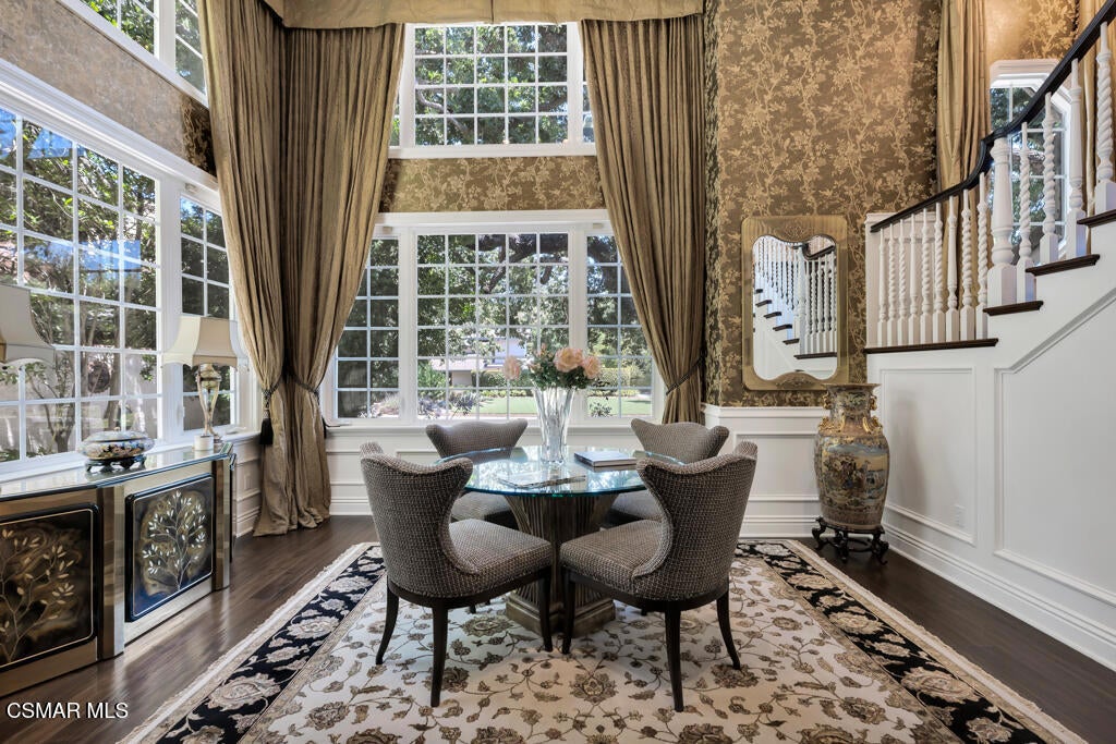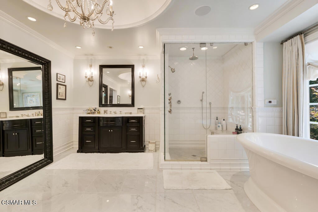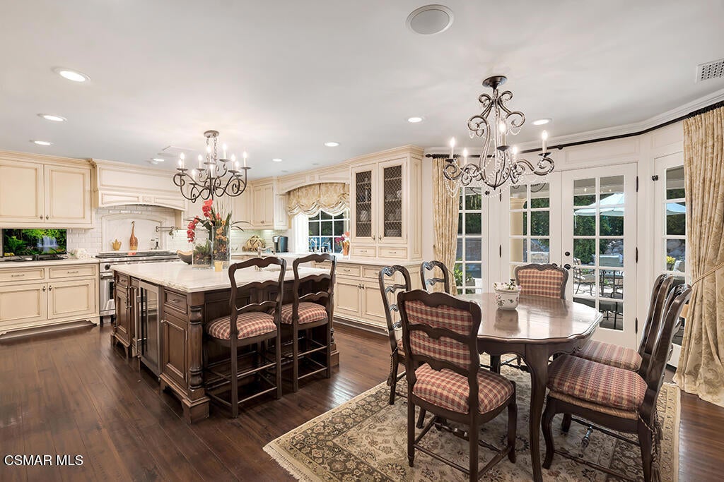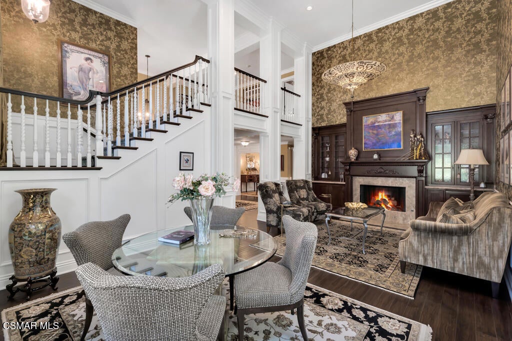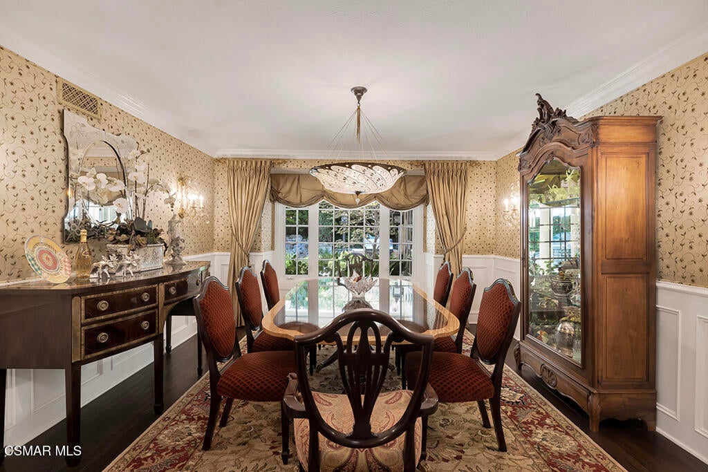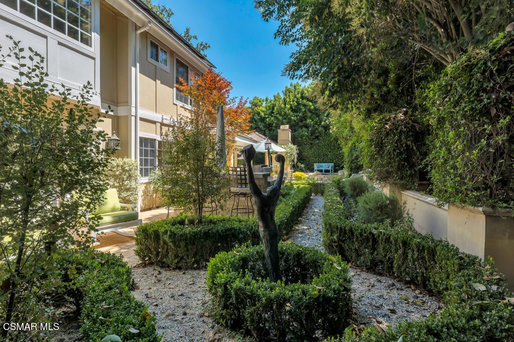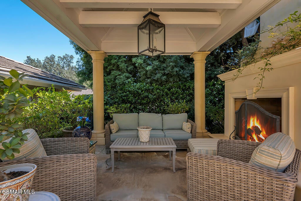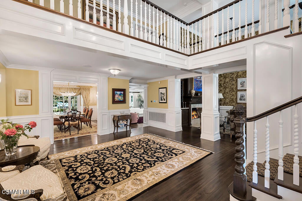 This is the ONE! EXCEPTIONAL QUALITY IN NORTH RANCH: If you value fine craftsmanship, timeless design, and attention to detail, this exquisite North Ranch estate is for you. No expense was spared in the construction and design of this traditional masterpiece executed with refined taste and top-tier materials throughout.A dramatic two-story foyer and custom-crafted staircase set the tone upon entry. Gorgeous walnut floors run throughout most of the home, complemented by designer carpeting and extensive use of classic white Carrara marble. The chef's kitchen is a true showpiece, featuring rich wainscoting, intricate custom millwork, top-of-the-line gourmet appliances, a walk-in pantry, and French doors that open to the backyard.The flexible floor plan offers two inviting family rooms one of which could serve as a spacious bonus room. Throughout the home you'll find stunning hand-hewn beams, floor-to-ceiling wainscoting, and bespoke cabinetry. An impressive oak-paneled office with detailed wall and ceiling treatments provides an ideal work-from-home setting.The luxurious primary suite offers a peaceful retreat, complete with a cozy fireplace, an elegant marble bathroom with a steam shower, and a fully customized walk-in closet. Upstairs are three additional bedrooms and two beautifully appointed bathrooms.Outside, the private, wooded yard is an entertainer's dream, with a pebble-finish pool, spa, and cascading waterfall. A covered loggia with fireplace, a built-in BBQ island, and bar seating create the perfect outdoor living and dining spaces.Additional features include a 4-car tandem garage, plus fully payed for 34 panel solar system that reduces huge cost to almost nothing. All on an incredible lush tree lined lot with such a sense of privacy.A rare offering in the heart of prestigious North Ranch uncompromising in quality, and rich in character.
