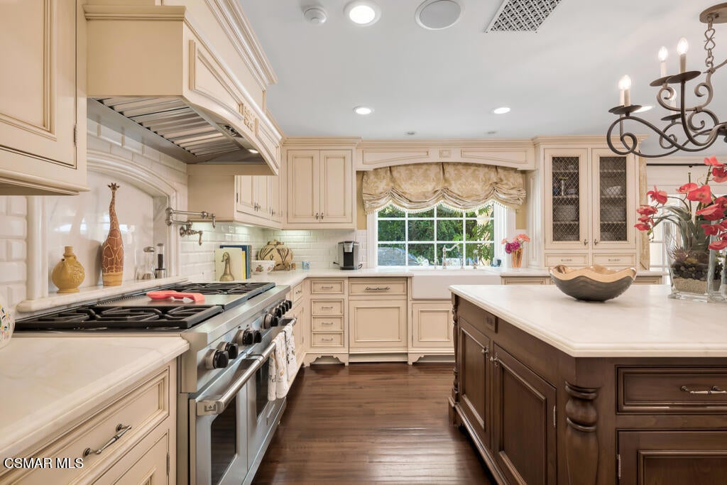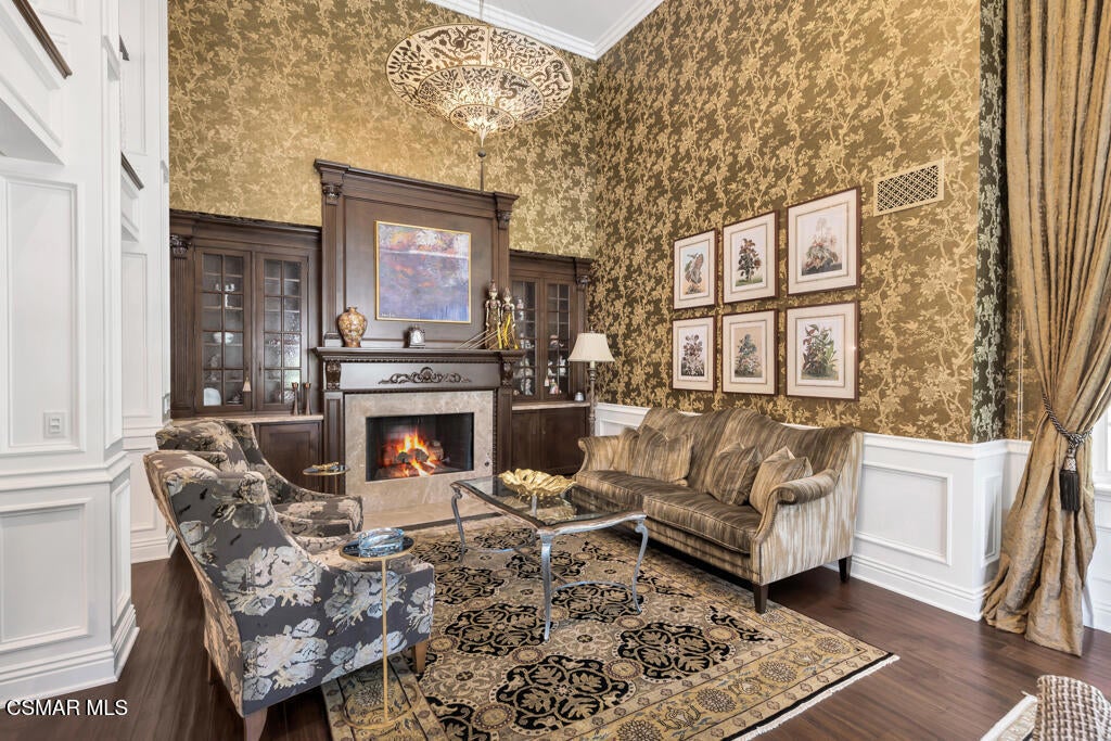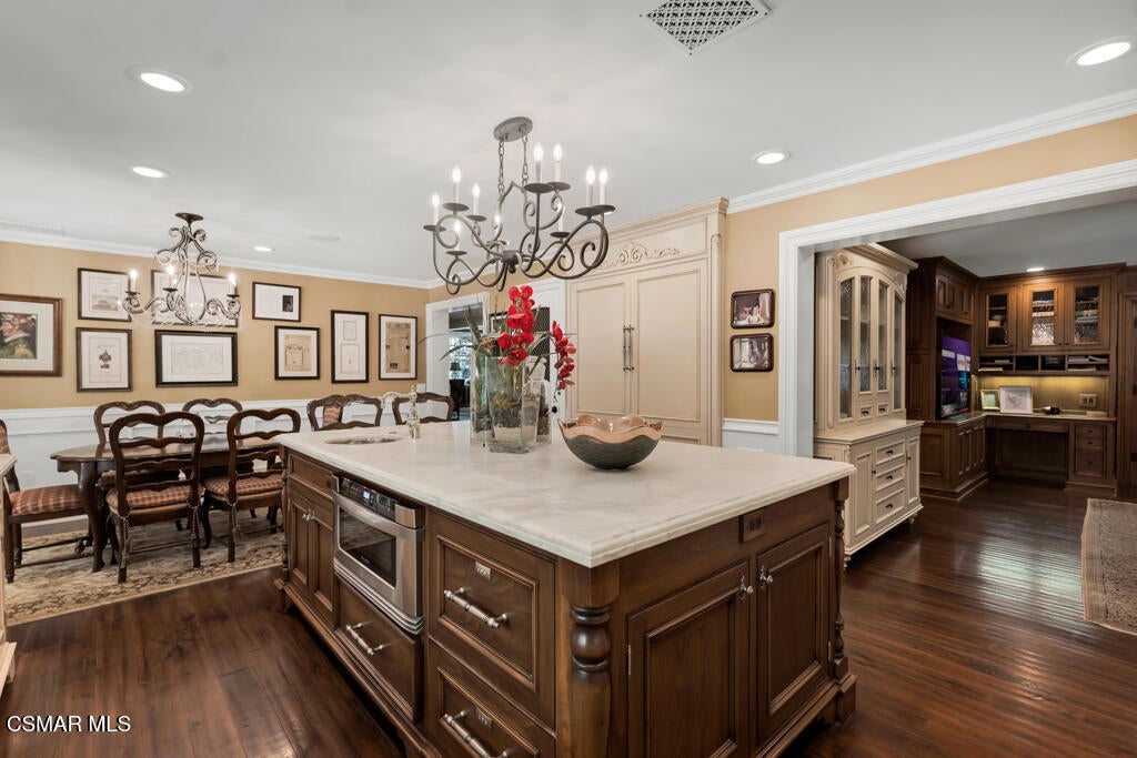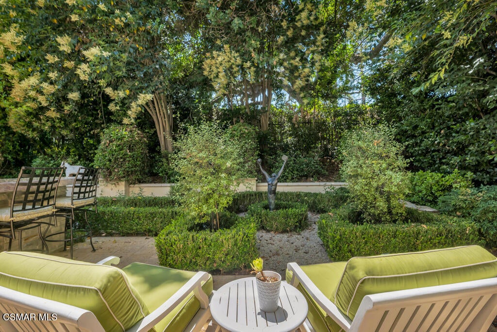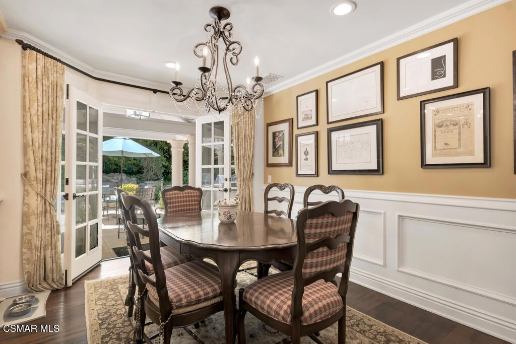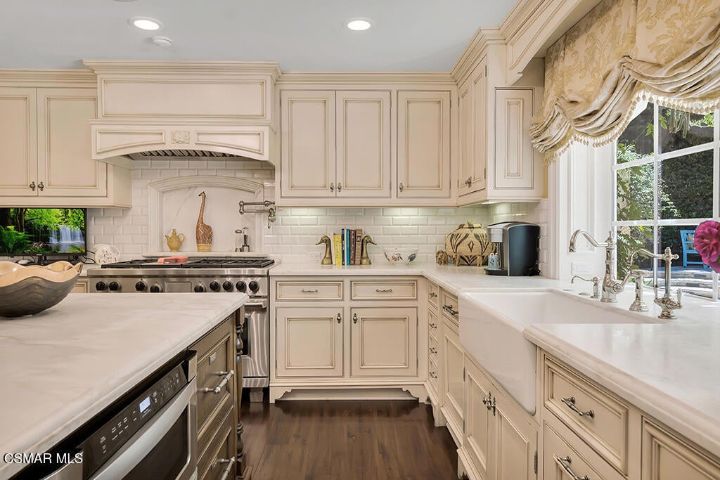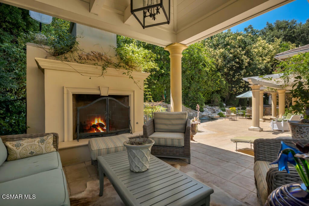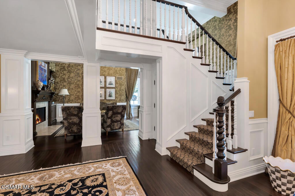 This is the ONE! EXCEPTIONAL QUALITY IN NORTH RANCH: If you value fine craftsmanship, timeless design, and attention to detail, this exquisite North Ranch estate is for you. No expense was spared in the construction and design of this traditional masterpiece executed with refined taste and top-tier materials throughout.A dramatic two-story foyer and custom-crafted staircase set the tone upon entry. Gorgeous walnut floors run throughout most of the home, complemented by designer carpeting and extensive use of classic white Carrara marble. The chef's kitchen is a true showpiece, featuring rich wainscoting, intricate custom millwork, top-of-the-line gourmet appliances, a walk-in pantry, and French doors that open to the backyard.The flexible floor plan offers two inviting family rooms one of which could serve as a spacious bonus room. Throughout the home you'll find stunning hand-hewn beams, floor-to-ceiling wainscoting, and bespoke cabinetry. An impressive oak-paneled office with detailed wall and ceiling treatments provides an ideal work-from-home setting.The luxurious primary suite offers a peaceful retreat, complete with a cozy fireplace, an elegant marble bathroom with a steam shower, and a fully customized walk-in closet. Upstairs are three additional bedrooms and two beautifully appointed bathrooms.Outside, the private, wooded yard is an entertainer's dream, with a pebble-finish pool, spa, and cascading waterfall. A covered loggia with fireplace, a built-in BBQ island, and bar seating create the perfect outdoor living and dining spaces.Additional features include a 4-car tandem garage, plus fully payed for 34 panel solar system that reduces huge cost to almost nothing. All on an incredible lush tree lined lot with such a sense of privacy.A rare offering in the heart of prestigious North Ranch uncompromising in quality, and rich in character.