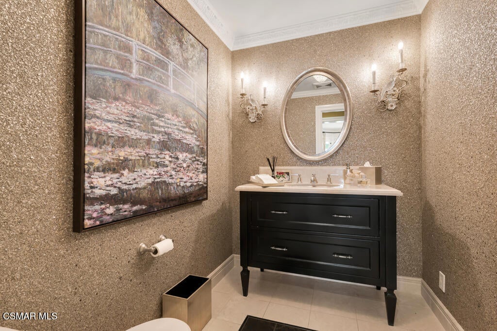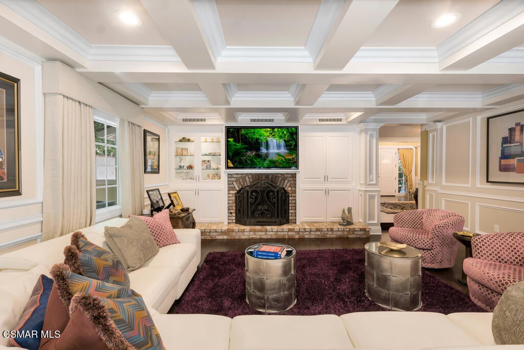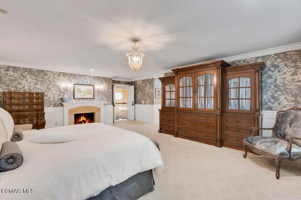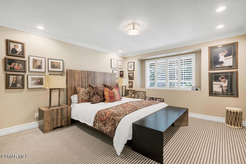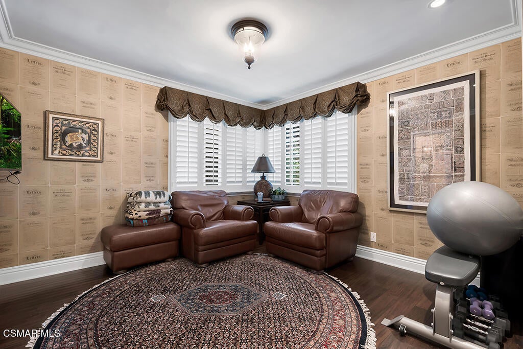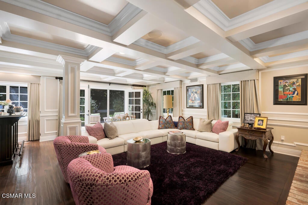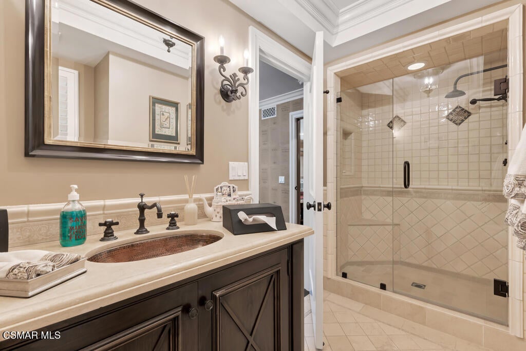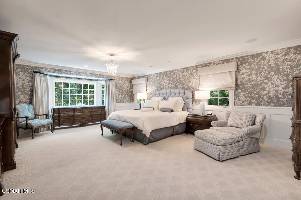 This is the ONE! EXCEPTIONAL QUALITY IN NORTH RANCH: If you value fine craftsmanship, timeless design, and attention to detail, this exquisite North Ranch estate is for you. No expense was spared in the construction and design of this traditional masterpiece executed with refined taste and top-tier materials throughout.A dramatic two-story foyer and custom-crafted staircase set the tone upon entry. Gorgeous walnut floors run throughout most of the home, complemented by designer carpeting and extensive use of classic white Carrara marble. The chef's kitchen is a true showpiece, featuring rich wainscoting, intricate custom millwork, top-of-the-line gourmet appliances, a walk-in pantry, and French doors that open to the backyard.The flexible floor plan offers two inviting family rooms one of which could serve as a spacious bonus room. Throughout the home you'll find stunning hand-hewn beams, floor-to-ceiling wainscoting, and bespoke cabinetry. An impressive oak-paneled office with detailed wall and ceiling treatments provides an ideal work-from-home setting.The luxurious primary suite offers a peaceful retreat, complete with a cozy fireplace, an elegant marble bathroom with a steam shower, and a fully customized walk-in closet. Upstairs are three additional bedrooms and two beautifully appointed bathrooms.Outside, the private, wooded yard is an entertainer's dream, with a pebble-finish pool, spa, and cascading waterfall. A covered loggia with fireplace, a built-in BBQ island, and bar seating create the perfect outdoor living and dining spaces.Additional features include a 4-car tandem garage, plus fully payed for 34 panel solar system that reduces huge cost to almost nothing. All on an incredible lush tree lined lot with such a sense of privacy.A rare offering in the heart of prestigious North Ranch uncompromising in quality, and rich in character.