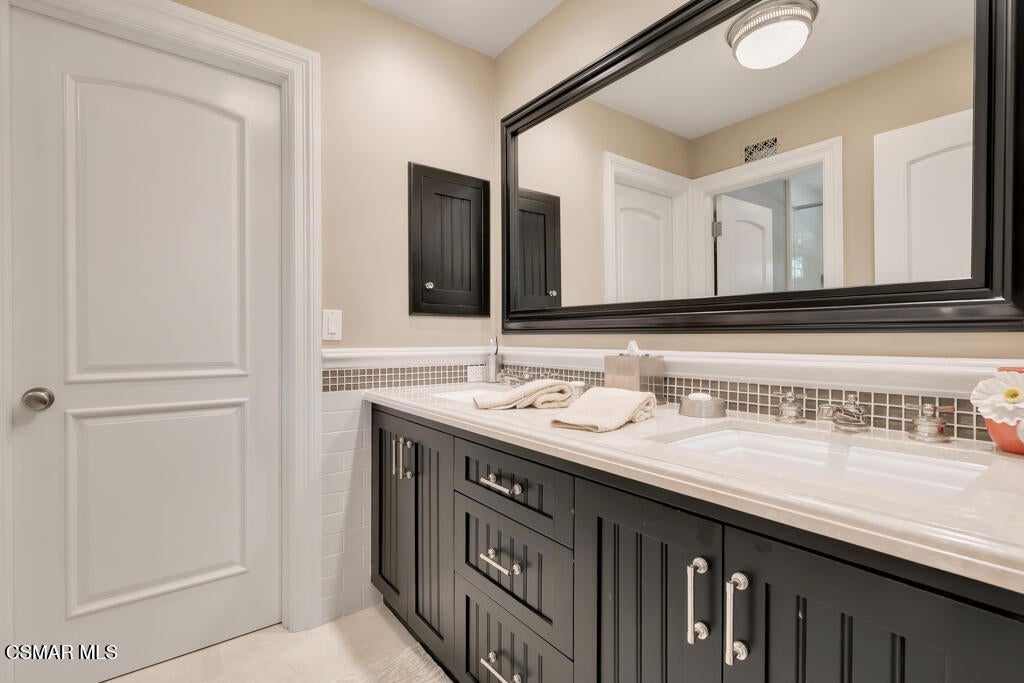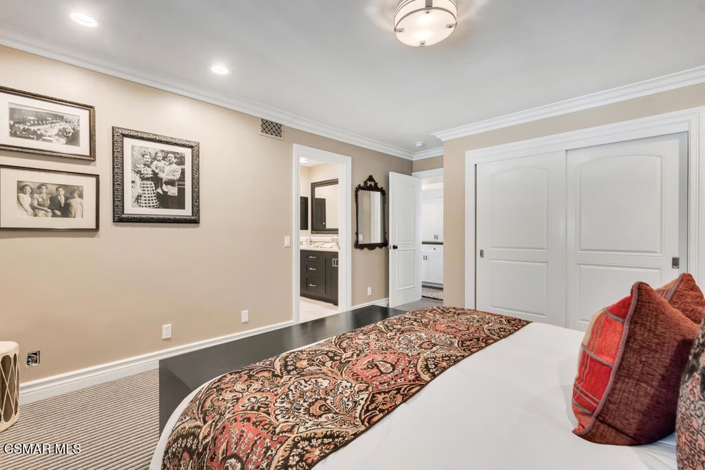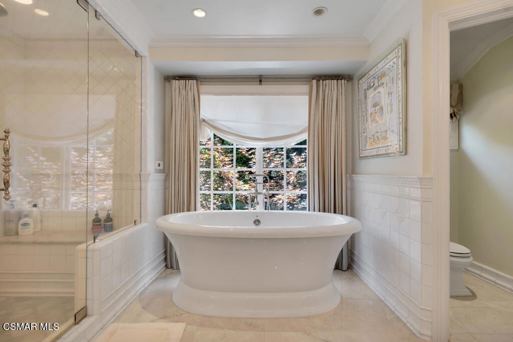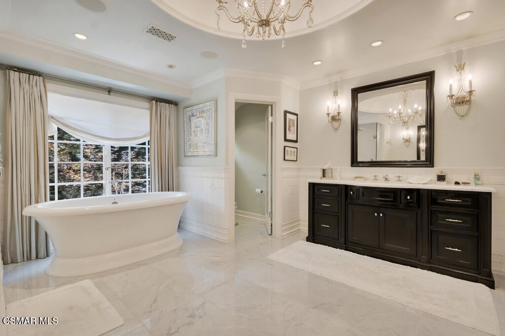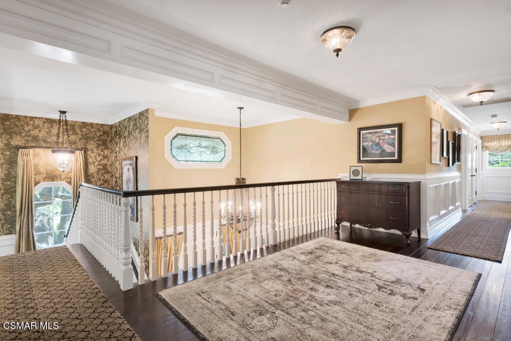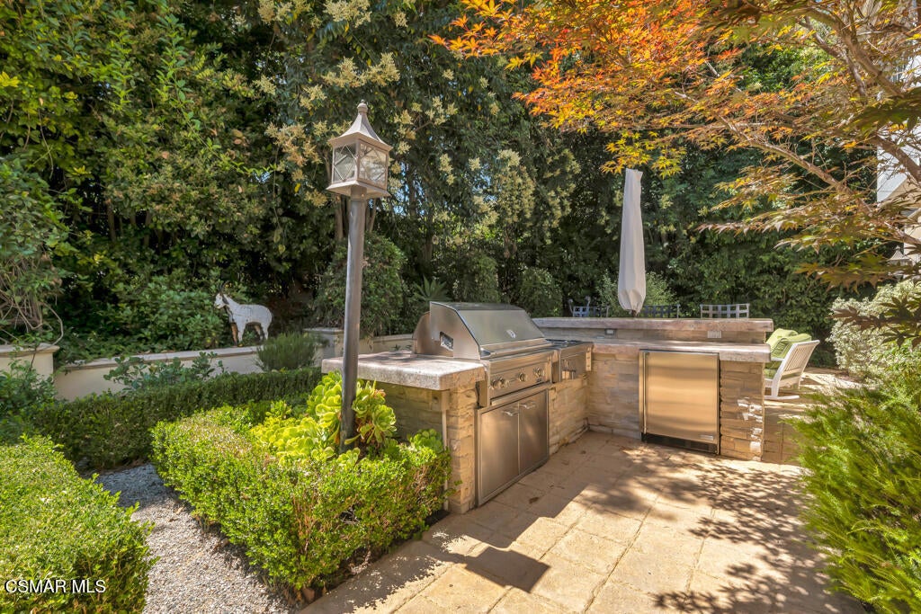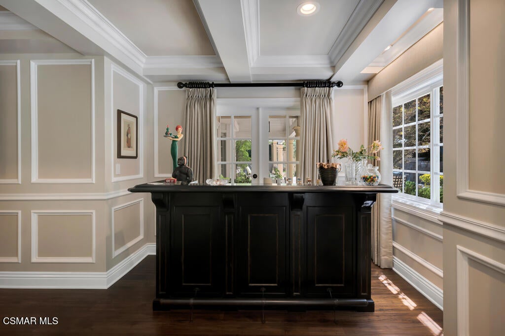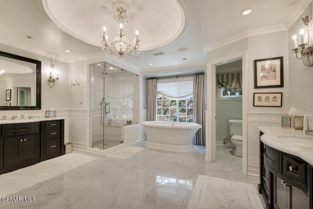 This is the ONE! EXCEPTIONAL QUALITY IN NORTH RANCH: If you value fine craftsmanship, timeless design, and attention to detail, this exquisite North Ranch estate is for you. No expense was spared in the construction and design of this traditional masterpiece executed with refined taste and top-tier materials throughout.A dramatic two-story foyer and custom-crafted staircase set the tone upon entry. Gorgeous walnut floors run throughout most of the home, complemented by designer carpeting and extensive use of classic white Carrara marble. The chef's kitchen is a true showpiece, featuring rich wainscoting, intricate custom millwork, top-of-the-line gourmet appliances, a walk-in pantry, and French doors that open to the backyard.The flexible floor plan offers two inviting family rooms one of which could serve as a spacious bonus room. Throughout the home you'll find stunning hand-hewn beams, floor-to-ceiling wainscoting, and bespoke cabinetry. An impressive oak-paneled office with detailed wall and ceiling treatments provides an ideal work-from-home setting.The luxurious primary suite offers a peaceful retreat, complete with a cozy fireplace, an elegant marble bathroom with a steam shower, and a fully customized walk-in closet. Upstairs are three additional bedrooms and two beautifully appointed bathrooms.Outside, the private, wooded yard is an entertainer's dream, with a pebble-finish pool, spa, and cascading waterfall. A covered loggia with fireplace, a built-in BBQ island, and bar seating create the perfect outdoor living and dining spaces.Additional features include a 4-car tandem garage, plus fully payed for 34 panel solar system that reduces huge cost to almost nothing. All on an incredible lush tree lined lot with such a sense of privacy.A rare offering in the heart of prestigious North Ranch uncompromising in quality, and rich in character.