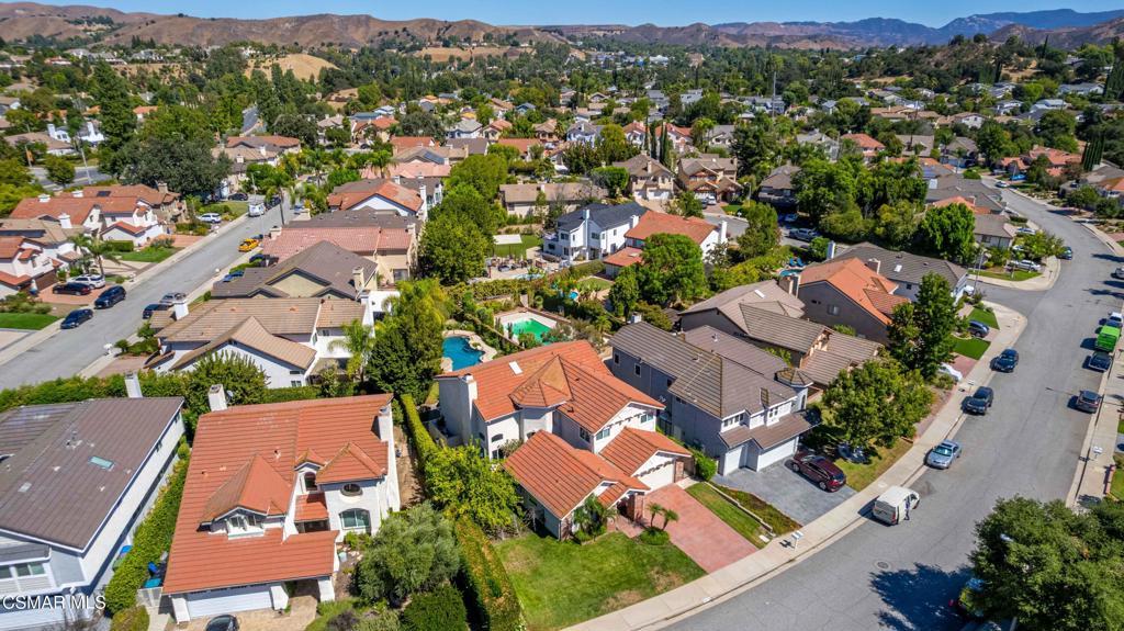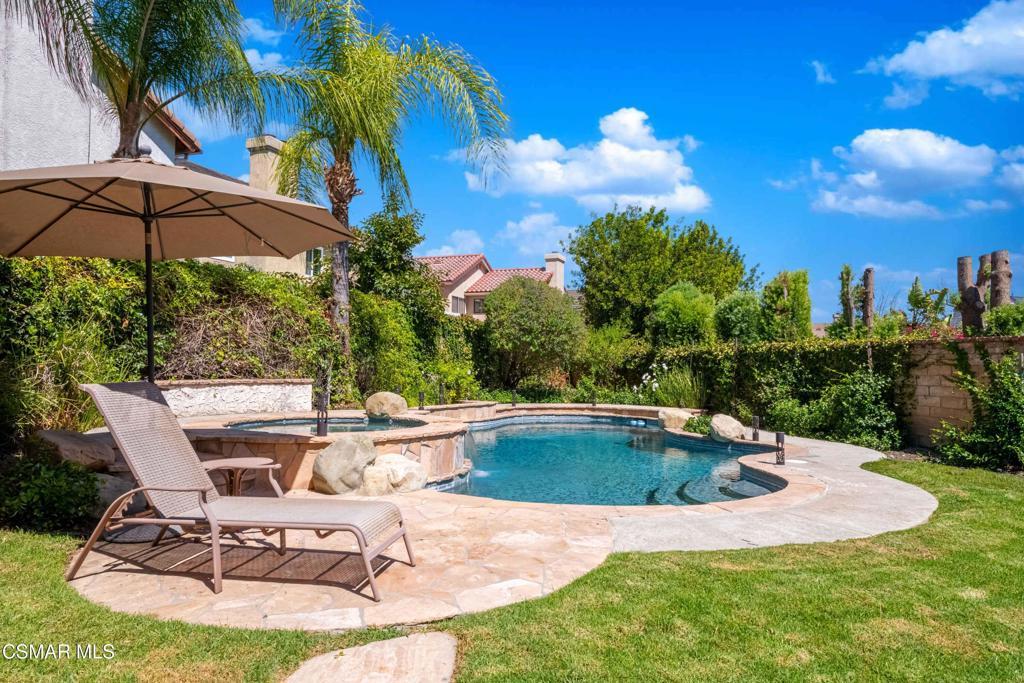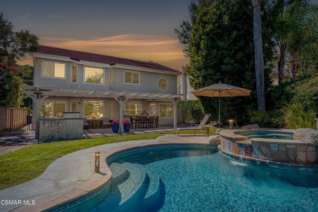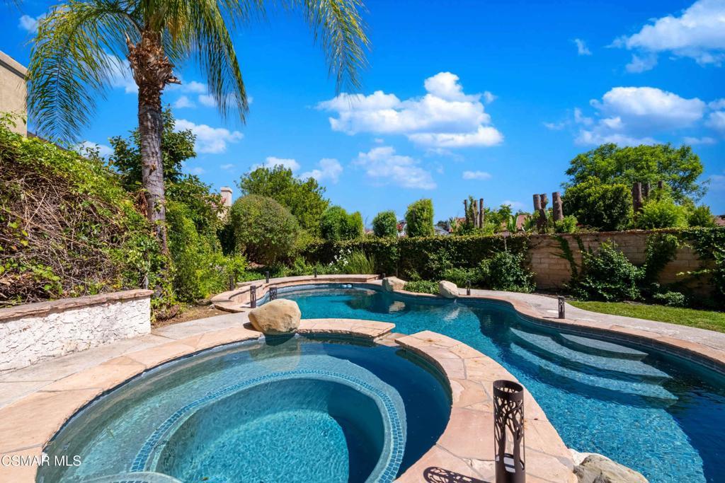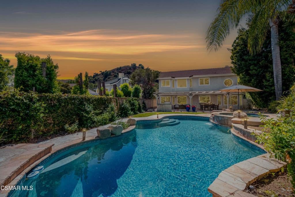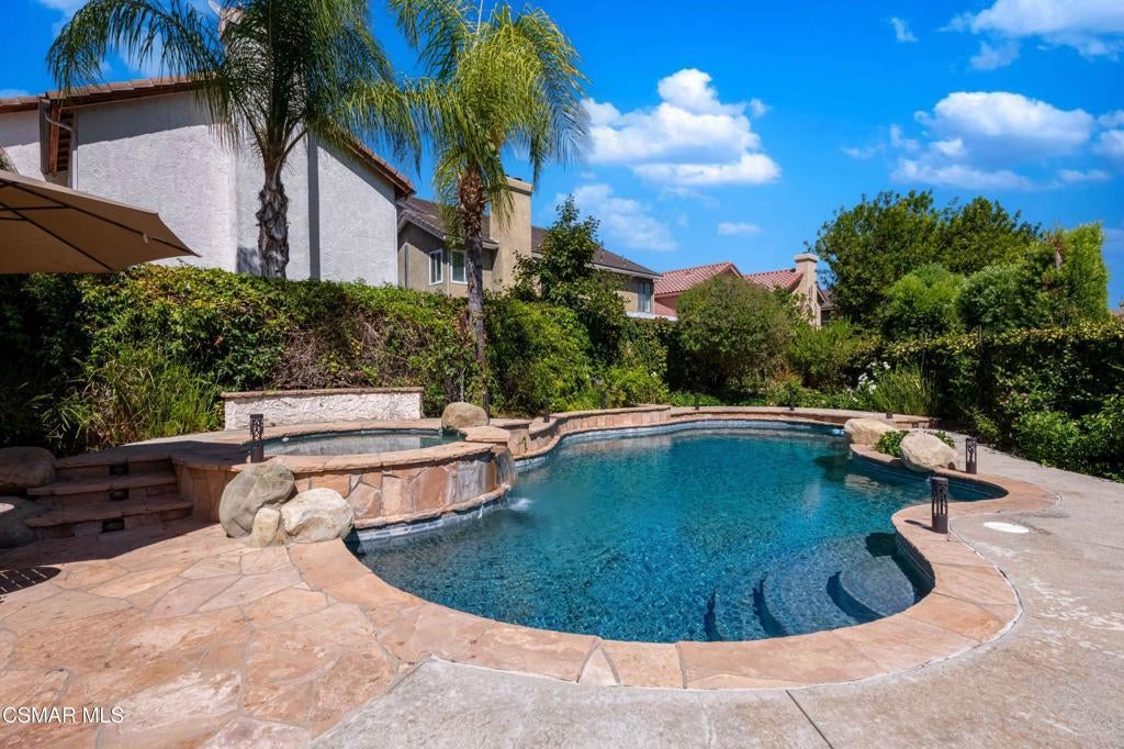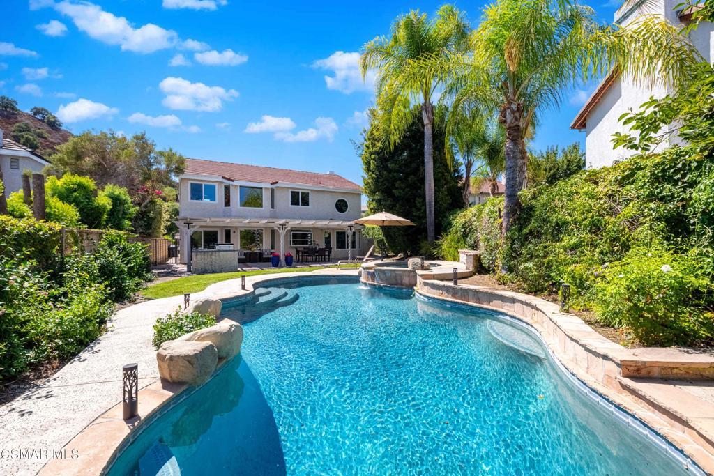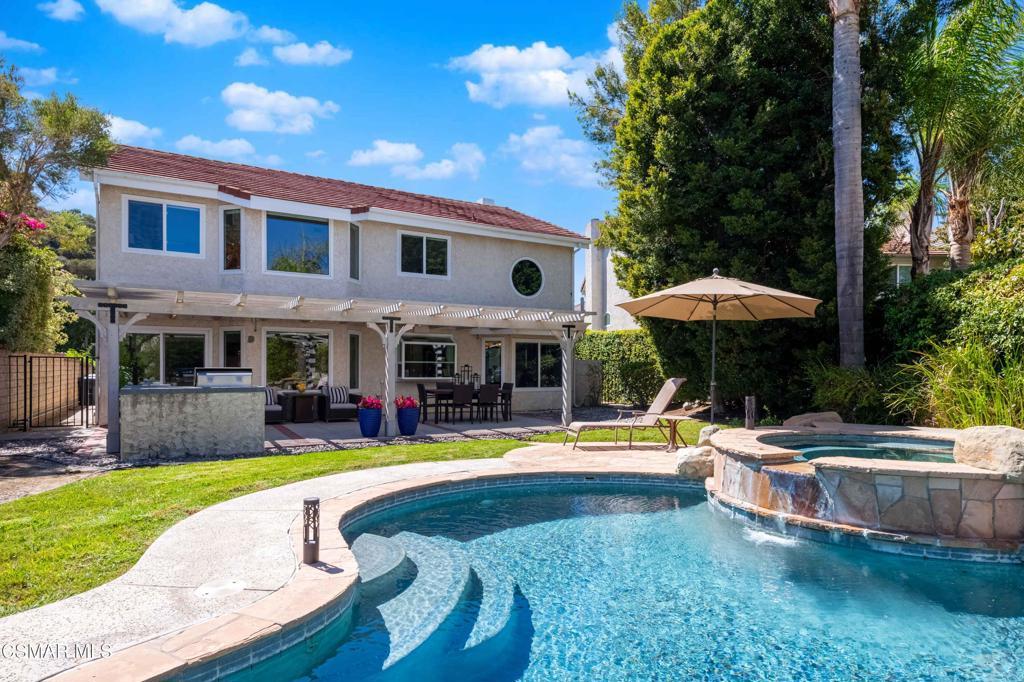 Welcome to 5676 Walnut Ridge Dr in the heart of Agoura Hills - a rare opportunity to own a luxurious and spacious entertainer's home with nearly 2,900 sq. ft. of living space, 5 bedrooms and 4 bathrooms, designed for comfort, style, and resort style living! Fabulous interior location in highly desirable Chateau Springs surrounded by gorgeous mountain views. Striking entryway with soaring cathedral-ceiling foyer that opens to a bright, airy, and spacious open floor plan. The main residence features a stunning remodeled kitchen complete with newer appliances, quartz countertops, cooking range with stone accent, breakfast bar and bay window that overlooks the sparkling pool and spa. Formal dining, family and living room, wine fridge, downstairs bedroom, full bath and laundry. Upstairs, the double-door entry primary suite offers the ultimate in luxury and comfort, with a sitting/entertaining area with custom bookshelves, en-suite bath, spacious closet. and pool and mountain views! Two additional upstairs bedrooms and hall bath provide flexible space for family or office needs. The fifth bedroom is a charming, detached in-law suite casita, complete with its own full bedroom and bath - perfect for guests, extended family, or possible rental income. A rare find indeed! The backyard is a resort-like tropical oasis, with a sparkling pool, spa, lush queen palms, patio and bbq for entertaining, landscaped privacy wall, and vibrant greenery. The charming courtyard and side yard at entry features mature mandarin and lemon trees, brick and stone accents, and a breezeway that creates a cozy, secluded vibe. Picture windows throughout the home invite the outdoors in, framing peek-a-boo mountain views. Newer roof, plenty of parking. Close to beaches, excellent schools, shopping, parks, entertainment and hiking trails. This highly unique property is rarely on the market ! Don't miss this chance to call Walnut Ridge your home!