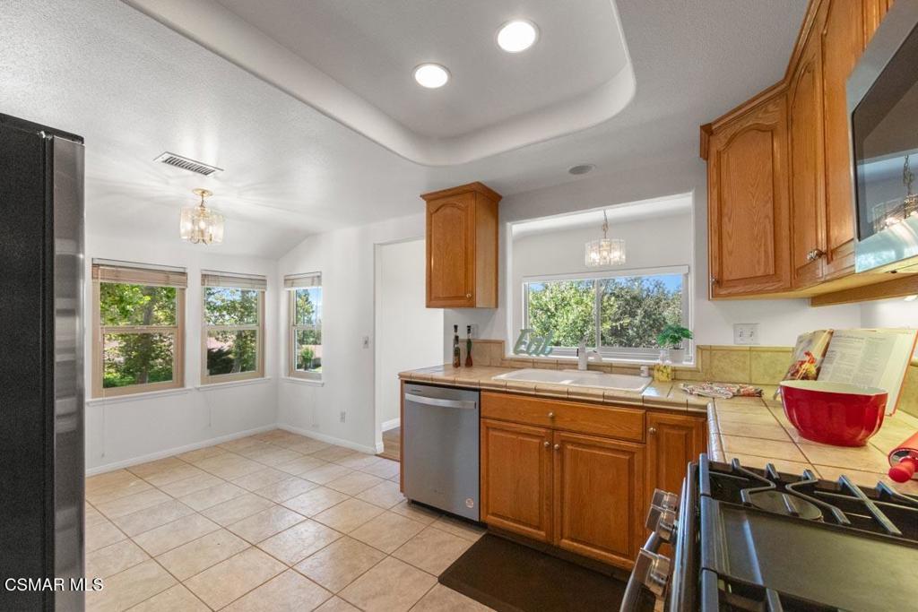 This 4 bedroom 3 bath home is located in an ideal Oak Park location on a small shaded private cul-de-sac. This home boasts over 2100 square feet of living space with a versatile floorplan. The layout is ideal for single story living. There is a large living room overlooking a wonderful open view of the surrounding hills and mountains. The living room is perfect for entertaining with its wonderful views and fireplace or used as a family room as it opens to the kitchen and dining area. The eat-in kitchen is good sized with plenty of cabinet and counter space space and has a pantry as well as an efficient desk/work station. The primary suite is just off this area with its spacious bath that includes a double sink vanity, step-in shower and large jetted tub that also enjoys the same wonderful mountain views. There are two other bedrooms that share a full-sized bath on this level. Downstairs is the perfect retreat featuring a bonus room perfect for entertaining or a home office. This room also enjoys a fireplace and a sliding door leading to a walk out patio with green space and beyond. Also downstairs you will find an additional bedroom and full bath. This home has wonderful views from the recently replaced energy efficient windows! There is a two-car direct access garage with a new overhead door, automatic opener, built-in cabinets and laundry hook-up. Excellent location minutes from shopping, restaurants entertainment, recreation and award-winning schools.