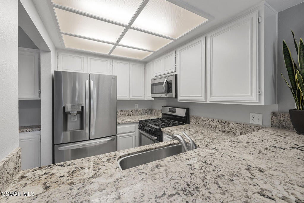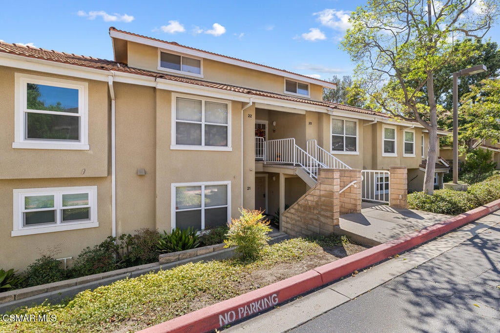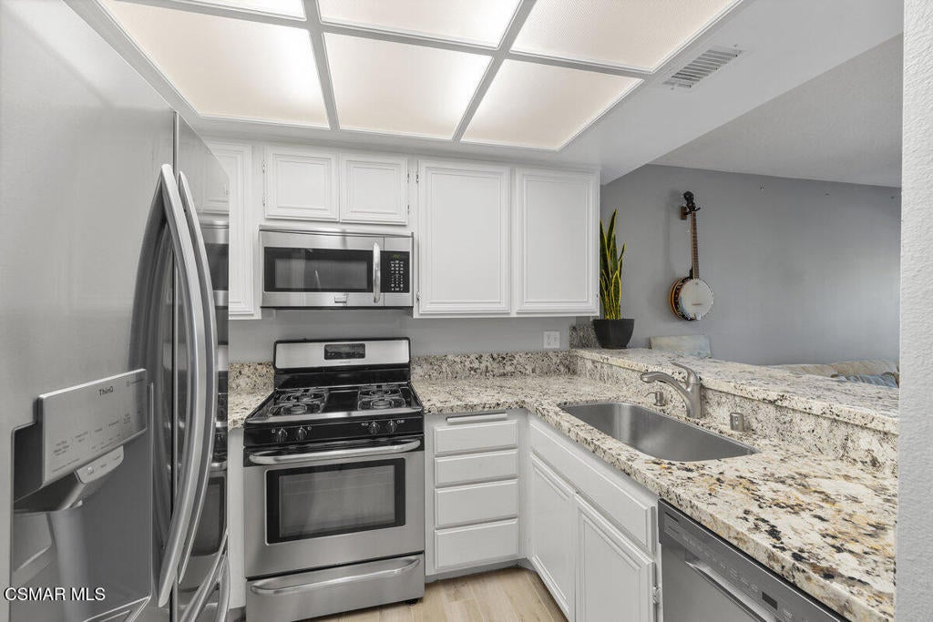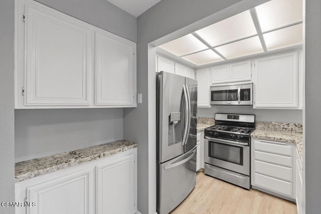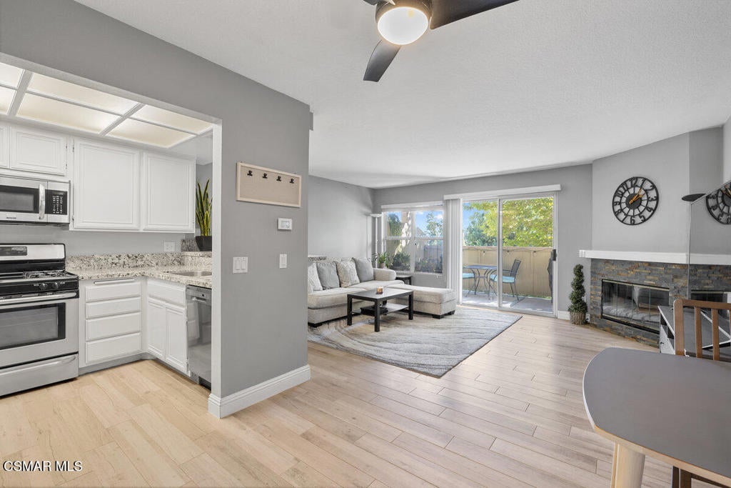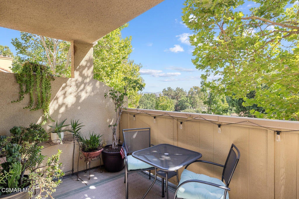 Nestled in the Simi Valley Hills, this lower unit condo has views of the Valley. Perfect for First Time Buyers, or Downsizing. Single Level Unit, Upgraded throughout, with beautiful neutral wood-like flooring, granite counters, stainless appliances, custom stone fireplace, stacked washer/dryer, upgraded bath with shower/tub and granite counter sink. The living room leads to a lovely balcony, to enjoy the view. Gated complex, separate garage has storage and easy access.