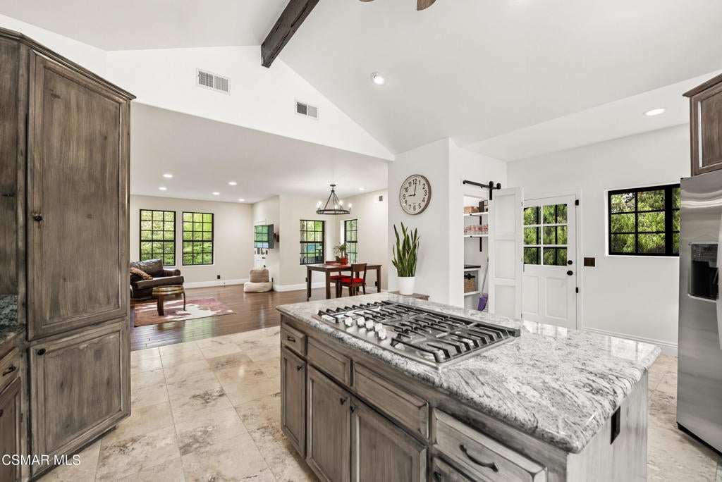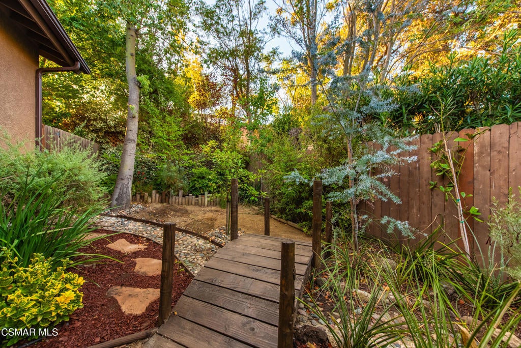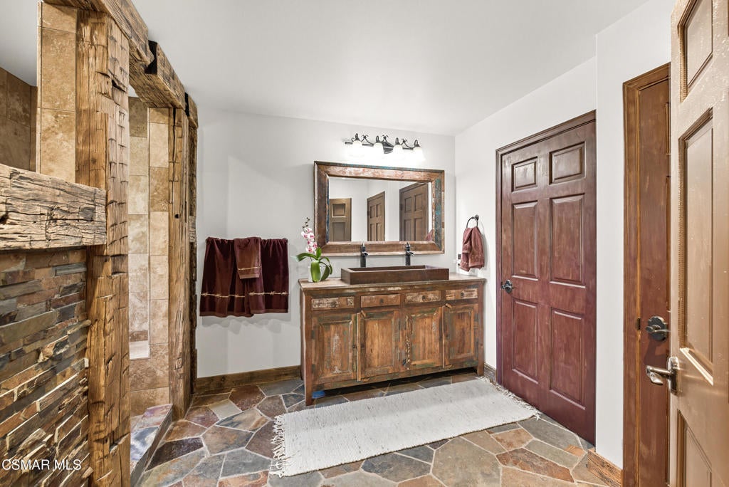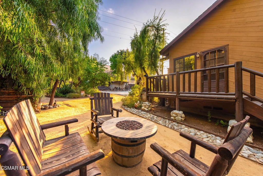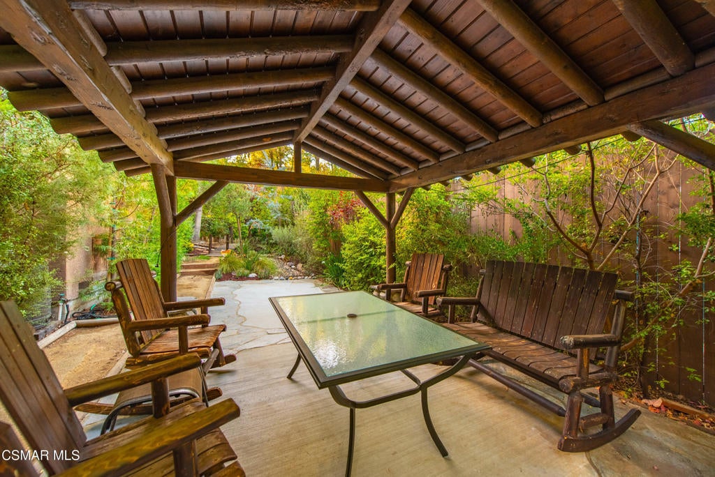 Nestled in Agoura Hills, this custom single-story home offers a rare blend of rustic modern style and serene country living. Set against sweeping views, the property is thoughtfully designed with lush landscaping, privacy, and chicken coops--perfect for those seeking both comfort and connection to nature. Inside, soaring ceilings and a light-filled living room create an open and inviting atmosphere. The kitchen features a central island, stainless steel appliances, and seamless flow for entertaining. The primary suite is a retreat of its own, boasting high ceilings and a spa-like bathroom with striking stack-stone walls and rich wood finishes. Additional baths include a spacious dual-vanity hall bath with a tub/shower combo, convenient full bath off the garage, plus a large half bath for guests. Outdoors, a sprawling pergola sets the stage for dining and entertaining, surrounded by mature landscaping that enhances privacy and beauty. A finished garage adds versatility for storage or creative use. This property is the ideal balance of modern comfort and rustic charm in a sought-after Agoura Hills setting.