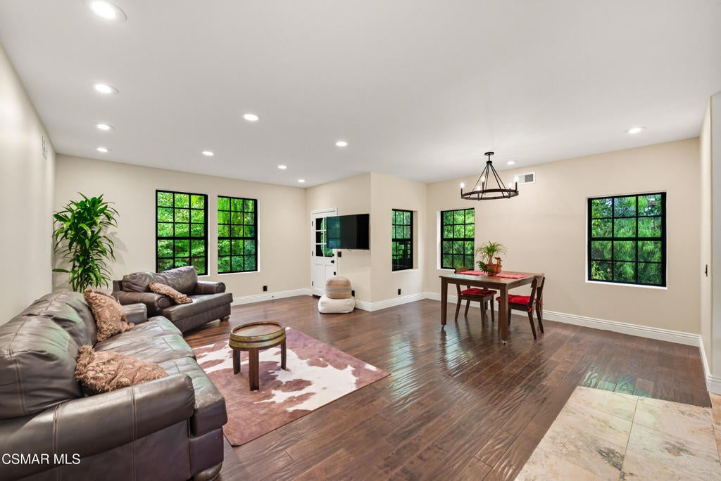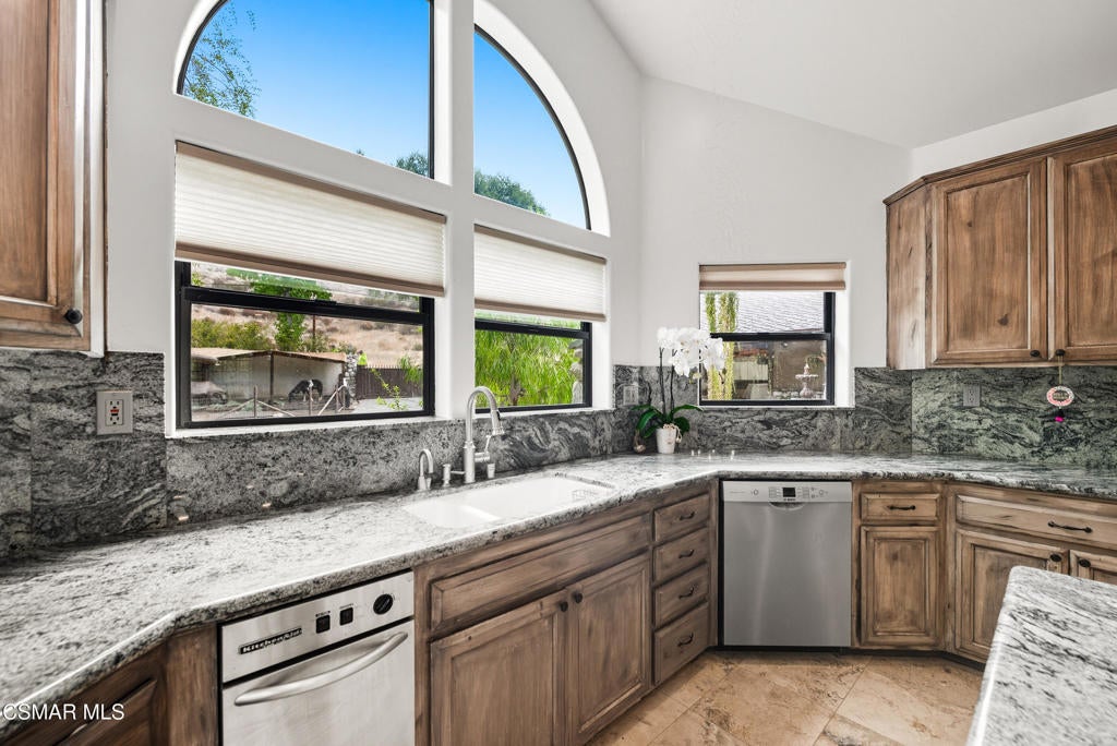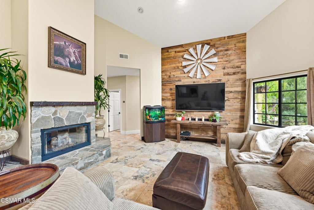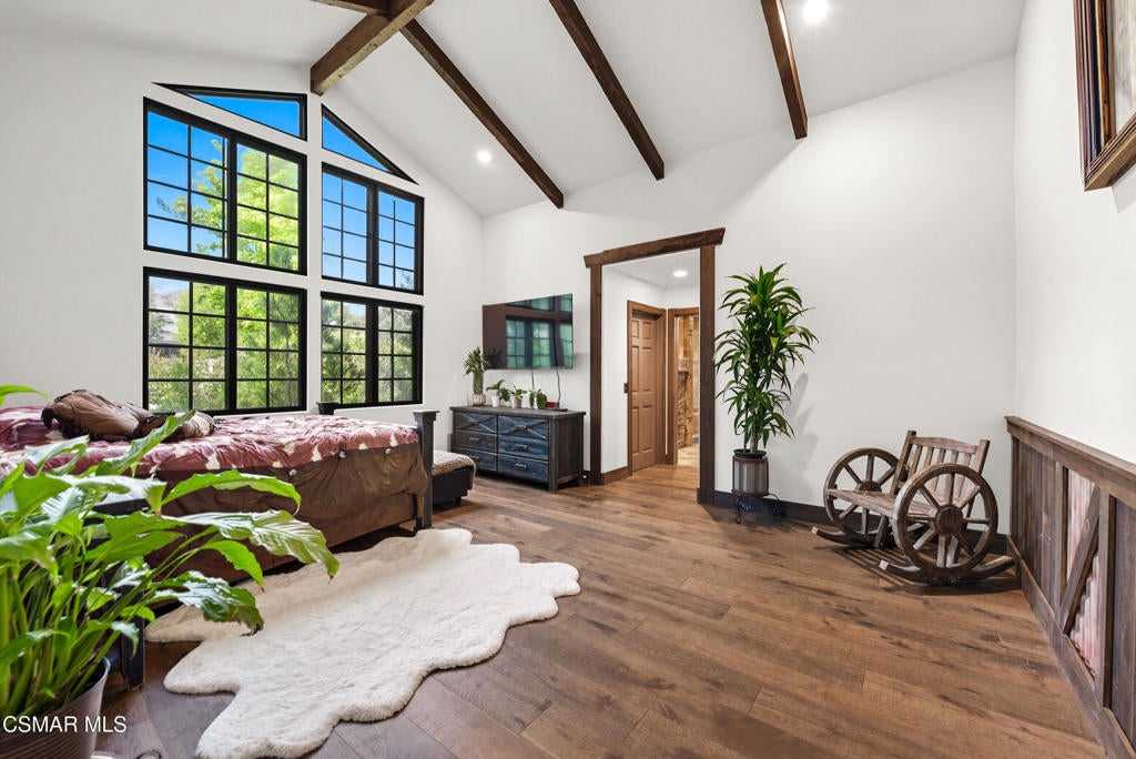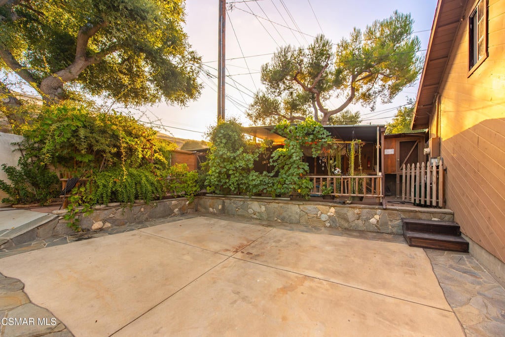 Nestled in Agoura Hills, this custom single-story home offers a rare blend of rustic modern style and serene country living. Set against sweeping views, the property is thoughtfully designed with lush landscaping, privacy, and chicken coops--perfect for those seeking both comfort and connection to nature. Inside, soaring ceilings and a light-filled living room create an open and inviting atmosphere. The kitchen features a central island, stainless steel appliances, and seamless flow for entertaining. The primary suite is a retreat of its own, boasting high ceilings and a spa-like bathroom with striking stack-stone walls and rich wood finishes. Additional baths include a spacious dual-vanity hall bath with a tub/shower combo, convenient full bath off the garage, plus a large half bath for guests. Outdoors, a sprawling pergola sets the stage for dining and entertaining, surrounded by mature landscaping that enhances privacy and beauty. A finished garage adds versatility for storage or creative use. This property is the ideal balance of modern comfort and rustic charm in a sought-after Agoura Hills setting.
