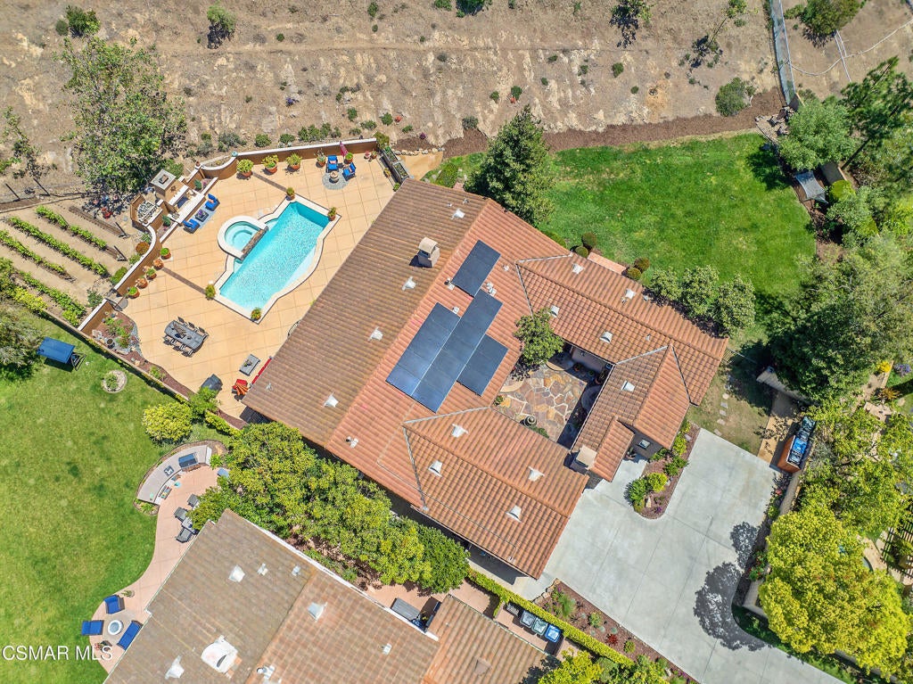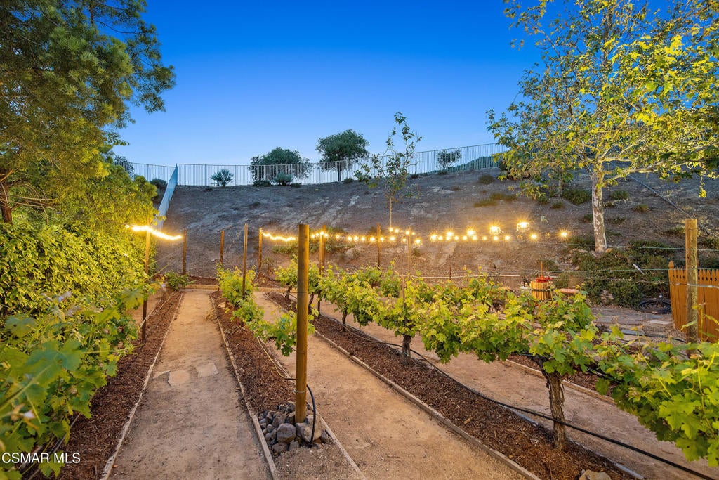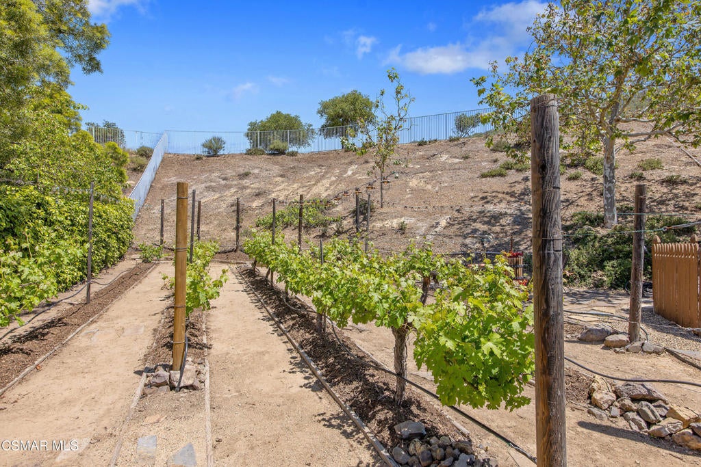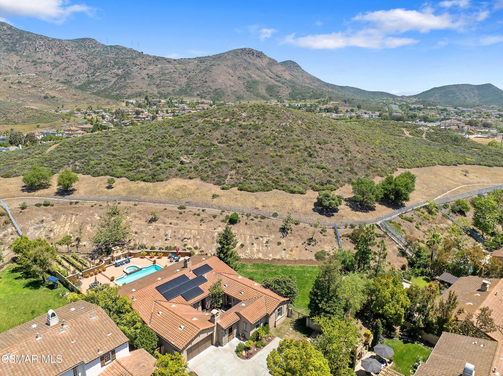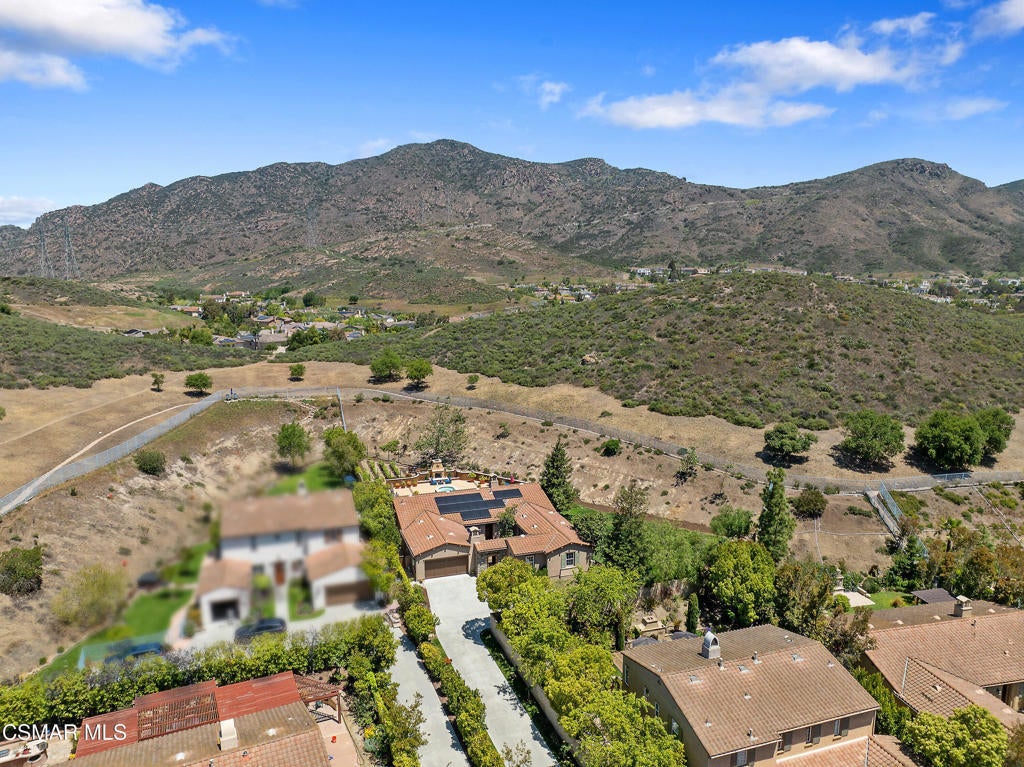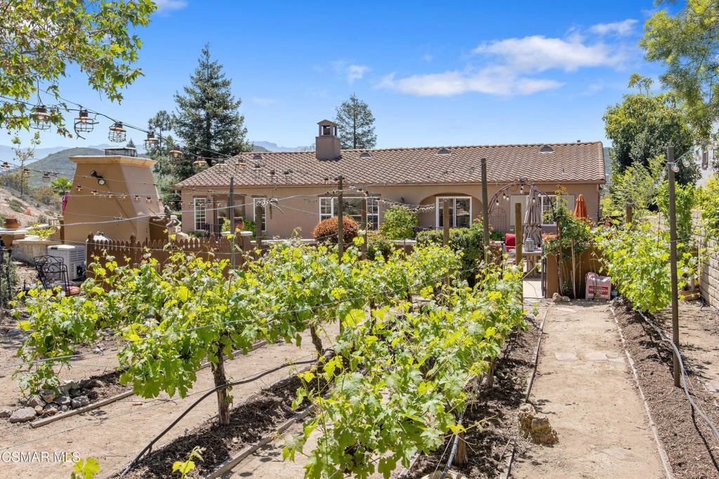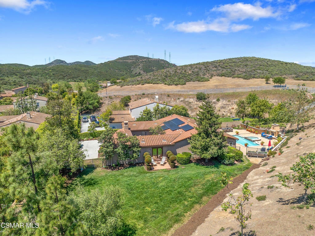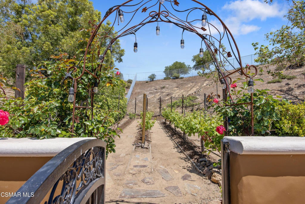 Exclusive courtyard single-story residence offering an extraordinary blend of casual luxury, privacy, and craftsmanship. Set on a premier elevated flag lot with a private vineyard and backing to peaceful open space, the property is a true sanctuary--perfectly positioned to capture sweeping mountain vistas and coastal breezes. A custom distressed wood and wrought iron entry door sets the tone for the rich architectural detail. A flagstone courtyard with lush landscaping and a tranquil fountain provides an elegant first impression. Inside, timeless design meets modern sophistication with hand-finished hardwood flooring throughout the main living areas of the home, smooth coat walls and ceilings, and artisan wrought iron light fixtures that add character and warmth. The chef's kitchen is fully customized with stainless steel appliances, tailored cabinetry, large island, breakfast area, walk-in pantry and kitchen office space. This flows seamlessly into open-concept living space with picture window, fireplace and vaulted ceiling, perfect for both relaxed living and stylish entertaining. Enter through wide sweeping arches into the inviting dining room with vaulted ceilings and distinctive wood designed floors. The secluded primary bedroom is a true retreat offering vaulted ceilings, French doors, and primary bath with dual vanity, soaking tub, spacious shower and custom walk-in closet. The hallway leading to the secondary bedrooms and several of the bedrooms have French doors for an abundance of natural light and coastal breeze. The separated secondary bedrooms boast pavers, wood blinds and spacious closets. Outside, the sprawling private yard is nothing short of exceptional--featuring a magnificent pool and spa, an outdoor fireplace, and your own private vineyard. The vineyard has been meticulously maintained and manicured to achieve the best possible grape production. The expansive lawn area framed with majestic redwood trees, offers views of the surrounding mountains, natural beauty and open space. Whether hosting guests or enjoying a quiet sunset, this setting offers a truly elevated outdoor experience. The former 4-car tandem garage is now a 2-car garage and converted media room, creating 3,000 + sqft of living space. The recently installed solar panels increase the desired energy independence. Additional highlights include, individual laundry room with utility sink, powder room, garage epoxy floors and built-in storage. The property is close to award winning schools, terrific parks and incredible hiking and biking trails. Experience and enjoy this truly unique and special property.