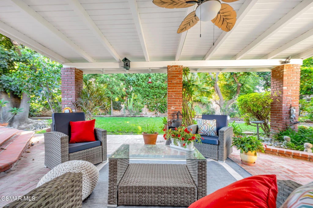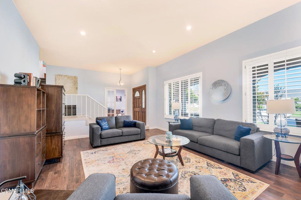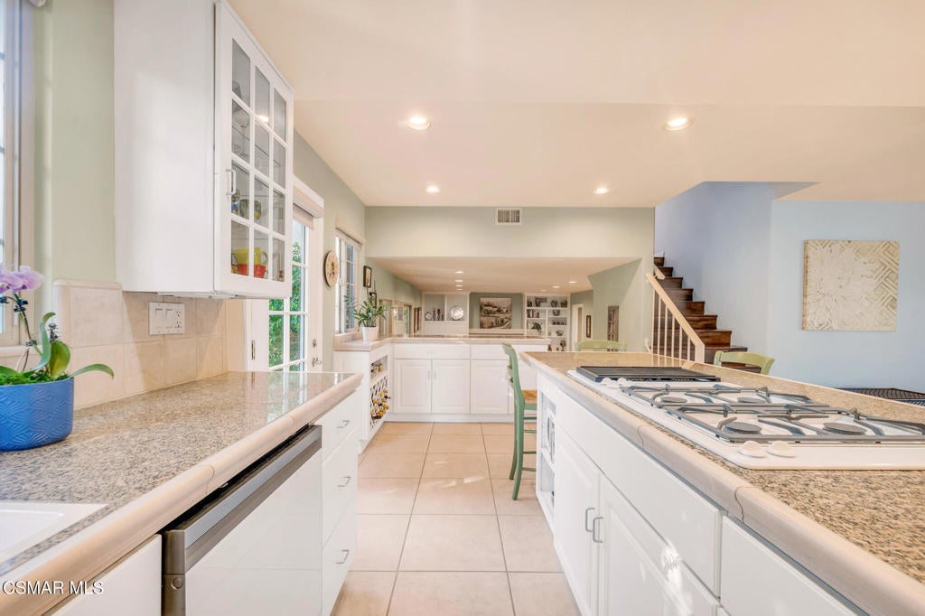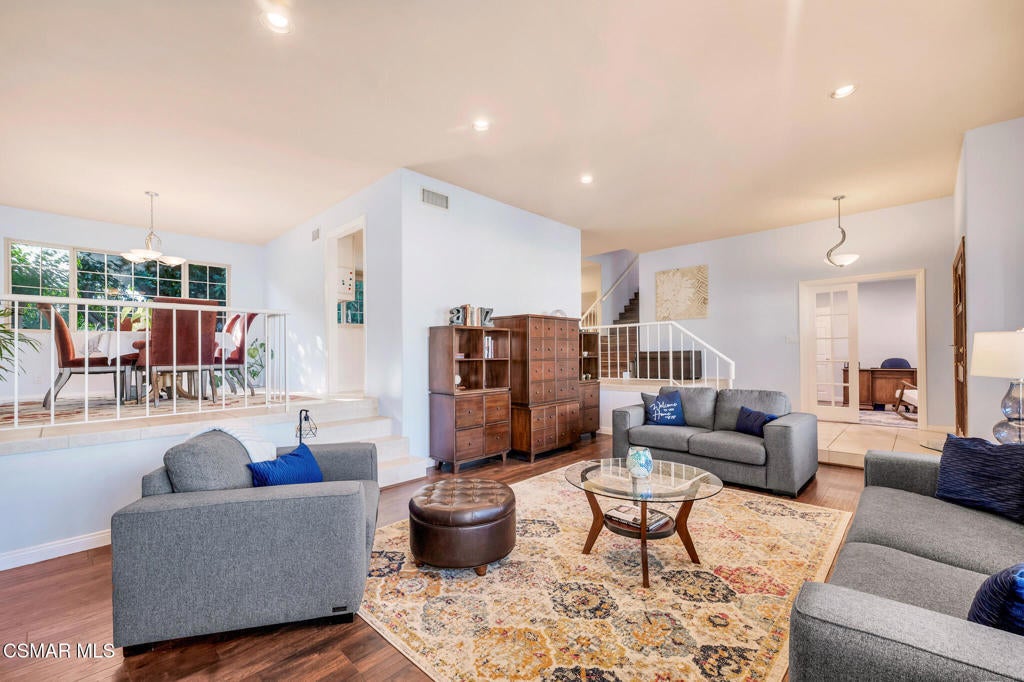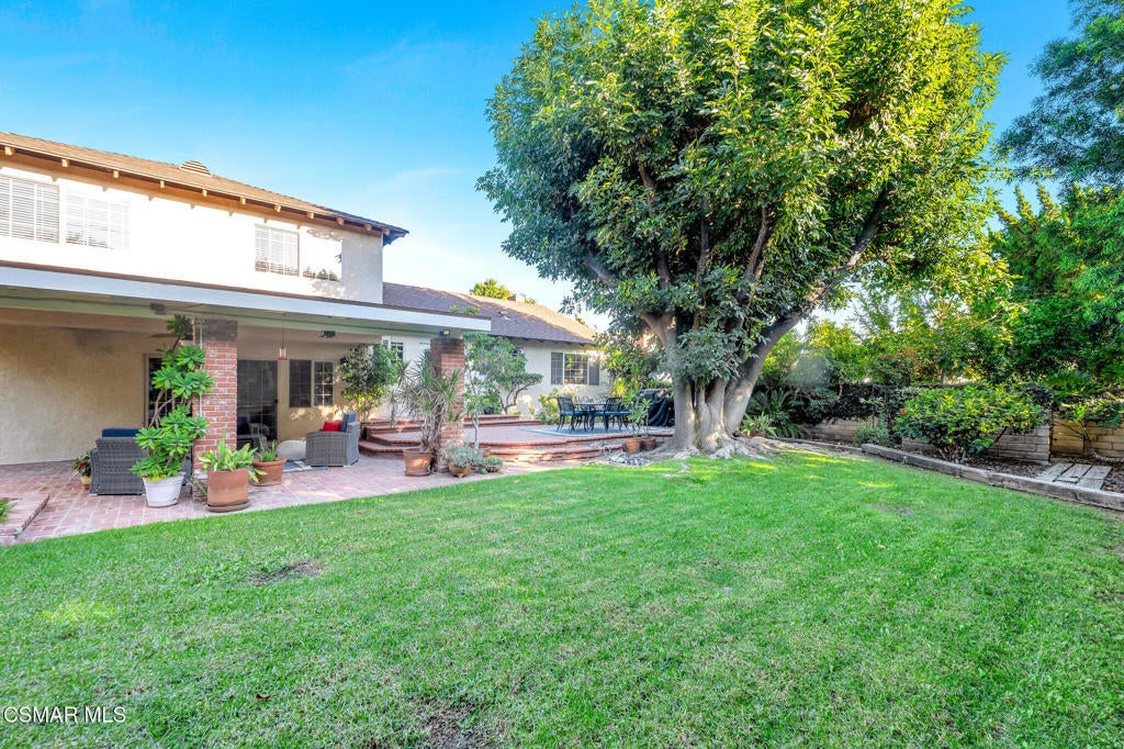 Beautifully maintained and rich with character, this 5-bedroom, 3-bath Fountainwood home offers approximately 2,535 sq. ft. of living space on an 8,712 sq. ft. lot with a 3-car garage. Blending comfort, style, and functionality, it's ideally situated in one of North Central Simi Valley's most established neighborhoods. Curb appeal shines with a brick-lined driveway and walkway, lush green landscaping, and a full covered front porch with a sitting area--perfect for morning coffee or evening relaxation. Inside, you'll find bright, inviting interiors with neutral-toned walls, plantation shutters, and recessed lighting in many rooms. The tri-level floor plan flows seamlessly from a sunken living room with a stacked-stone fireplace to an elegant dining room highlighted by a chandelier and natural light. The home offers two downstairs bedrooms, including one that is currently set up as a home office with glass French doors, built-ins, and dual entry points--providing flexibility for guests, extended family, or work-from-home needs. The thoughtfully designed and updated kitchen showcases white cabinetry, granite-tiled counters, and a generous island with a gas cooktop and grill, convenient storage niches, and sitting space at one end. Display-glass cabinets, double ovens, a built-in refrigerator, recessed lighting, tile flooring, and a built-in wine rack with adjoining breakfast area make this kitchen a centerpiece for gatherings. A few steps down from the kitchen, the spacious family room offers a second fireplace, built-ins, a wet bar, and a large sliding door leading to the backyard. This lower level also features a bathroom with a shower and a laundry room with garage access for added convenience. Upstairs, two secondary bedrooms share an updated hall bath with built-ins and decorative tile finishes, while the private primary suite features a walk-in closet and a luxurious en suite bath with a corner soaking tub, decorative tile surround, and a curved glass-enclosed shower with a Kohler body-spa system. The home is equipped with a dual air-conditioning system--one unit for the lower level and another for upstairs--with separate zones for the primary suite and the two secondary bedrooms, providing efficient and customizable comfort throughout. The private, lush backyard feels like an outdoor sanctuary--complete with mature shade trees, two brick patio areas (one beneath a shade tree and another fully covered with a ceiling fan and brick columns), a flower-filled fountain, raised brick planters, roses, and fruit trees. With its open layout and relaxing ambiance, this space is ideal for entertaining or peaceful outdoor enjoyment. Ideally located in the highly regarded Fountainwood neighborhood, this home is conveniently near local elementary and middle schools, community parks, recreation, shopping, and dining--capturing the best of North Central Simi Valley living with a welcoming sense of home and community.