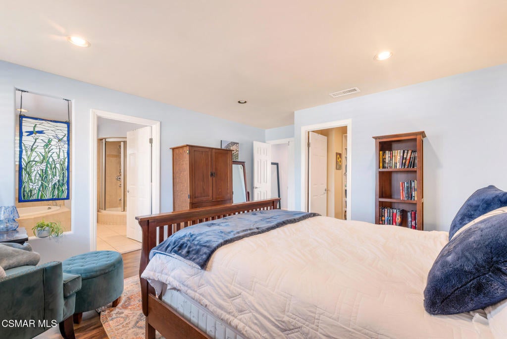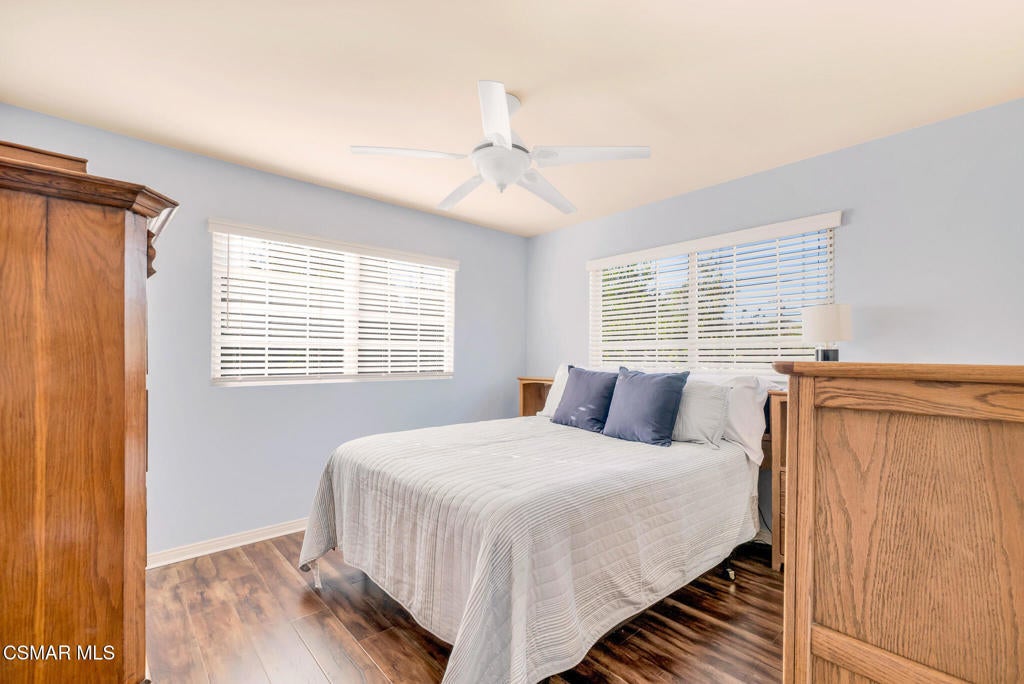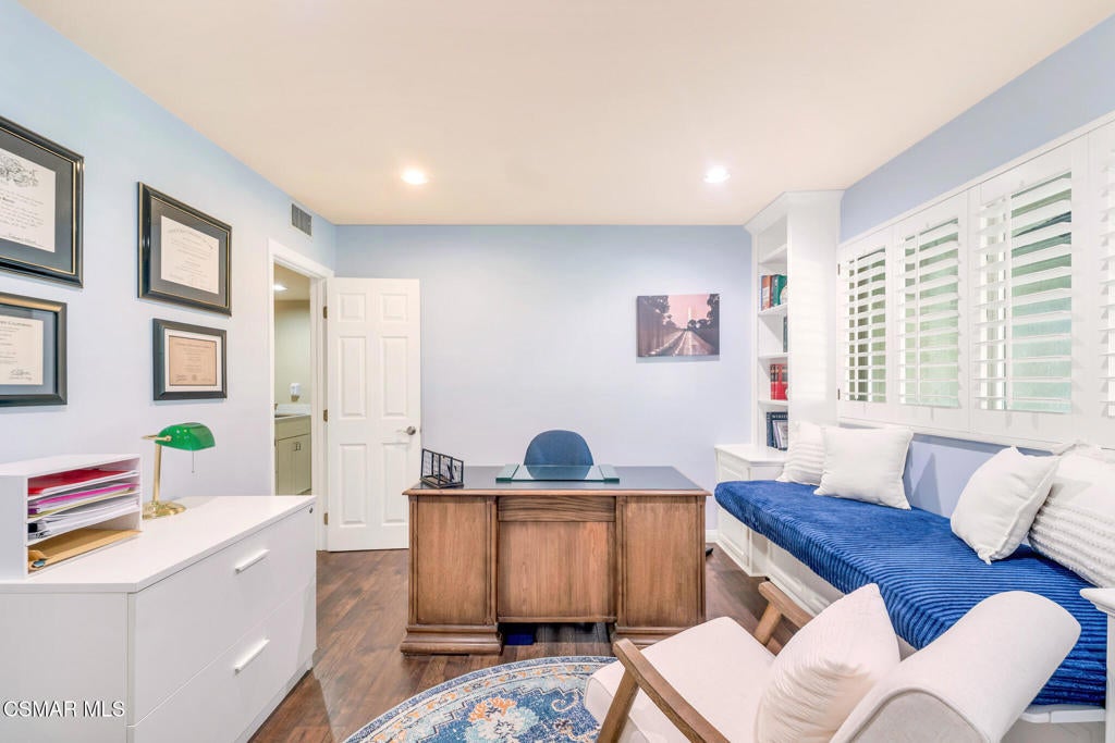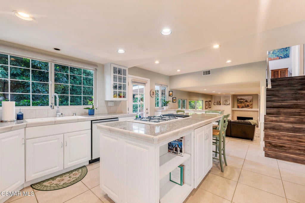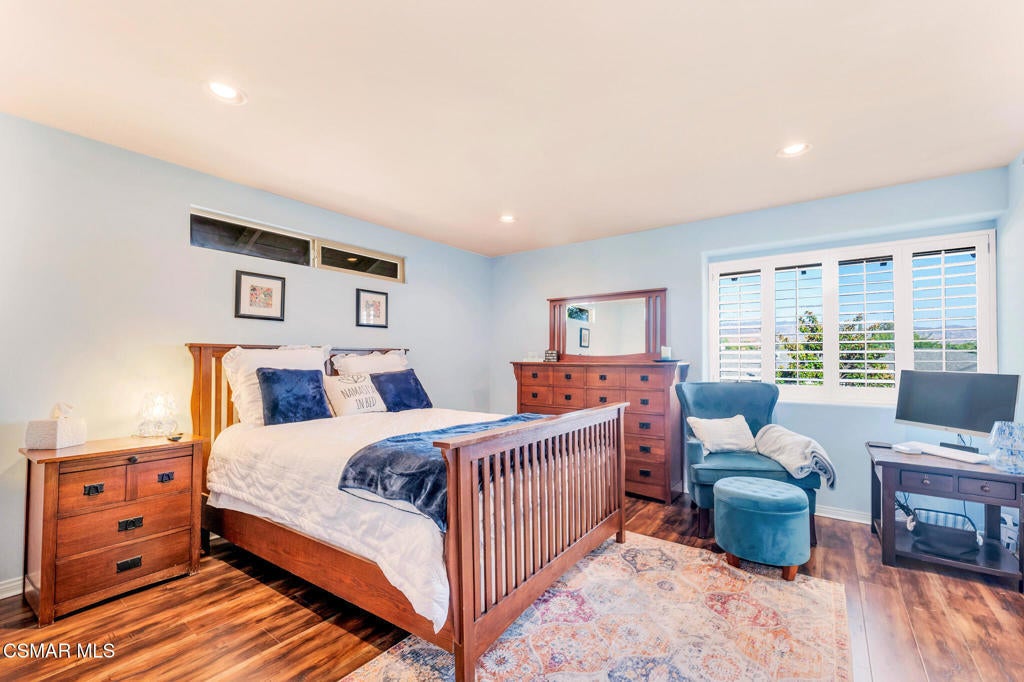 Beautifully maintained and rich with character, this 5-bedroom, 3-bath Fountainwood home offers approximately 2,535 sq. ft. of living space on an 8,712 sq. ft. lot with a 3-car garage. Blending comfort, style, and functionality, it's ideally situated in one of North Central Simi Valley's most established neighborhoods. Curb appeal shines with a brick-lined driveway and walkway, lush green landscaping, and a full covered front porch with a sitting area--perfect for morning coffee or evening relaxation. Inside, you'll find bright, inviting interiors with neutral-toned walls, plantation shutters, and recessed lighting in many rooms. The tri-level floor plan flows seamlessly from a sunken living room with a stacked-stone fireplace to an elegant dining room highlighted by a chandelier and natural light. The home offers two downstairs bedrooms, including one that is currently set up as a home office with glass French doors, built-ins, and dual entry points--providing flexibility for guests, extended family, or work-from-home needs. The thoughtfully designed and updated kitchen showcases white cabinetry, granite-tiled counters, and a generous island with a gas cooktop and grill, convenient storage niches, and sitting space at one end. Display-glass cabinets, double ovens, a built-in refrigerator, recessed lighting, tile flooring, and a built-in wine rack with adjoining breakfast area make this kitchen a centerpiece for gatherings. A few steps down from the kitchen, the spacious family room offers a second fireplace, built-ins, a wet bar, and a large sliding door leading to the backyard. This lower level also features a bathroom with a shower and a laundry room with garage access for added convenience. Upstairs, two secondary bedrooms share an updated hall bath with built-ins and decorative tile finishes, while the private primary suite features a walk-in closet and a luxurious en suite bath with a corner soaking tub, decorative tile surround, and a curved glass-enclosed shower with a Kohler body-spa system. The home is equipped with a dual air-conditioning system--one unit for the lower level and another for upstairs--with separate zones for the primary suite and the two secondary bedrooms, providing efficient and customizable comfort throughout. The private, lush backyard feels like an outdoor sanctuary--complete with mature shade trees, two brick patio areas (one beneath a shade tree and another fully covered with a ceiling fan and brick columns), a flower-filled fountain, raised brick planters, roses, and fruit trees. With its open layout and relaxing ambiance, this space is ideal for entertaining or peaceful outdoor enjoyment. Ideally located in the highly regarded Fountainwood neighborhood, this home is conveniently near local elementary and middle schools, community parks, recreation, shopping, and dining--capturing the best of North Central Simi Valley living with a welcoming sense of home and community.