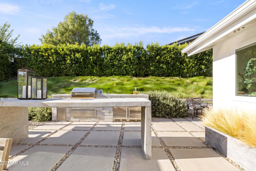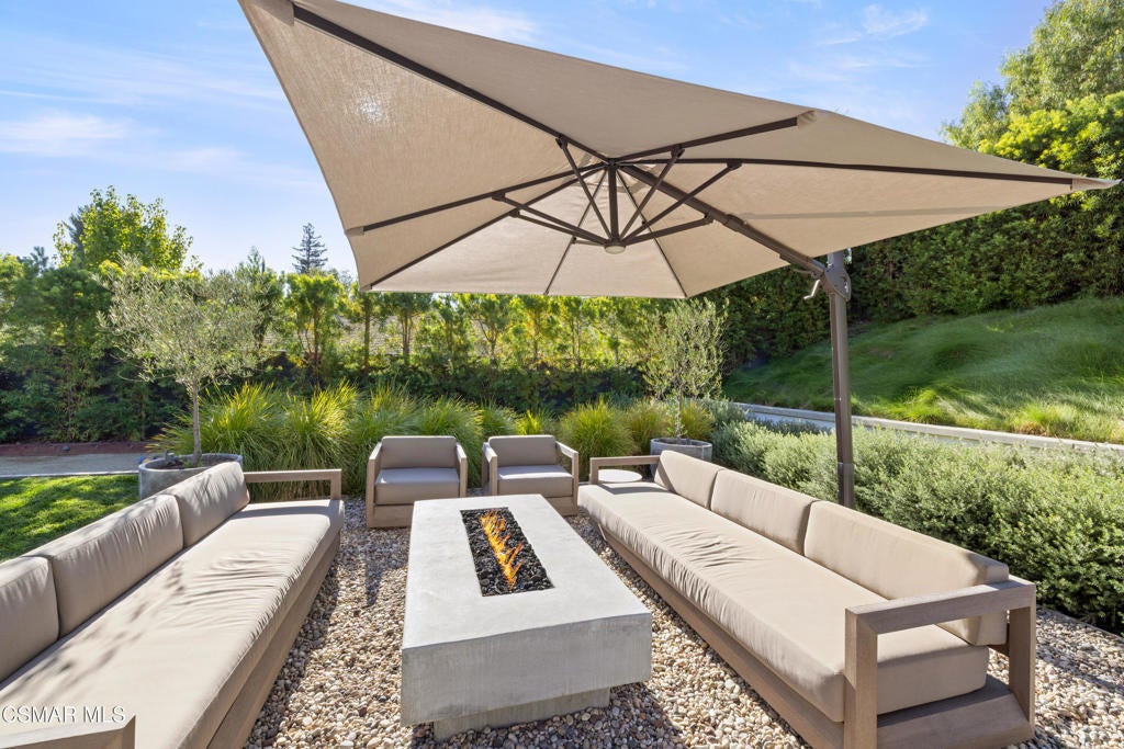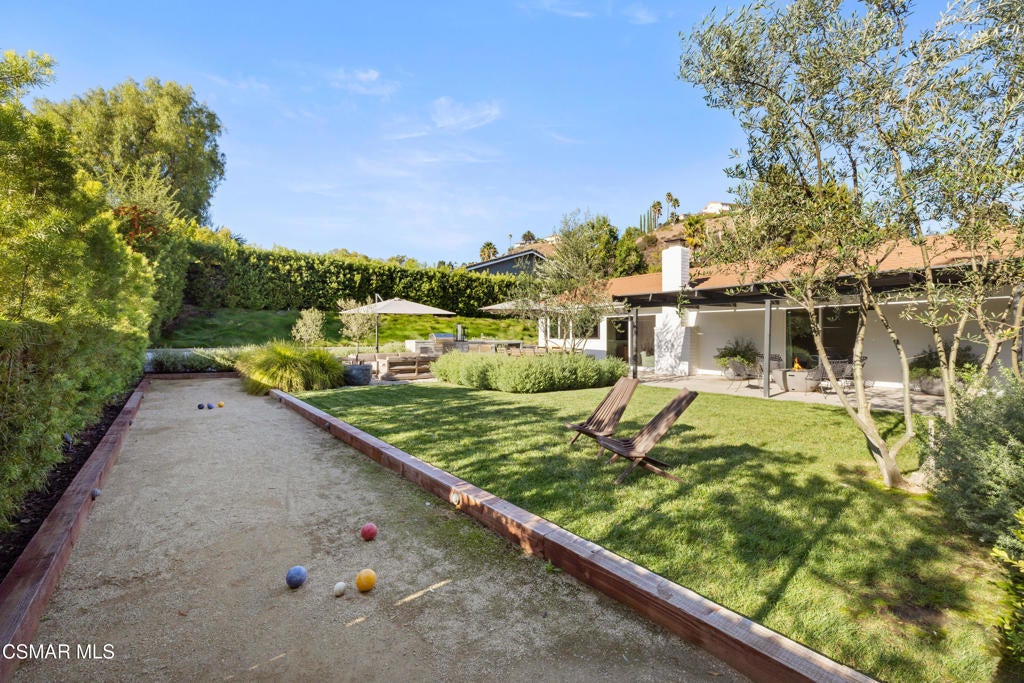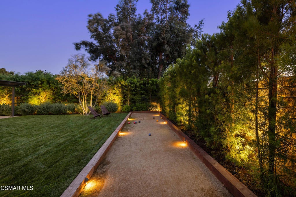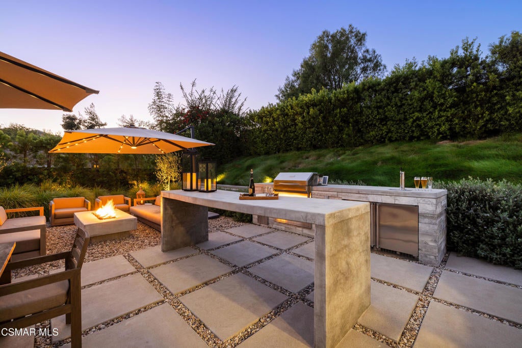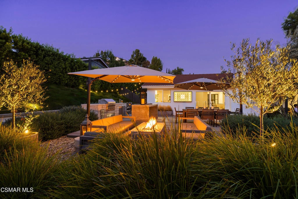 Welcome to this exceptional single-story, 3-bedroom, 2-bath home in the highly sought-after Foxmoor Estates neighborhood of Westlake Village. Surrounded by meticulously designed landscaping, this residence blends indoor and outdoor living with timeless California style.Enter through striking custom-made, glass grid French doors into a formal living room featuring a cozy fireplace and sliding doors that open to the private backyard. The updated kitchen with newer appliances and a breakfast bar flows effortlessly into the open family room, where sliding doors lead to a generous side yard complete with a beautiful wall fountain and lush sculpted mounds of grass.The primary suite offers a walk-in closet, private bath, and direct access to the backyard through sliding doors. The professionally landscaped outdoor space is an entertainer's dream, surrounded by a privacy hedge and featuring multiple seating areas, a custom built-in firepit, BBQ island with refrigerator and beer tap, and a Bocce ball court. Enhanced by olive trees, mature agave, ornamental grasses, and landscape lighting, this private retreat provides beauty and relaxation both day and night.Located in one of Westlake Village's most desirable communities, residents enjoy nearby greenbelts, parks, and convenient freeway access.