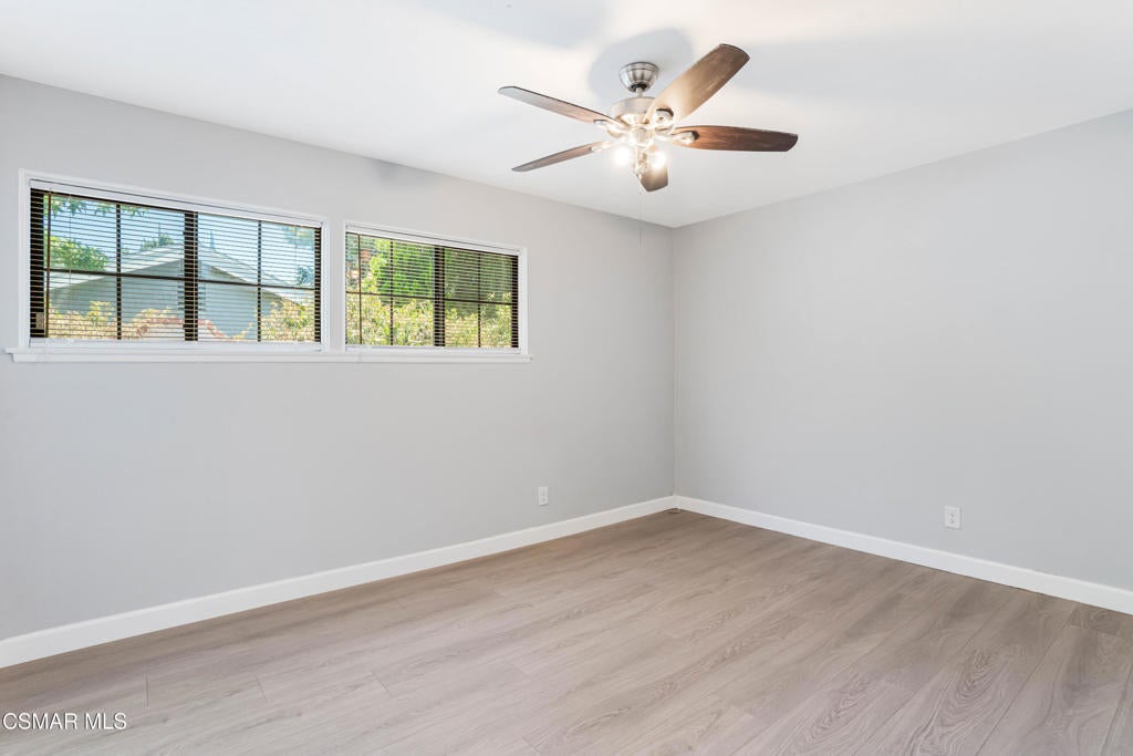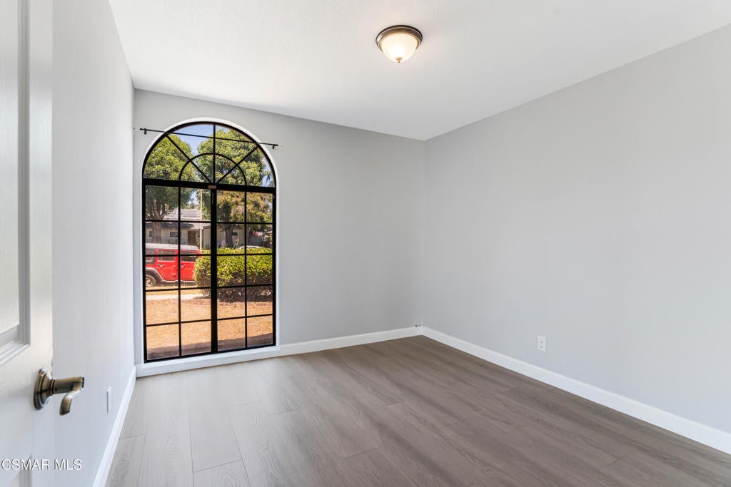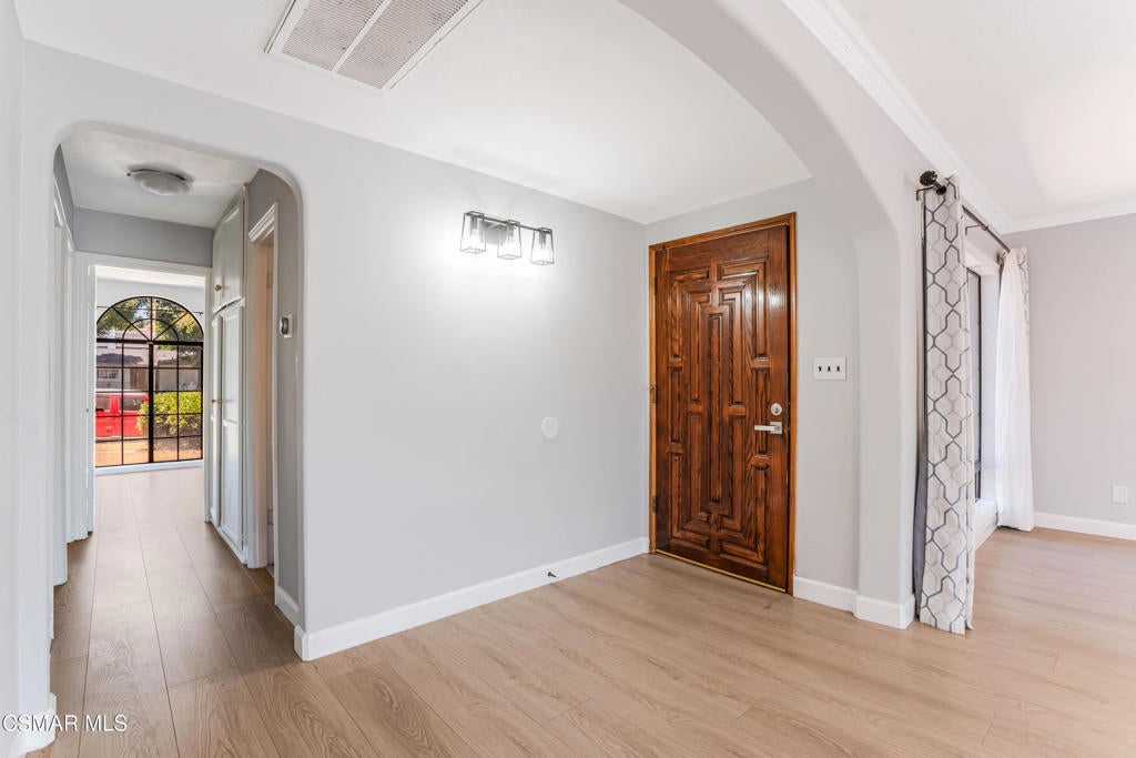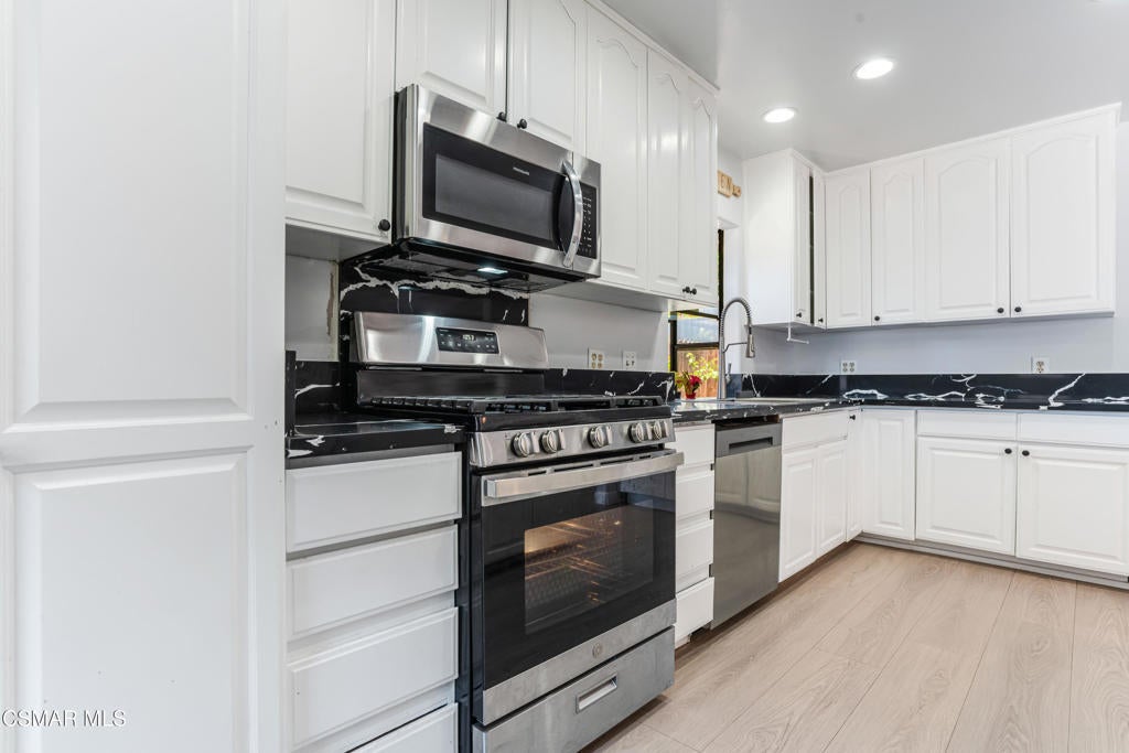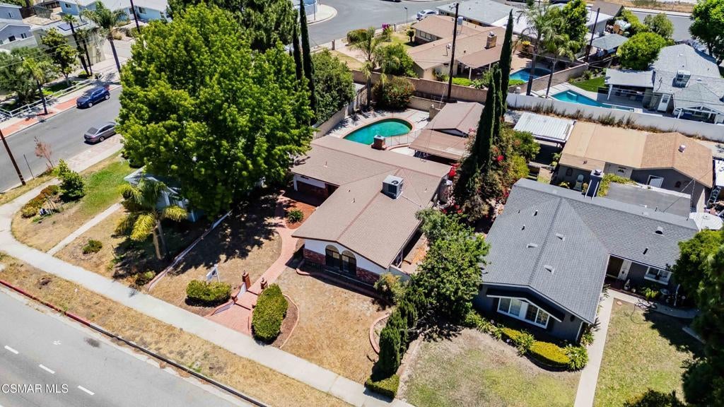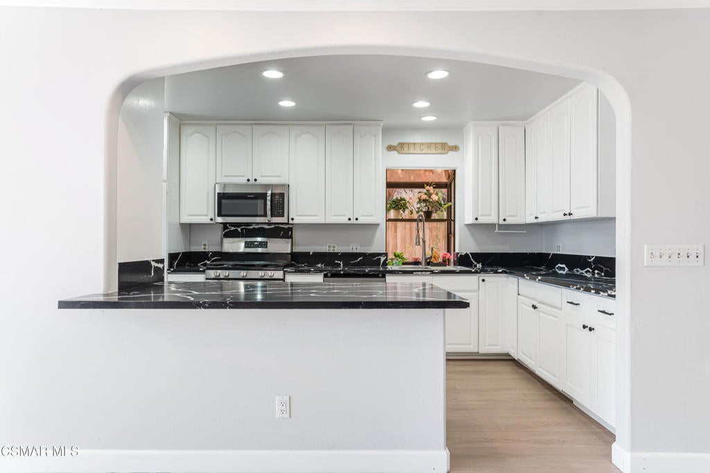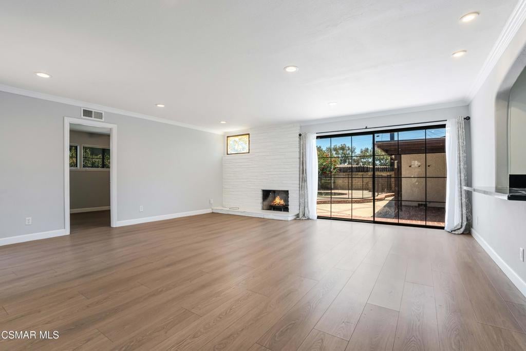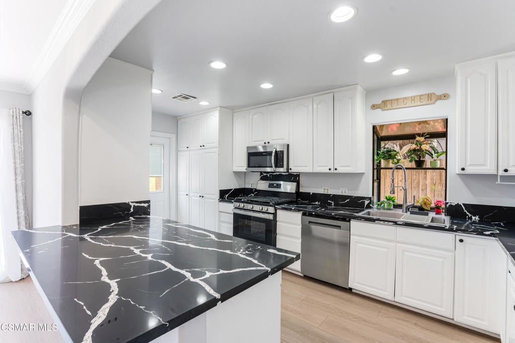 This single-story home offers a functional layout, a private backyard with a pool, and a detached two-car garage with separate alley access. Inside, the home has been tastefully upgraded with luxury laminate flooring, recessed lighting, smooth ceilings, and thick crown and baseboards throughout. The newly remodeled kitchen features white cabinetry, black quartz countertops, and stainless steel appliances, offering a clean and modern look. The family room is warm and inviting, anchored by a charming floor-to-ceiling white brick fireplace and oversized sliding glass doors that open to the backyard. The bedrooms are filled with natural light, including a primary suite with mirrored closet doors and an en-suite bath that features a new vanity, open shelving, and a stand-up shower. The guest bedrooms also include recessed lighting and mirrored closet doors, while the updated hall bath offers granite counters, a rich wood vanity, and a shower/tub combination. This home features a well-thought-out floor-plan, with the primary bedroom separated from the guest bedrooms. Throughout the home, open archways add a touch of character and visual appeal. The backyard is ideal for entertaining, complete with a swimming pool and covered patio space. With its convenient Granada Hills location, functional layout, and valuable upgrades, this is a fantastic opportunity to own a well-maintained home.