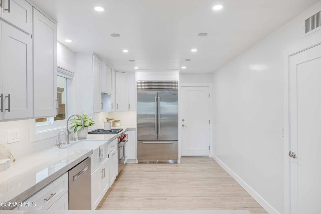 Welcome to the ultimate in beachside living at 5113 Whitecap Street--just moments from the sand in the highly sought-after Oxnard Shores community. This fully remodeled 3-bedroom, 3.5-bath coastal retreat has been thoughtfully transformed with luxurious finishes, timeless design, and all the modern upgrades you could ask for.The spacious primary suite is located on the main level, offering a beautifully renovated ensuite bathroom and ultimate privacy. Upstairs, two additional bedrooms each feature their own ensuite bathrooms, perfect for family, guests, or a dedicated home office. One of the upstairs bedrooms opens to an expansive private deck through a dramatic oversized slider--an ideal space to relax under the sun or entertain beneath the stars.Inside, the home boasts stunning engineered wood flooring throughout, smooth new natural plaster walls, recessed LED lighting with dimmer switches, and custom window shades on every window. The heart of the home is the open-concept great room and dining area, centered around a striking marble fireplace with an automatic switch for effortless comfort. The remodeled kitchen is truly a chef's dream, featuring natural honed quartzite countertops, all-new custom cabinetry, a top-of-the-line Wolf range, Sub-Zero refrigerator, farmhouse-style sink, and a stylish mini bar with a wine fridge and accent lighting. The home is also wired for whole-house audio, creating the perfect environment for entertaining or relaxing.Every detail has been considered, including all new windows and sliders, a brand-new heating and air conditioning system, and built-in closet systems in every bedroom, complete with quartz-topped dressers and shelving. Outdoors, enjoy low-maintenance landscaping illuminated with landscape lighting and additional accent lights, a cozy firepit, a new concrete driveway with elegant pavers, and direct access to an oversized garage with an epoxied floor. There's also convenient RV parking on one side and two-car parking on the other, along with a dedicated laundry area that includes full hookups and a utility sink. The home is even pre-wired for outdoor security cameras, offering peace of mind along with unparalleled style.From the new roof to the freshly painted interior and exterior, this home has been completely refreshed and reimagined with no detail overlooked. Whether you're looking for a permanent coastal haven or the ultimate weekend escape, 5113 Whitecap Street offers the very best of California beach living--effortless, elegant, and just steps from the shore.