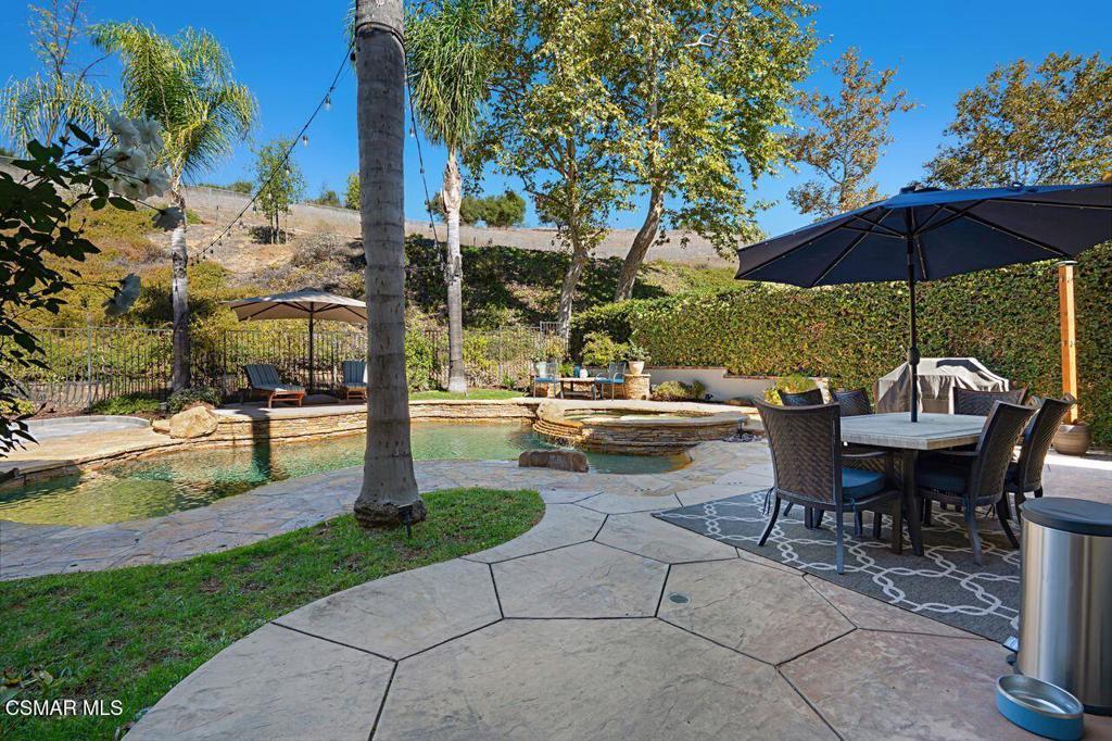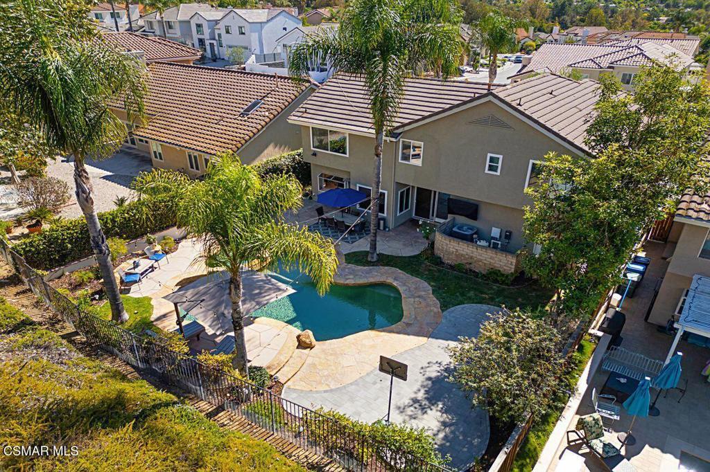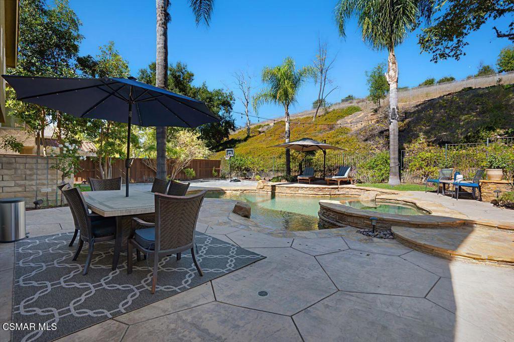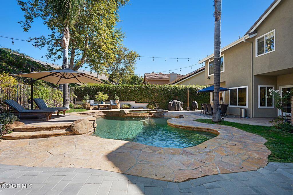 OPEN HOUSE CANCELLED SUNDAY, 10/26.Your Stunning Upgraded Pool Home in Oak Park Awaits! Step through the custom front door into a bright, open foyer with soaring ceilings and beautiful luxury vinyl plank flooring that flows throughout the main level. The elegant formal living room showcases a remodeled fireplace and a sliding glass door leading to the side yard, while the adjacent formal dining room connects to the kitchen through a convenient pocket door. The chef's kitchen, completely remodeled in 2021, is a showstopper--featuring quartz countertops, stainless steel appliances, a custom backsplash, and a designer range hood. Custom cabinetry includes pull-out shelves and soft-close hinges for optimal function and style. A spacious island with a casual dining area overlooks the backyard, creating the perfect setting for family gatherings. The kitchen seamlessly opens to the inviting family room with ample space for relaxation and re-faced cabinetry for a polished look. Off the family room, you'll find a well-appointed laundry room with re-faced cabinets leading to a garage that offers additional storage. A stylish powder room is conveniently located near the foyer. The staircase has been beautifully opened up with a custom iron railing, adding a modern touch to the home's design. Upstairs, the luxurious primary suite impresses with vaulted ceilings, hillside views, and remote-controlled window shades. The remodeled primary bathroom offers a spa-like retreat with a soaking tub, separate shower, dual vanities, and a spacious walk-in closet. A second bedroom suite features its own private bathroom and scenic views, while two additional large bedrooms share a hallway bath. The entertainer's backyard is a true oasis, perfectly positioned on a premium lot backing to open space. Enjoy a beach-entry Pebble Tec pool and spa, lush grassy area, and multiple sitting areas ideal for relaxing or hosting gatherings. Additional highlights include plantation shutters, recessed lighting, a whole house fan, and upgraded windows throughout. Ideally located in the award-winning Oak Park School District, close to shopping, parks, hiking trails, and the community center -- this home truly offers the best of California living.