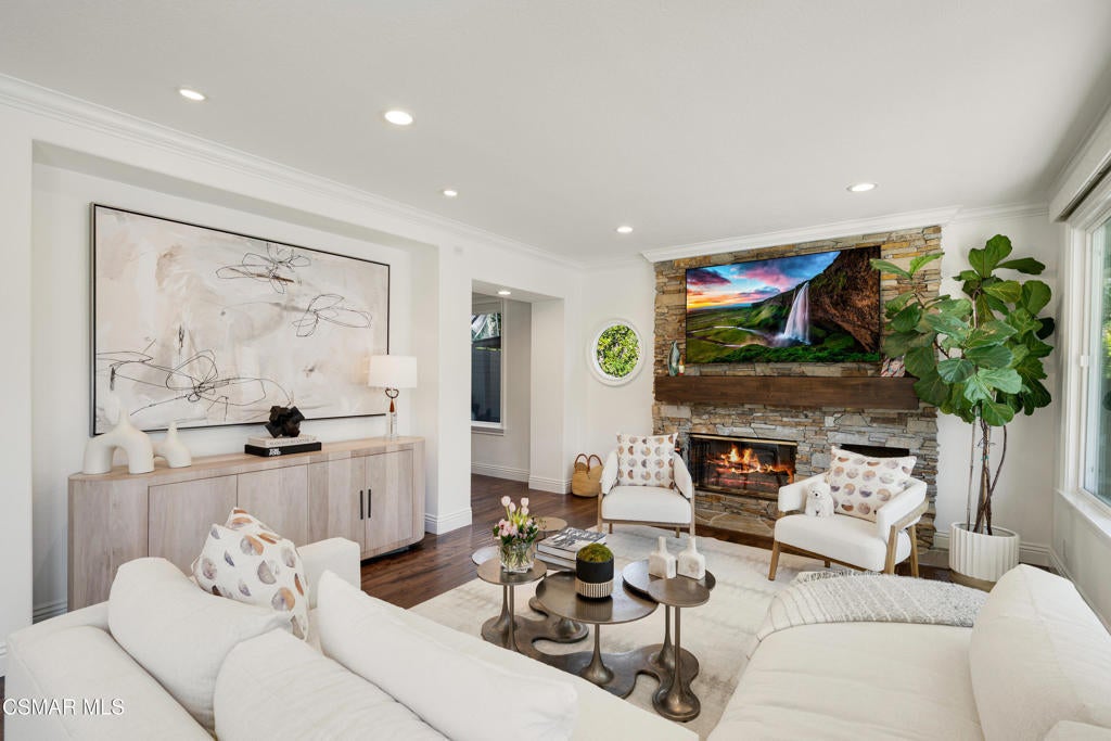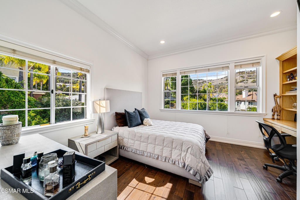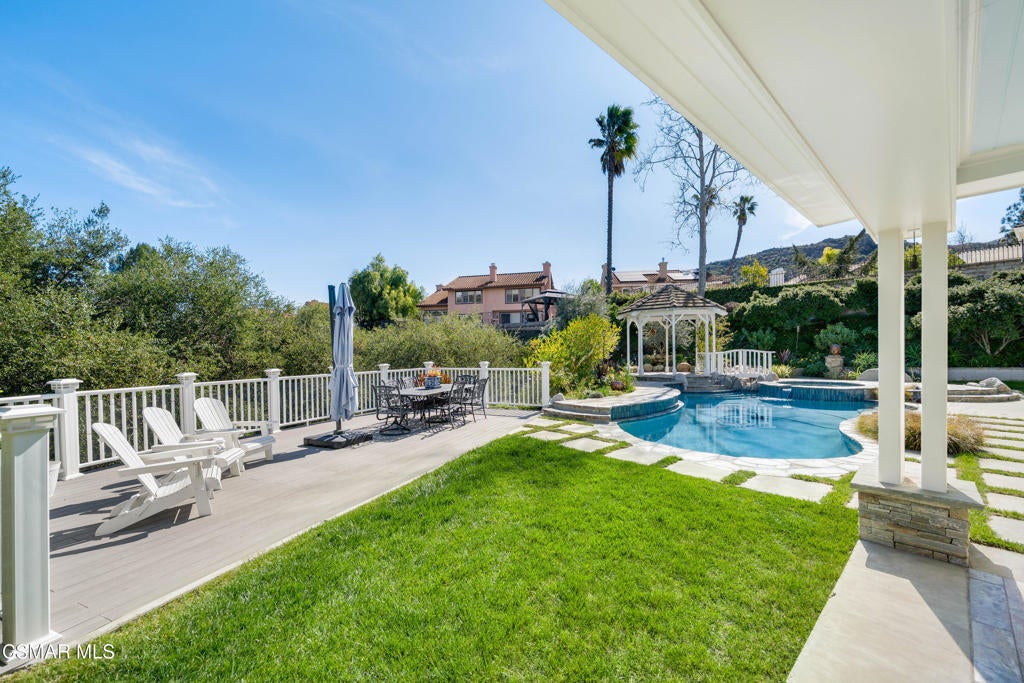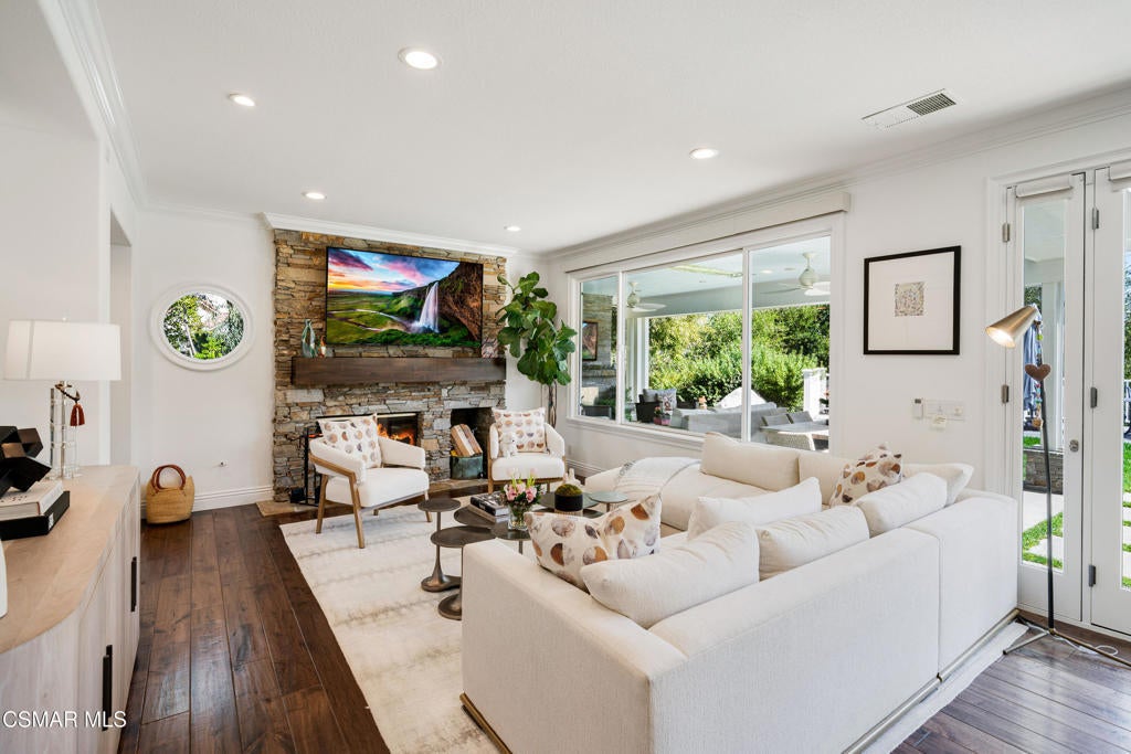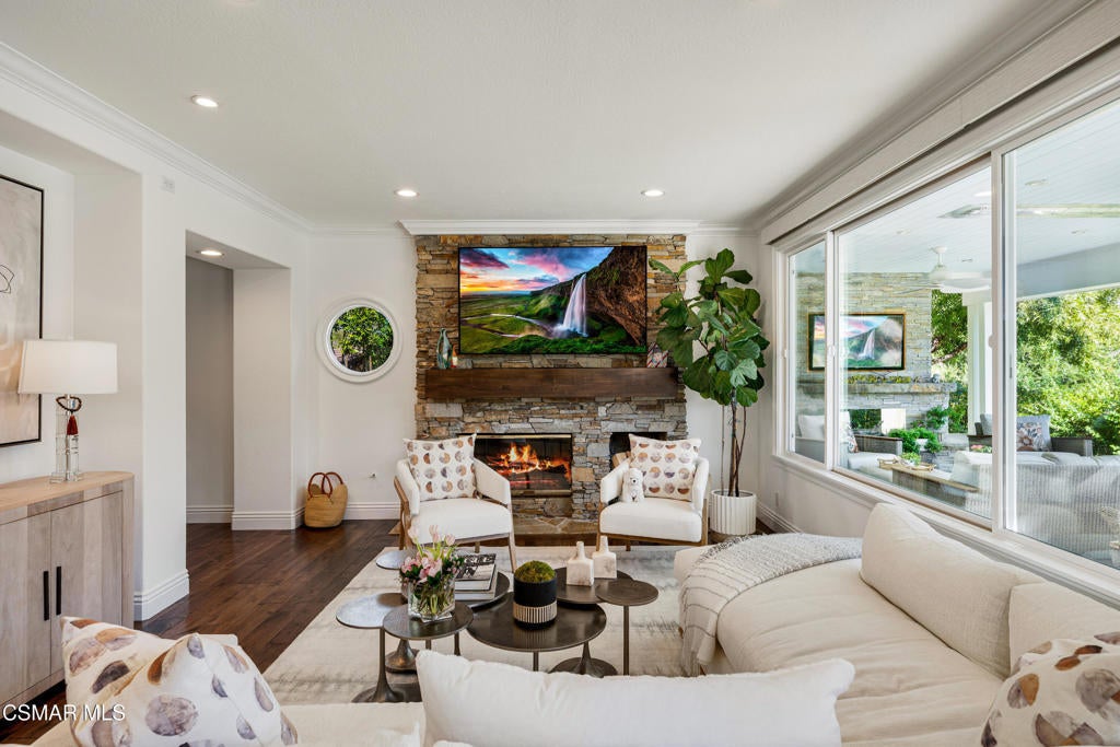 Featured in Westlake Malibu Lifestyle Magazine & Dream Homes! A Rare Gem in Three Springs - Impeccably Remodeled, Spacious, and Stunning Views! Nestled in the prestigious Three Springs neighborhood of Westlake Village, this exceptional 5-bedroom, 4 1/2-bathroom estate (approx. 3,738 sq. ft.) seamlessly blends modern luxury with timeless elegance. From the moment you arrive, the beautifully landscaped exterior and custom lighting set the tone, while the grand entry welcomes you with soaring ceilings and an abundance of natural light, creating an inviting and sophisticated ambiance. The thoughtfully designed floor plan offers both functionality and comfort. A main-level bedroom with its own en-suite bathroom provides a private retreat for guests or multi-generational living. Upstairs, you'll find four additional bedrooms, including two Jack and Jill bedrooms connected by a shared bathroom, and another guest room with an en-suite bathroom. The luxurious primary suite features its own fireplace, three spacious walk-in closets, and a standalone jet bathtub with a Toto luxury washlet. Step into the gourmet kitchen, featuring custom cabinetry, granite leather countertops, and top-of-the-line Viking appliances. The kitchen also includes an eat-in dining space, and the cozy family room, connected to the kitchen, offers an open-concept space with a wood-burning fireplace. The home also includes an elegant formal dining room, a welcoming living room with a wood-burning fireplace, and an epic bar--perfect for entertaining. Step outside to an ultra-private backyard oasis, where no neighbors directly behind allow for uninterrupted mountain views. The heated saltwater pool and spa are complemented by lush landscaping, fruit trees, and a serene garden retreat. The expansive covered outdoor patio--featuring slate flooring, a built-in gas fireplace, television, heaters, and fans--offers the perfect setting for year-round entertaining. A separate built-in BBQ area with a custom cement countertop enhances the space. An additional spacious side yard, previously used as a basketball court, has the potential to be transformed into an impressive sports court. The home has been meticulously upgraded, including a newer roof, select areas with double-pane windows, brand-new garage doors, a custom front door, and elegant engineered hardwood flooring throughout. The interior and exterior have been freshly painted, with select areas featuring remote-controlled blinds and custom plantation shutters for added style and convenience. The saltwater pool was completely redone this past year with new resurfacing, new tile, and sealed surrounding pavers. Additionally, the exterior landscaping lights create a warm and inviting ambiance that enhances the home's appeal. Located near top-rated schools, scenic parks, shopping, and fine dining, this home offers the perfect blend of luxury, comfort, and community. With access to the award-winning Las Virgenes Unified School District and the natural beauty of Westlake Village, this is a rare opportunity to own an extraordinary home in an unbeatable setting.