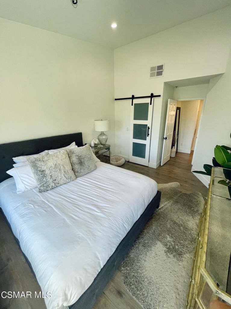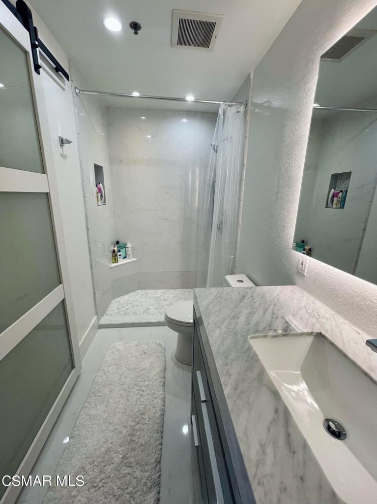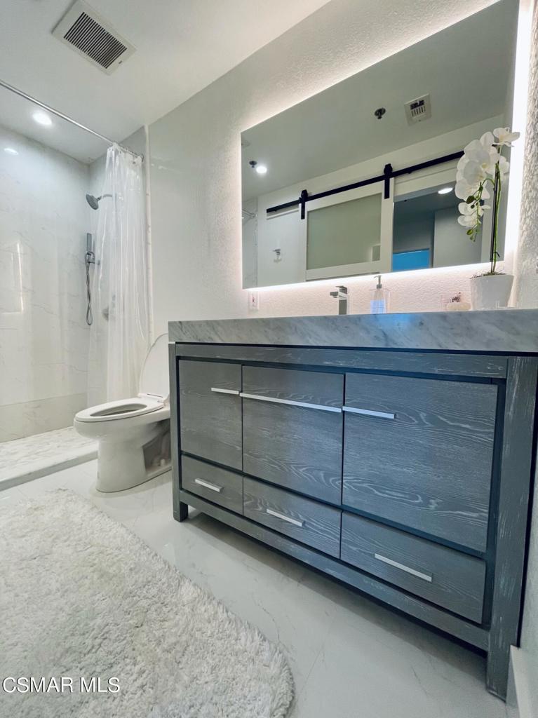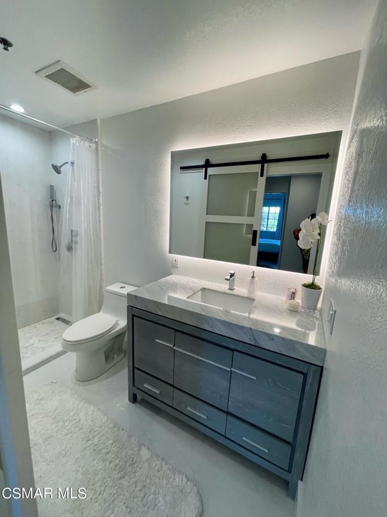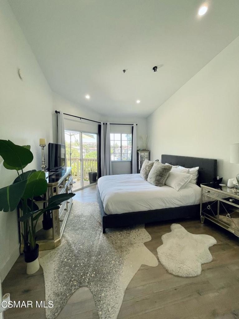Welcome to this beautifully remodeled (just in 2019) open floor plan condo, located on the top floor offering an abundance of great natural lighting as well as the gorgeous mountainside view. Upon entry you are greeted with neutral, plank flooring, recessed lighting, high 20ft+ ceilings and smooth ceilings create a nice sense of space. The one bedroom suite features a large walk-in closet with organizers and slider access to the patio where you can unwind and take in the lush green scenery. The bathroom has been completely gutted and remodeled and features a large stall shower, marble stone topped vanity, an LED backlit vanity mirror and a chic barn door closure. The fireplace also has been updated for a fresh, modern look. You'll be hard pressed to find a better location than this. The balcony floor and railing were redone by the HOA in 2021. The spacious balcony also features a storage closet with washer and dryer. Internet and cable are included along with a Nest smart thermostat and Nest camera doorbell that can be controlled with the Nest app. Shadow Ridge is located close to Oak Park schools, hiking trails and a dog park. Take advantage of the incredible resort-like amenities included with this stunning community. Enjoy the private lush walkways, or a game of volleyball, tennis or basketball on the sport courts. Gym amenities also included. Bask in that So Cal sunshine too at either of the 2 community pools and spas. Includes one deeded covered parking spot plus additional guest parking.