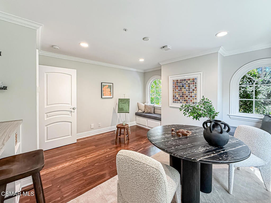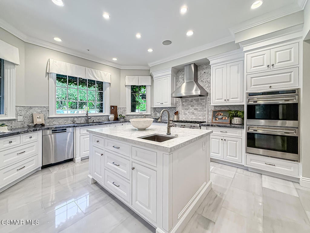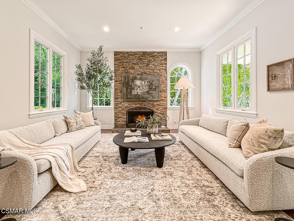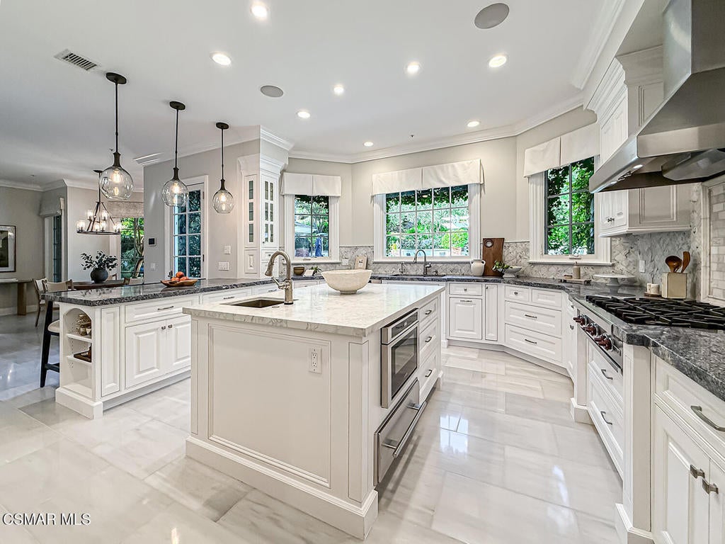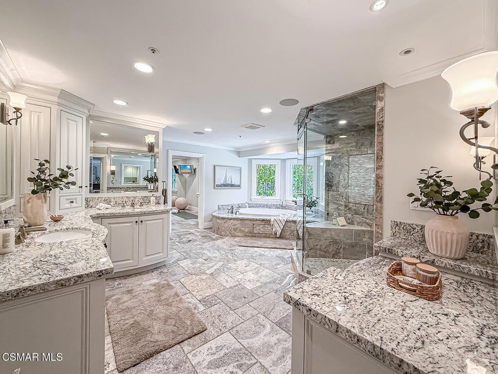 Modern Elegance Meets Resort Living in North Ranch Country Club EstatesEnter through your enchanting wooden bridge into your private tree-lined motor court, where every detail of this estate reflects sophistication, comfort, and resort-style living in one of Westlake Village's most prestigious guard-gated communities.Set on a premier 2.15-acre lot, this stunning custom residence blends timeless architecture with thoughtful modern upgrades, including a brand-new concrete roof, brand new Bosch HVAC systems with new ducting, new gutters, refinished hardwood floors, fresh interior paint, upgraded primary bathroom with bonus space great for yoga, exercise equipment or meditation and a restructured primary balcony.Inside, a grand marble foyer opens to light-filled living spaces with cathedral ceilings, stacked-stone fireplaces, and custom craftsmanship throughout. The chef's kitchen is a true centerpiece with Wolf and Subzero appliances, an oversized quartz island, and an elegant butler's pantry as well as oversized walk in pantry. The primary suite is a serene retreat complete with a fireplace, sitting area, spa-inspired bath, and an expansive walk-in closet.The private backyard is a true resort escape featuring a custom cabana with full outdoor kitchen, BBQ, Viking fridges, brick pizza oven, and stone fireplace. Enjoy the resort-style pool and spa with cascading waterfall, multiple fire pits, and a lighted sport court perfect for tennis, pickleball, basketball, and more. The grounds also offer flat lawns, an enclosed garden, an outdoor shower, and fully owned solar panels, surrounded by lush, mature landscaping.Every detail of this home reflects sophistication, comfort, and resort-style living in one of Westlake Village's most prestigious guard-gated communities.