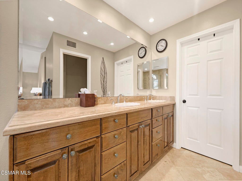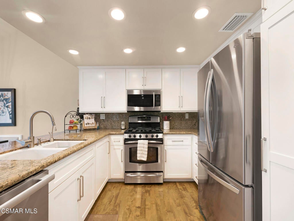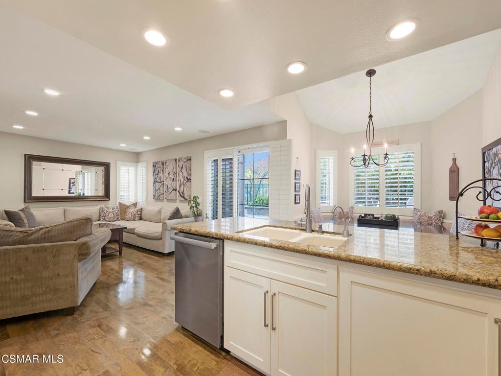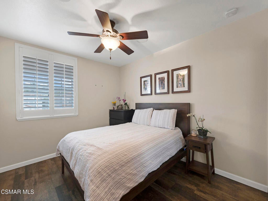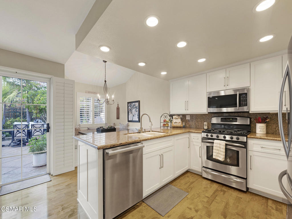 Welcome to this move-in-ready home in the prestigious Wood Ranch Community! Wood Ranch features a golf course with a country club, multiple parks, tennis courts, community pool and amazing hiking trails. This home offers over 1,800 square feet of living space with 3 bedrooms, 2 full bathrooms, and a powder room. Step inside to a living room with soaring cathedral ceilings that flows seamlessly into the dining room, creating an ideal space for entertaining. The family room opens to a fully remodeled kitchen featuring white shaker cabinets, granite countertops, and stainless steel appliances, complemented by a built-in breakfast nook.Throughout the house, you'll find warm wood floors and elegant plantation shutters. The bedrooms and family room is equipped with a state-of-the-art surround sound system for an immersive entertainment experience.Upstairs, two spacious secondary bedrooms share a hall bathroom with a walk in shower. The Primary Suite is a true retreat with vaulted ceilings, a private balcony perfect for your morning coffee, and a large en-suite bathroom. The primary bathroom features a double vanity, a soaking tub, a separate shower, and a walk-in closet.The backyard is an entertainer's oasis, complete with waterfalls with heated and fully automated spa and soaking pool. Includes color changing LED lights, an outdoor kitchen with Outdoor BBQ area includes Viking grill, stainless steel refrigerator with beer tap and stainless-steel refrigerator for beverages, and lush, tropical landscaping. Exterior lighting through the property for landscape, BBQ area and 4 ring camera system. This house is not only beautiful but also well-maintained, with recent upgrades including a new roof in 2022, a new AC compressor and coil in 2025, and a tankless water heater installed in 2023. Enjoy the convenience of a nearby park and Wood Ranch Elementary School. There is nothing left for you to do but move in and enjoy your new home!