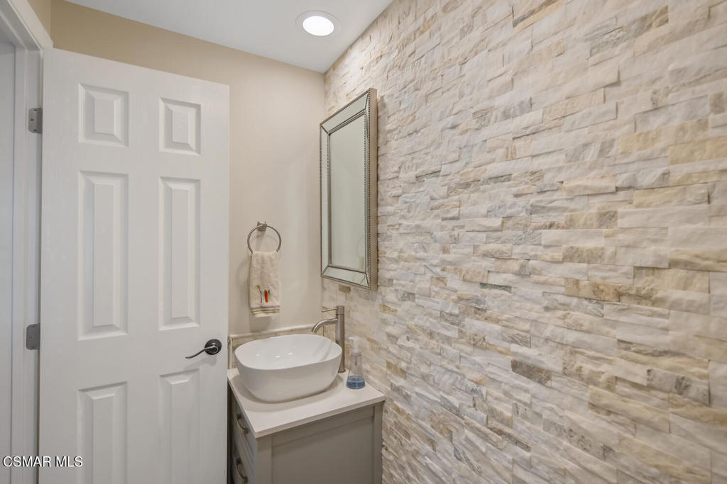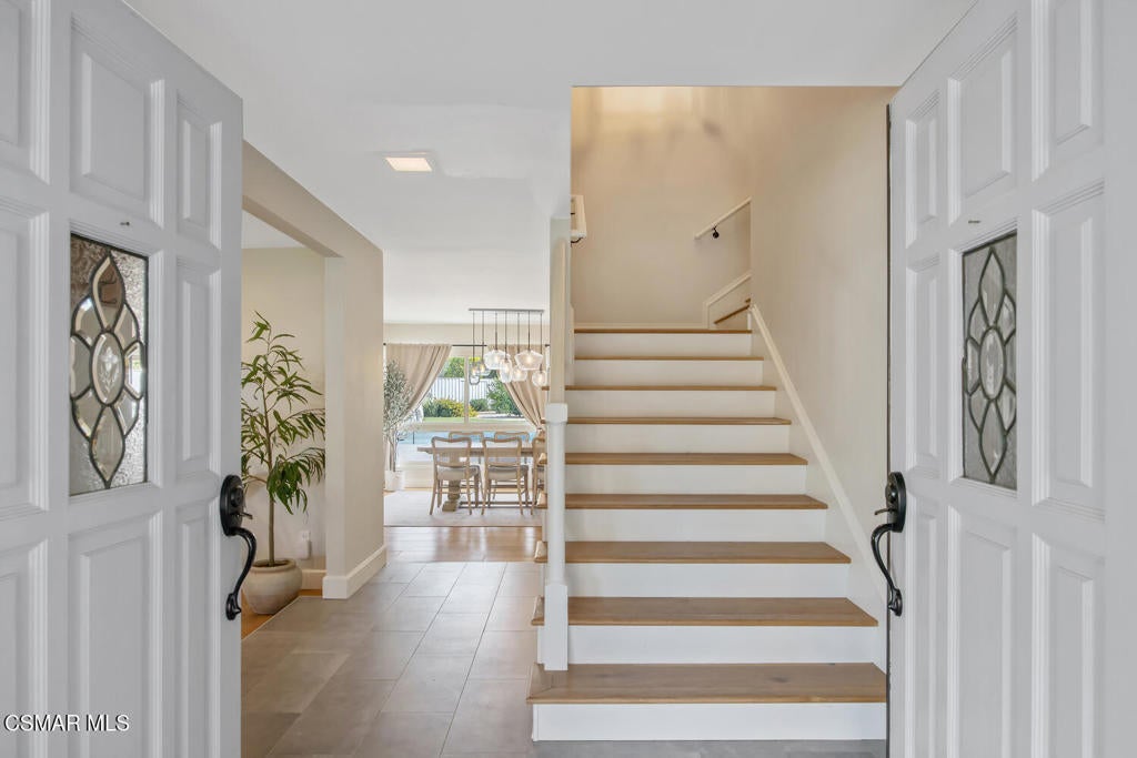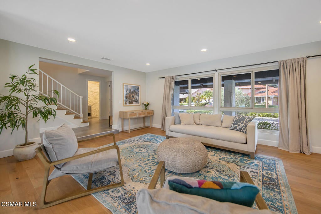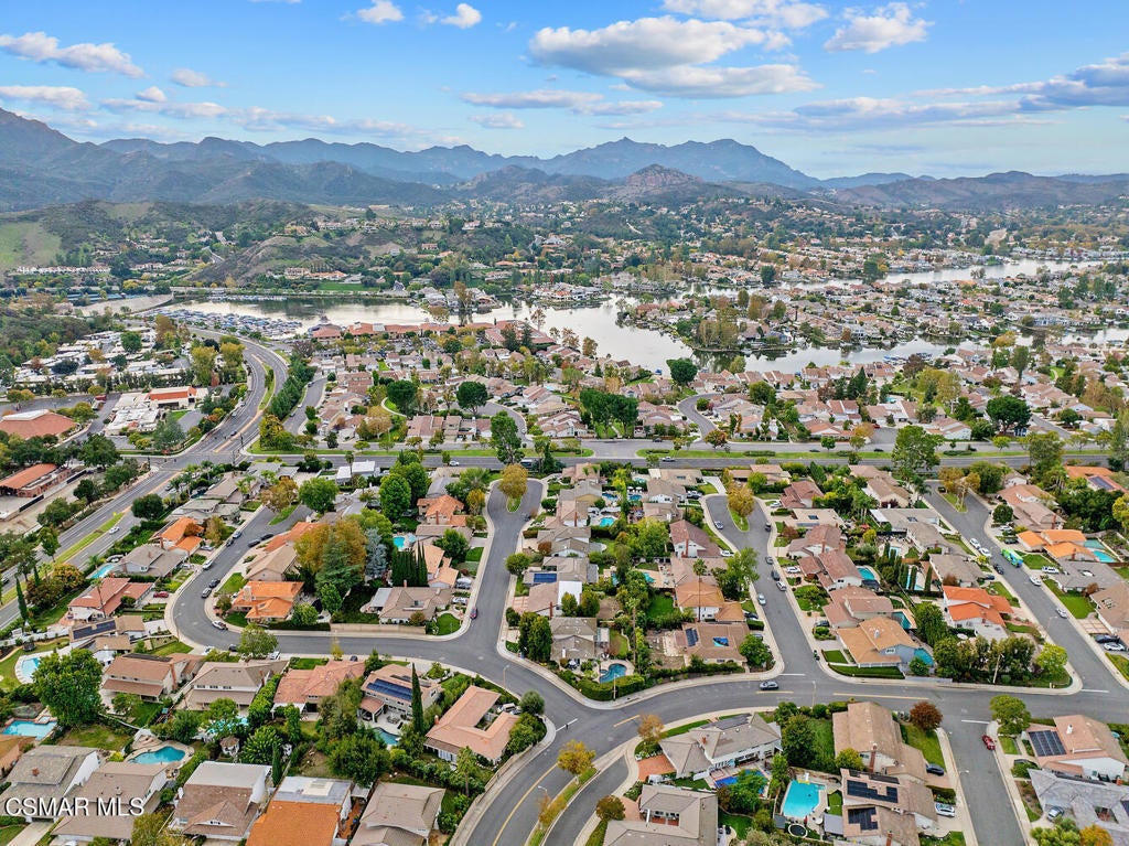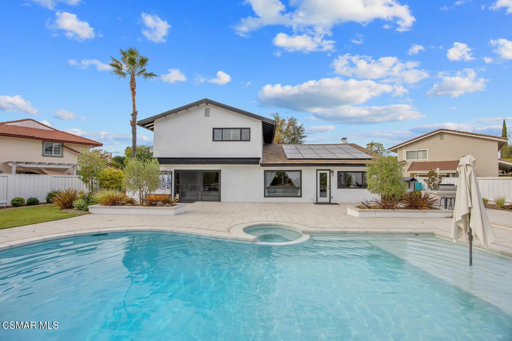 Tucked away on a peaceful cul-de-sac in the beloved First Neighborhood, this impeccably remodeled residence offers the perfect blend of sophistication, comfort and relaxed California charm on 1/3 of an acre, the largest lot in the community!Completely updated, this stylish, contemporary home welcomes you with an abundance of natural light and a modern, casual elegance. The open concept living and dining areas overlook lush views and lead directly to the rear yard, creating a seamless indoor-outdoor flow. The chef's kitchen features quartz countertops, a gorgeous herringbone backsplash, stainless steel appliances with a matching farmhouse sink, and a generous breakfast bar that flawlessly transitions into the great room / family room, highlighted by a cozy, chic fireplace that is framed by built-in bookshelves and cabinets. There is also a formal dining area, perfect for everyday dining or effortless entertaining.The main-level also boasts a veritable private ''wing'' with its own entrance, large living area and en-suite bedroom, creating a fabulous option for multi-generational living, a guest suite, home office or a second living area. An additional powder room and indoor laundry round out the first floor. Upstairs, the primary suite provides a tranquil retreat with dual closets and dual sinks, while two additional bedrooms with Plantation shutters share a beautiful full bathroom with dual sinks and an oversized tub / shower.Outside, the newly redesigned, thoughtfully appointed expansive yard exemplifies the quintessential Southern California dream! A sparkling PebbleTec spa and pool with a Baja shelf, a fire pit, built-in BBQ station with seating, dining spaces, gathering areas, electric shades, hardscape, park-like grass, fruit trees, garden boxes and serene, mature manicured landscaping all create your private oasis.Top it all off with newer solar panels and two back-up Tesla batteries, EV charging for two vehicles, a three-car garage (one bay is currently being used as an office), a newer HVAC system, warm-inviting light wood floors, custom touches throughout and its proximity to the lake, trails, golf, Westlake Village's vibrant shopping, dining and entertainment scene and award-winning schools...an absolute must have!