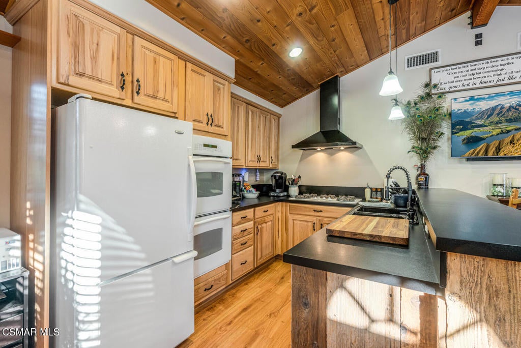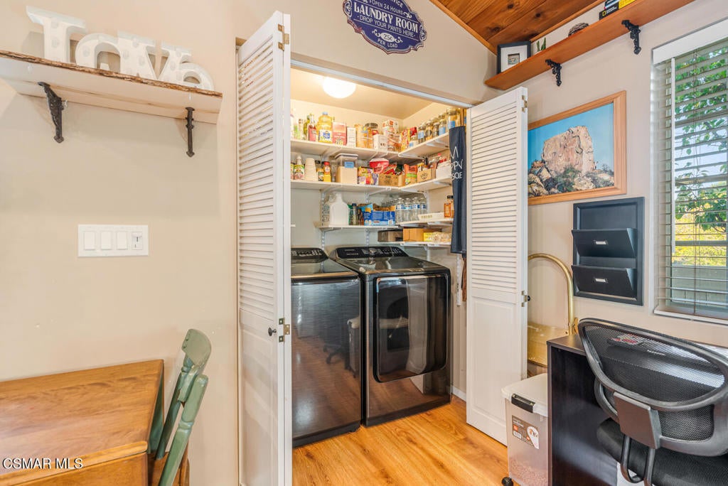 Be a part of the Santa Susana Knolls' history. Studio filming, Corriganville, Tarzan, Cowboys, Jurassic Park. nearby Corriganville has it for your hiking and touring pleasure as this home is just a couple minutes away.This 1928 absolutely charming cabin home is one of the original homes built in ''The Knolls,'' an ecelctic communty within the borders of East Simi Valley and the San Fernando Valley. You'll recognize the home by the mulberry tree in the front yard, artificial grass and the pretty red painted front door and where, in the Great Room, you'll find proudly displayed photos of the old Alta Vista Road, the old Railroad Station and The Santa Susana Pass Road. The original Knolls brochure of cabin sites being sold is in the home to be viewed..1088 Alta Vista has been completely remodeled with pine vaulted ceilings, kitchen with hickory cabinets, some pull-outs, bar stools included, double sink, gas cooktop, disposal, dishwasher and refrigerator included, finished with warmth that lends itself to entertaining friends and family.The Great Room concept provides lots of natural light, and gives you a setting of modern living or from the days of a weekend retreat set among oak trees, gorgeous peacocks that roam the streets and rooftops (check out the feathers in the Great Room).The spacious bedroom, with french doors to a private rear deck, has two double wardrobe closets with partial built-in cabinetry and views of the mountains that sooth the soul when enjoying the atmosphere of The Knolls and while you sip your coffee in the morning or wine in the evening.The bath also has been remodeled with Travertine flooring, stone counter and shower, floor to ceiling.Laminate flooring, vinyl blinds, utility room inside with washer/dryer hookups, ceiling fans and the mounted TV is included. Surround sound is a cleverly designed hidden floor compartment with integrated electrical outlets provide convenient power access while keeping cords and devices neatly out of sight. Oh, did I mention there's fully paid off solar here too!The side yard has been extended to accommodiate a trailer or other vehicle and room for other toys, behind gates for privacy. Easy care of the exterior with ''hardy'' siding.Below and underneath the main house is an anteroom, workshop or as is called ''The Den''.with electrical wiring and systems including surround sound wiring, workshop, storage and newer AC, ductwork and tankless water heater.Close to Corriganville, a public park, Santa Susana Railroad Depot and Museum, Old Santa Susana Cafe, delicous food and ambiance and other facilities to serve you.If you're seeking quiet, serenity, a place to create your works, The Knolls and this home is for you.