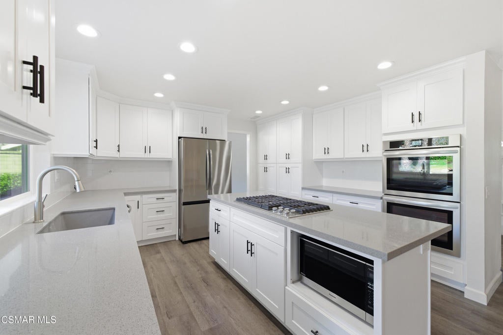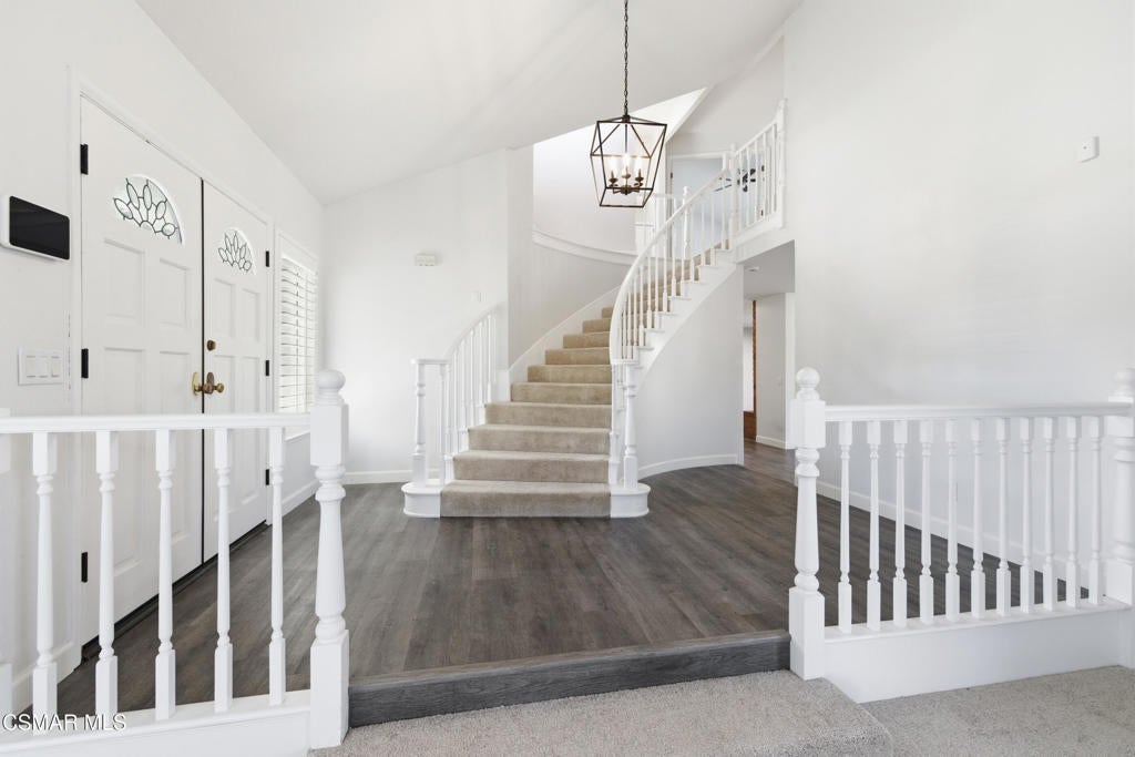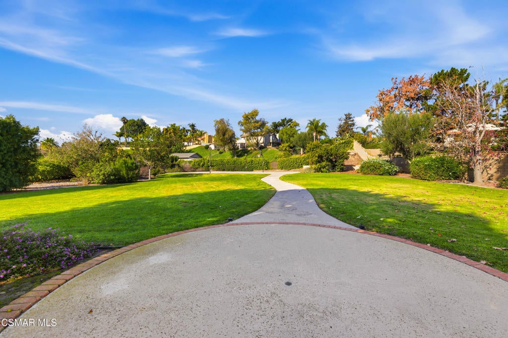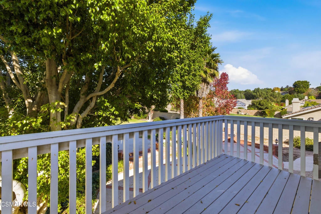 Situated on a tree-lined street in one of Camarillo's most desirable neighborhoods, this beautifully remodeled residence offers an exceptional blend of elegance and comfort. A striking spiral staircase sets the tone for the home, complemented by fresh interior paint, plantation shutters, and recessed lighting throughout. The home welcomes you into a bright, naturally lit space, highlighting updated LVP flooring and plush carpet. The main level features two distinct living rooms, each accented by its own gas fireplace, providing versatile areas for both formal entertaining and everyday living. One living room flows into the formal dining area, creating an inviting setting for gatherings. The kitchen has been thoughtfully updated with modern cabinetry, stainless steel appliances, refined quartz countertops, and a casual dining space with sliding doors that open to the spacious entertainer's backyard. The outdoor area features a large, well-maintained grass lawn, a basketball court, and mature, producing lemon trees, offering ample room for recreation, play, or hosting guests. The front yard also boasts a generous grassy area, enhancing curb appeal and creating a welcoming approach. The second living room includes a wet bar and a sliding door that opens directly to the backyard, ideal for entertaining or relaxing. The main level also includes a bedroom with an en suite bathroom, an interior laundry room, and direct access to a three-car garage. Upstairs features two generously sized bedrooms in addition to the primary retreat, which showcases triple sliding doors and a private balcony. The renovated en suite bathroom features a soaking tub, luxurious designer finishes, and dual walk-in closets. Don't miss the opportunity to make this impressive home yours.