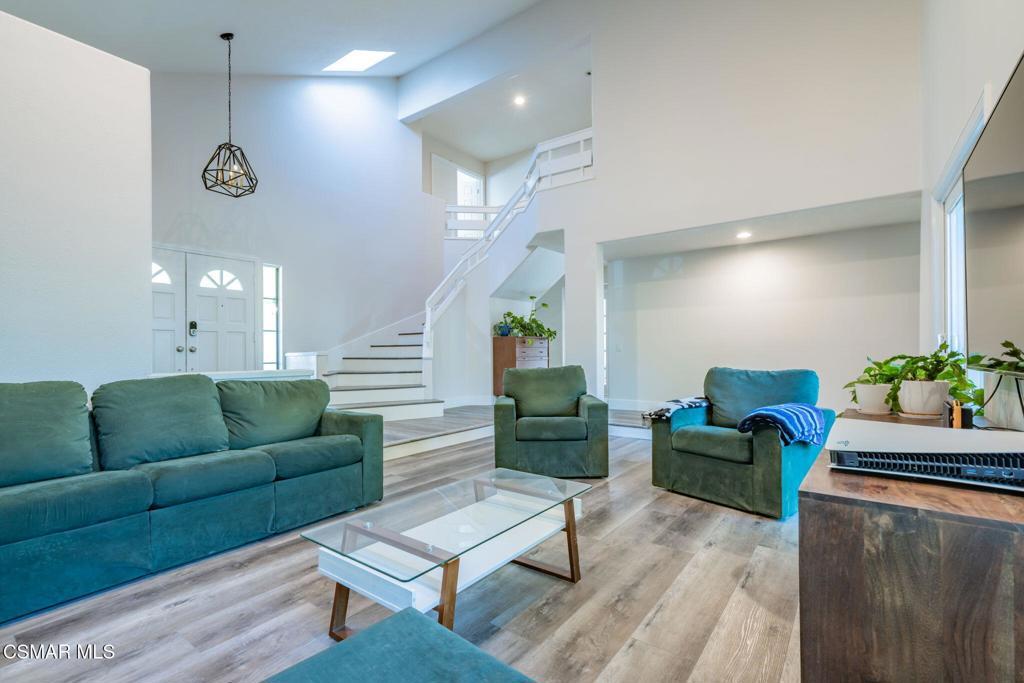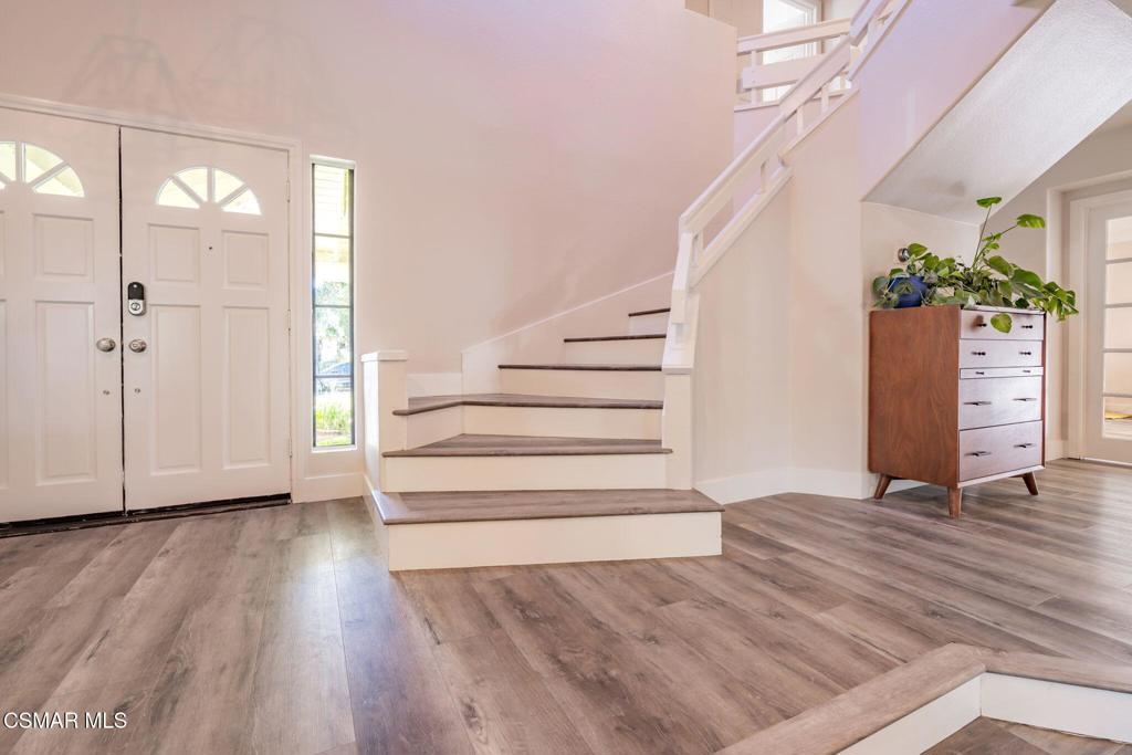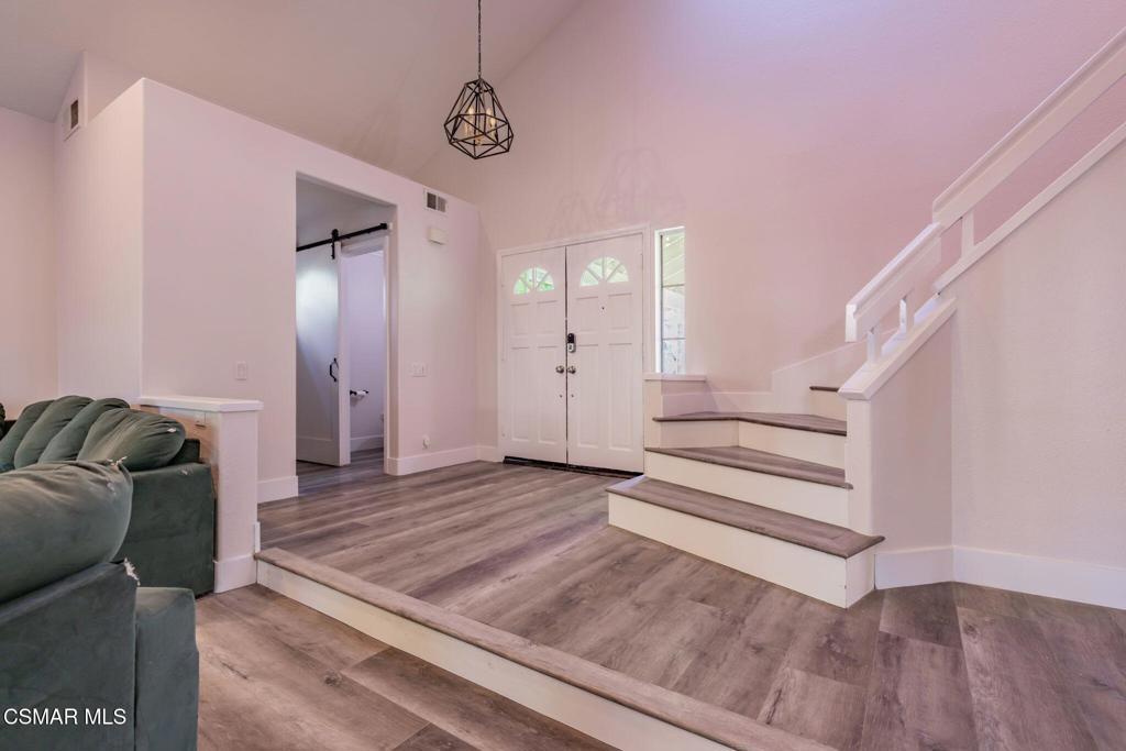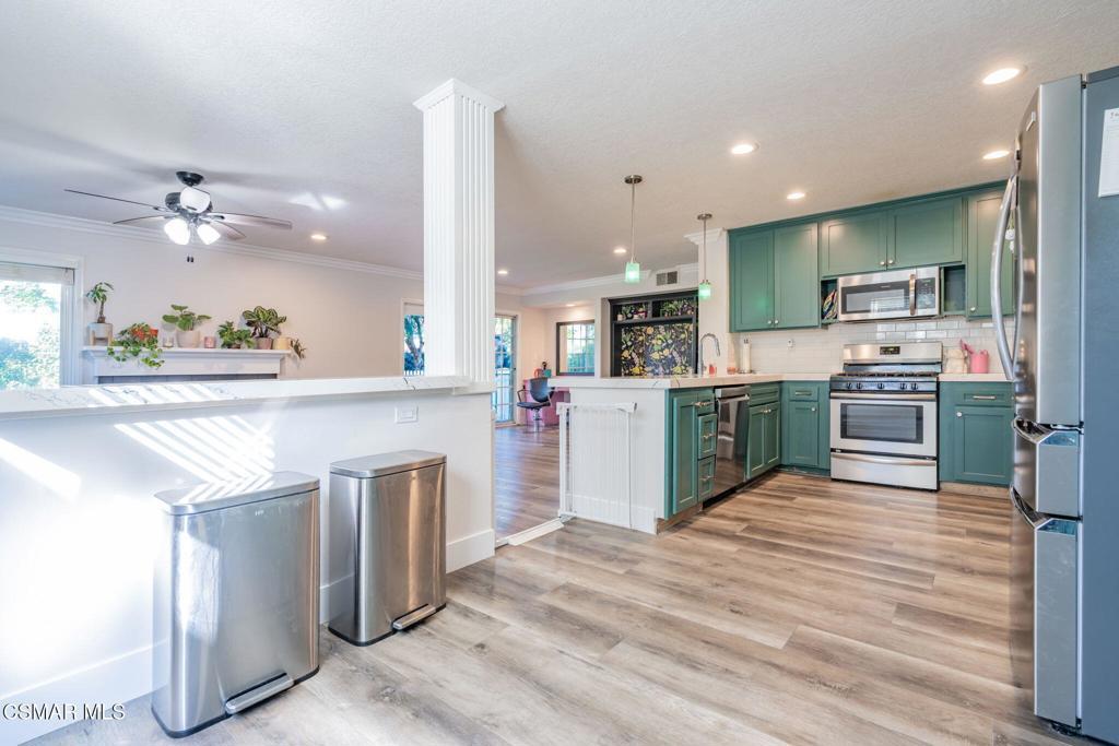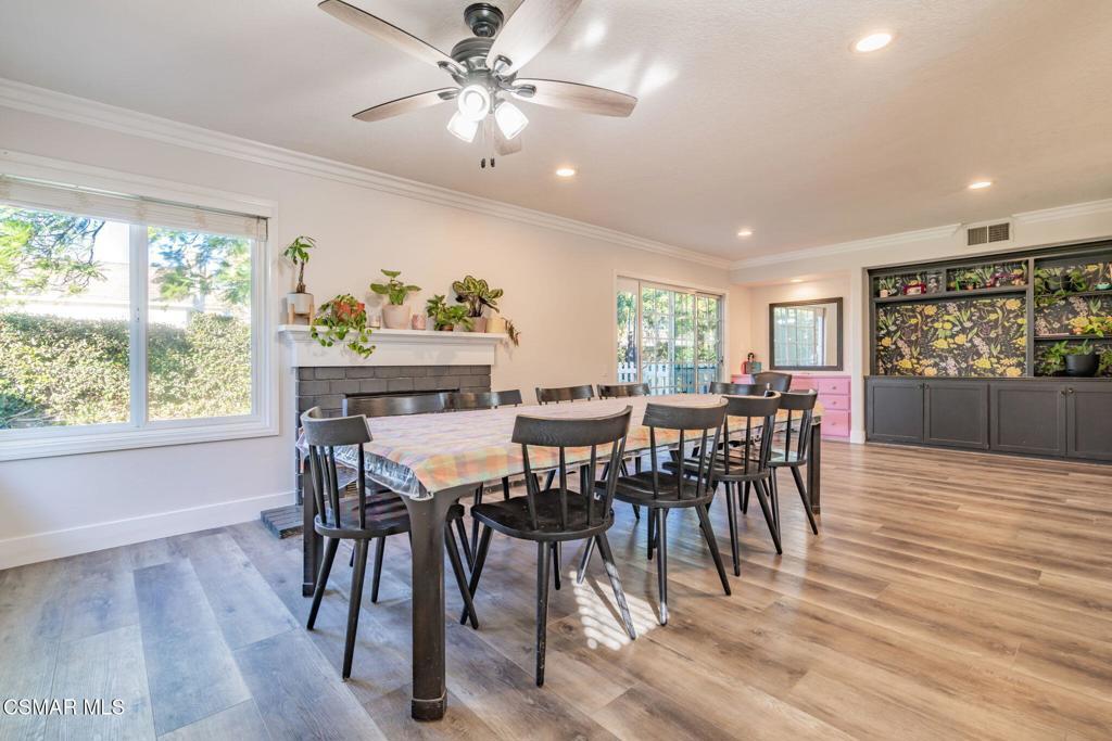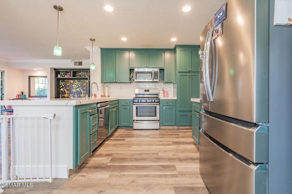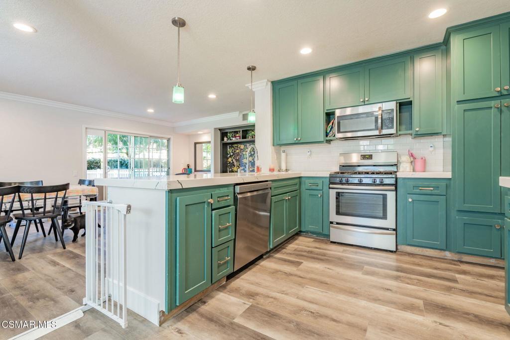 Welcome to this upgraded Moorpark home where space, style, and function come together.This 4 bedroom, 3 bath residence spans 2,645 square feet and shows pride of ownership throughout. The kitchen stands out with quartz countertops, stainless steel appliances, and clean modern finishes. Wood look vinyl flooring flows through the home, paired with recessed lighting, crown molding, and dual pane vinyl windows and sliders for comfort and efficiency.The living room makes a strong first impression with vaulted ceilings and abundant natural light. Two fireplaces add warmth and character, including one in the primary retreat. The primary suite feels private and relaxing, designed as a true escape.Downstairs offers a flexible room ideal for a fifth bedroom, home office, or formal dining area. The backyard features low maintenance turf, perfect for entertaining or easy everyday living.The three car garage includes a Tesla charger, built in workbench, and extensive storage cabinets and shelving. Organized. Functional. Ready to go.Newer exterior paint and fresh interior paint.