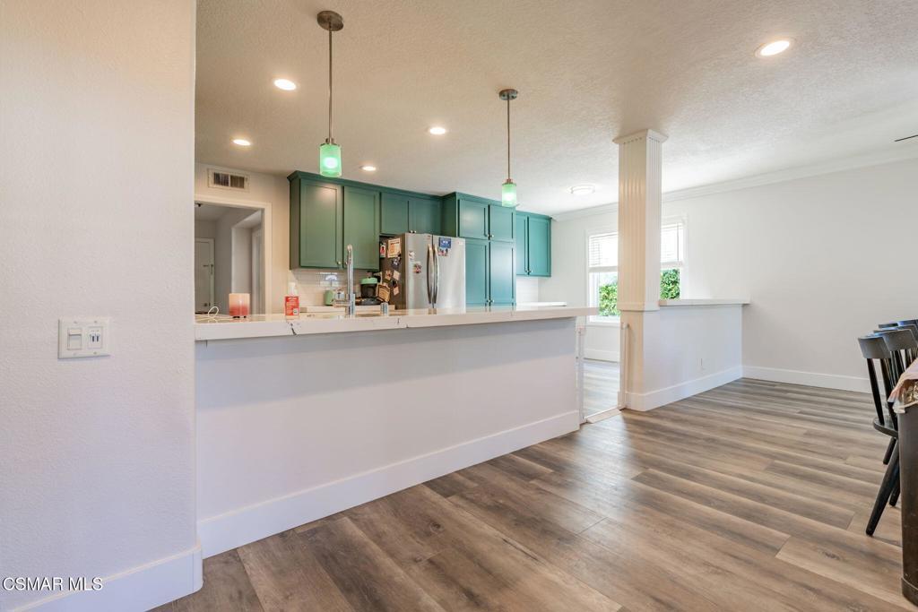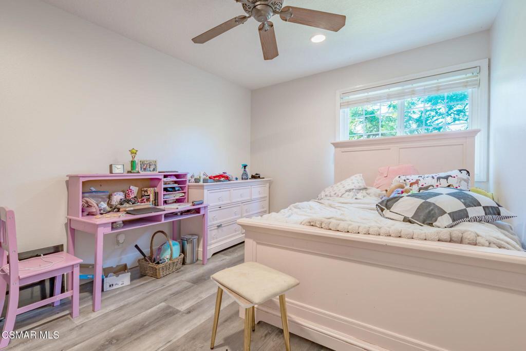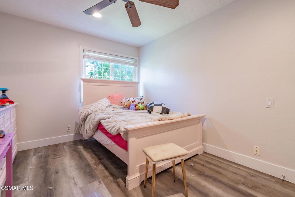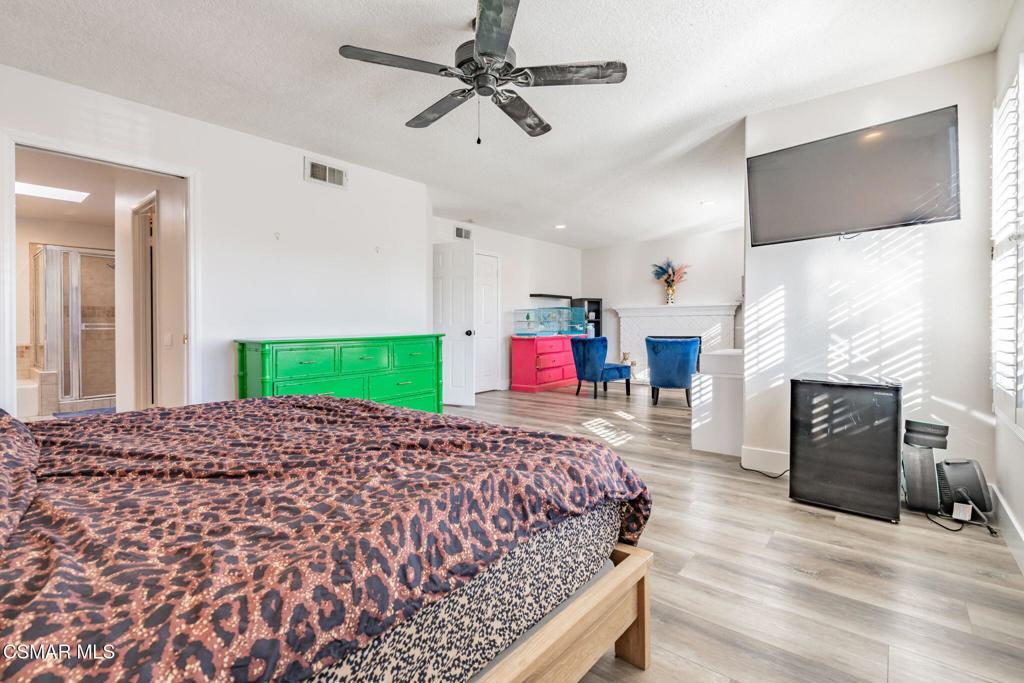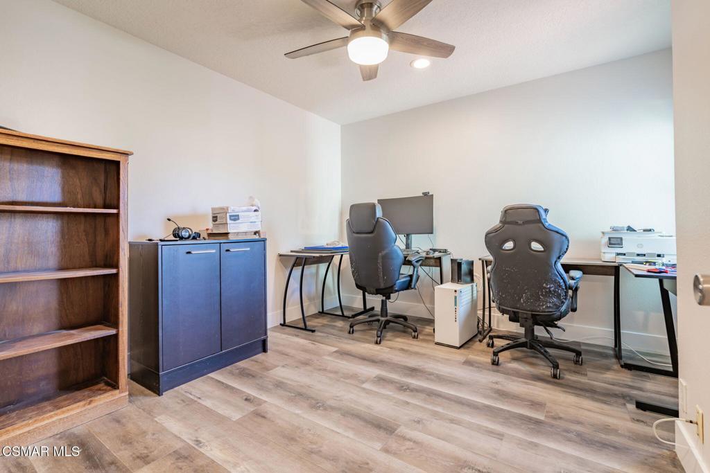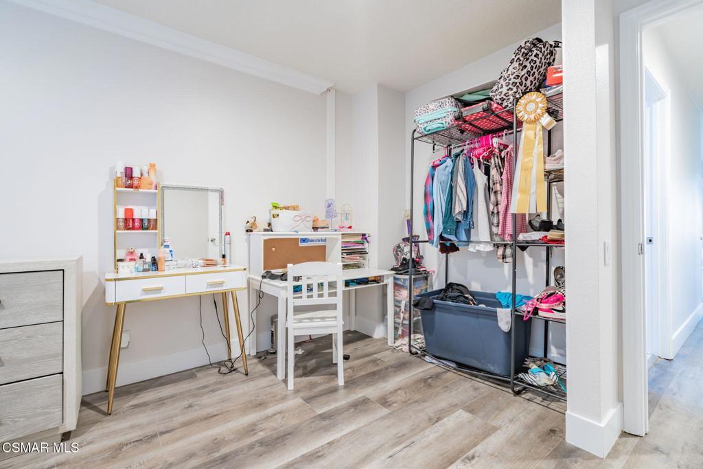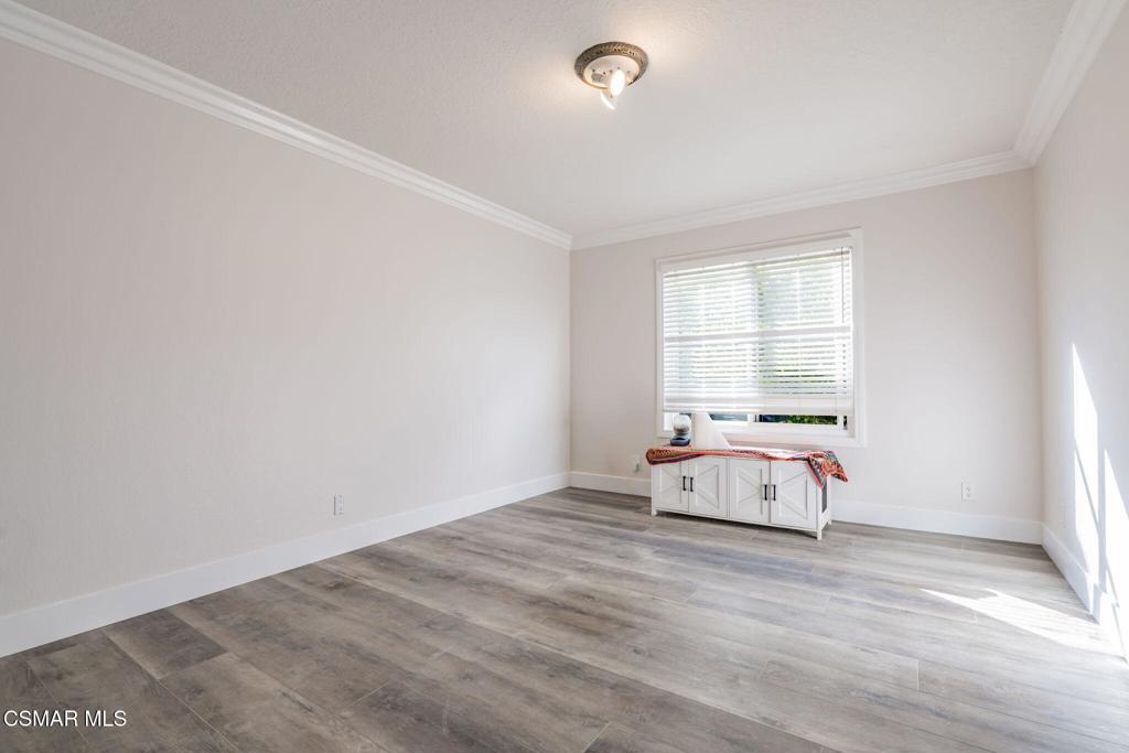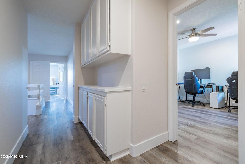 Welcome to this upgraded Moorpark home where space, style, and function come together.This 4 bedroom, 3 bath residence spans 2,645 square feet and shows pride of ownership throughout. The kitchen stands out with quartz countertops, stainless steel appliances, and clean modern finishes. Wood look vinyl flooring flows through the home, paired with recessed lighting, crown molding, and dual pane vinyl windows and sliders for comfort and efficiency.The living room makes a strong first impression with vaulted ceilings and abundant natural light. Two fireplaces add warmth and character, including one in the primary retreat. The primary suite feels private and relaxing, designed as a true escape.Downstairs offers a flexible room ideal for a fifth bedroom, home office, or formal dining area. The backyard features low maintenance turf, perfect for entertaining or easy everyday living.The three car garage includes a Tesla charger, built in workbench, and extensive storage cabinets and shelving. Organized. Functional. Ready to go.Newer exterior paint and fresh interior paint.