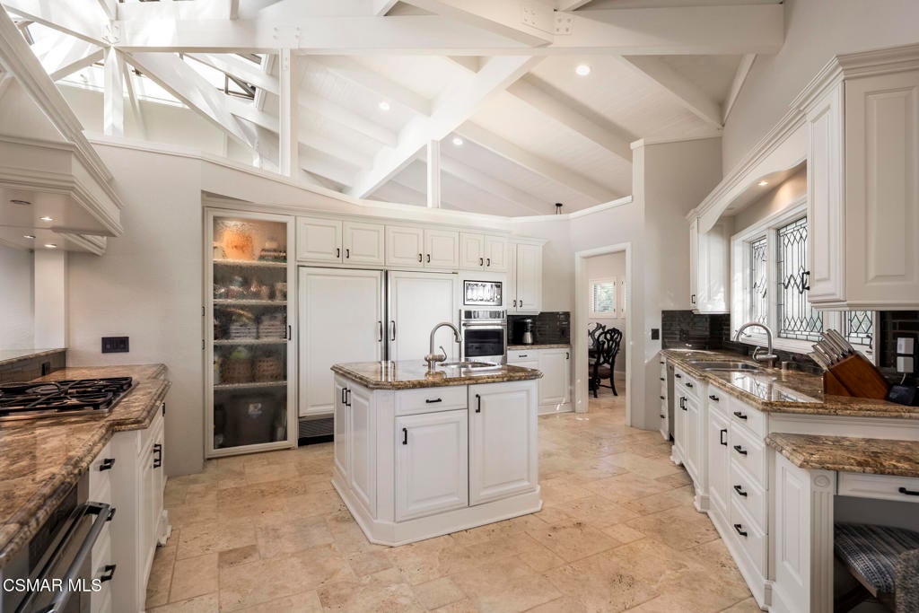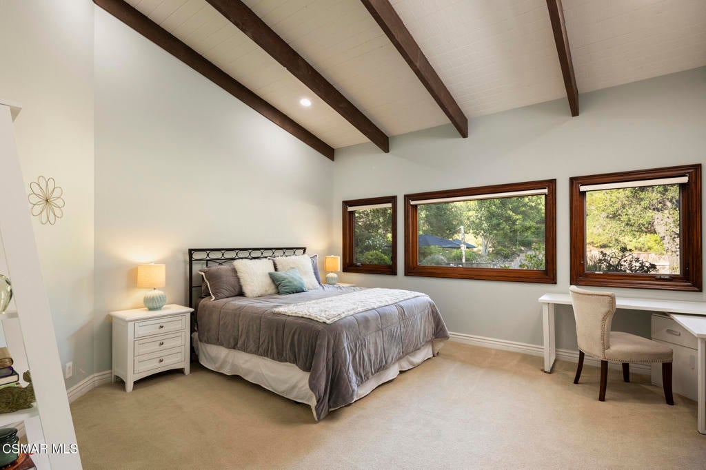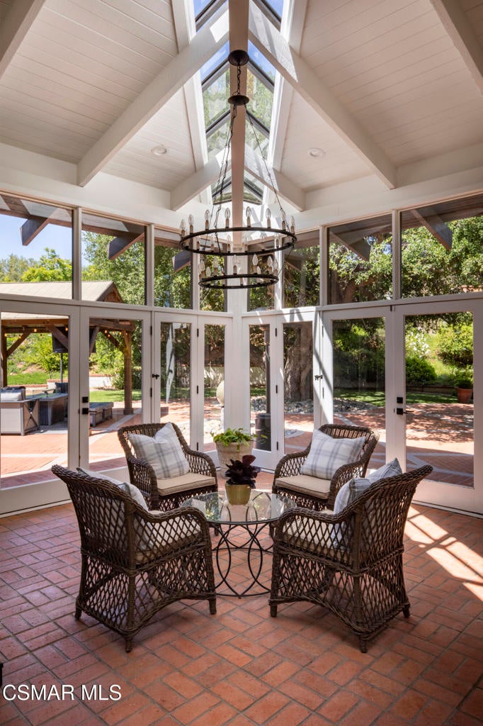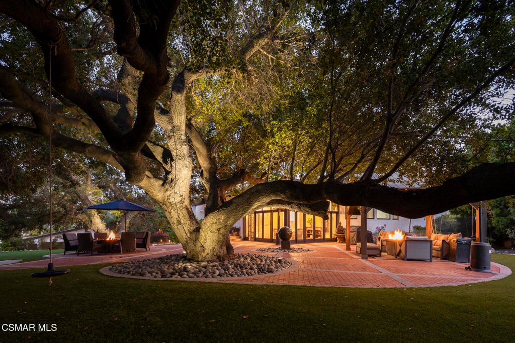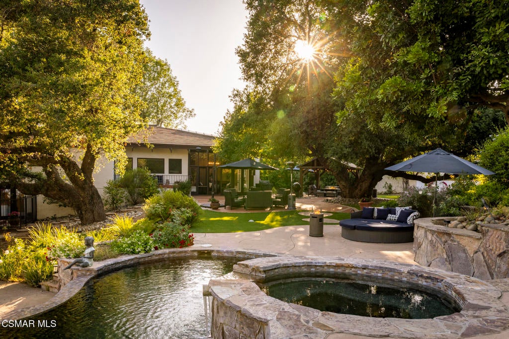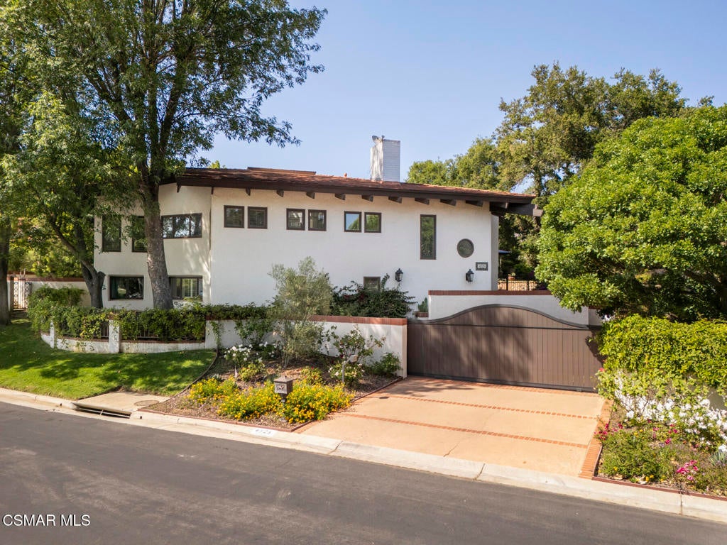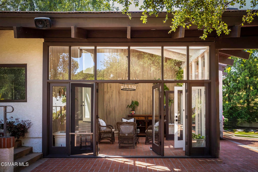 FURNISHED RENTAL! 3 Month Minimum! When the original developer of North Ranch chose his homesite in the mid 1980's, he chose 4525 Rayburn St. Dotted with majestic coastal oaks, the 29,000 SF property offered a unique serenity with a gentle rolling topography affording the architect/builder the freedom to create a genuine sanctuary. Nothing captures the spirit of man's interaction with the natural world than the one of a kind glass pyramid skylight located in the center of the soaring ceiling. The airiness and voluminous space intersect crisscrossing lumber beams, creating a sense of wonder and bliss. The tongue and groove wooden ceiling coupled with the afore mentioned beams, evoke man's connection to nature and the heavens, while the travertine floors anchor the soul to the earth. With more than 4,500 SF, including the sensational glass garden room or the detached 3 car garage/ gym and billiard hall, the space is all encompassing and engrossing. With the primary and a 2nd large ensuite on the main level, plus the kitchen, powder and open family room, this home lives easy and casual while the formal dining room is ready to meet any occasion. The lower level consists of two more bedrooms, a bath, laundry and an open entertainment room which could serve as bed 5 should your needs require it. Stepping through the main level French doors into the garden room, you feel the towering angular glass and wood ceiling, the walls of glass and used brick floor as a transition to the outside world. The yard is park like, with the sound of water cascading from the pool and its tiled water well and the walled yard features a gated circular driveway. The 3 car garage has been converted into a gym and fabulous pool hall replete with bench, barstools and pool table. Behind the garage is a small fruit tree orchard and gardening area. Additional amenities include remodeled baths, stunning millwork, both a built-in refrigerator and separate freezer along with top of the line appliances. Near the prestigious North Ranch Country Club, the finest shopping and both public and private educational opportunities, this gated estate suits everyone from the most down to earth to the most cosmopolitan.