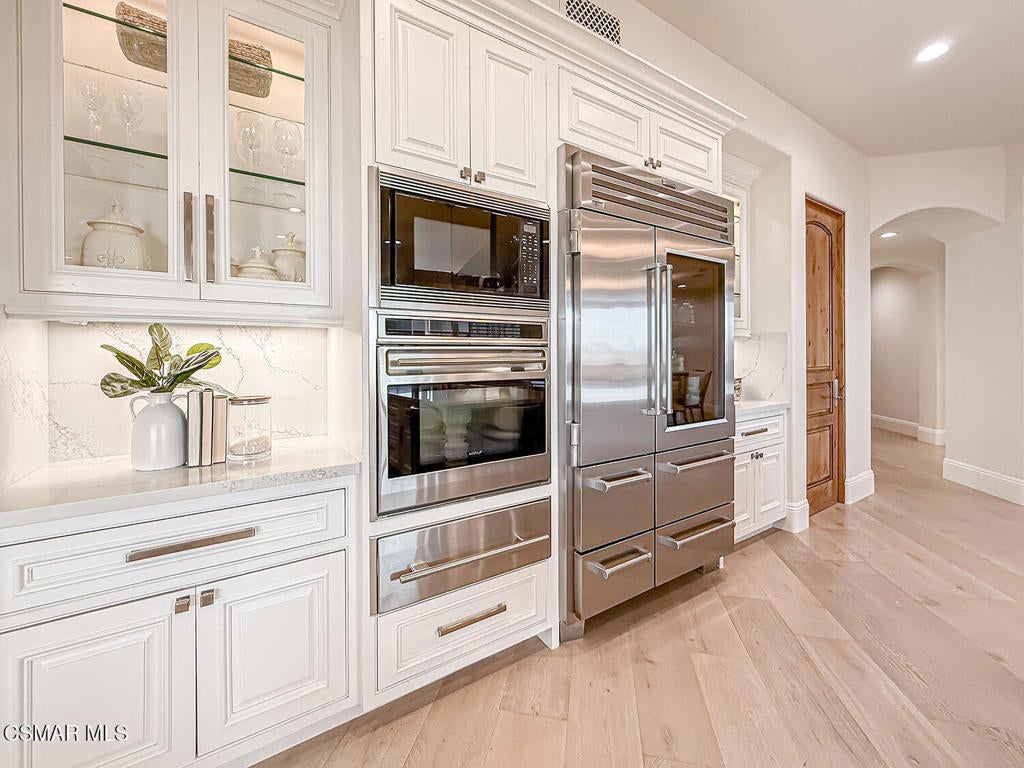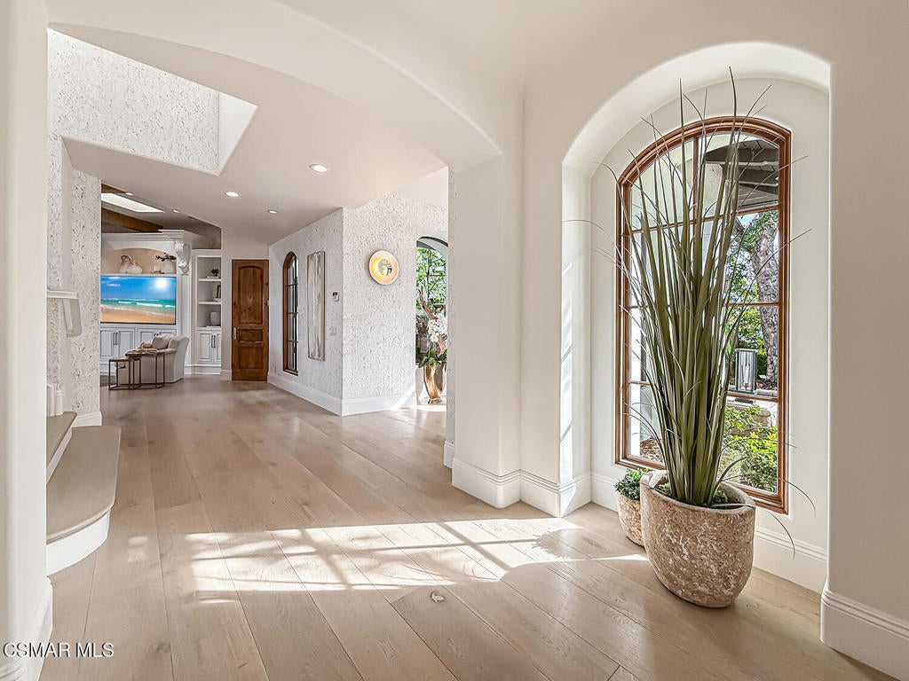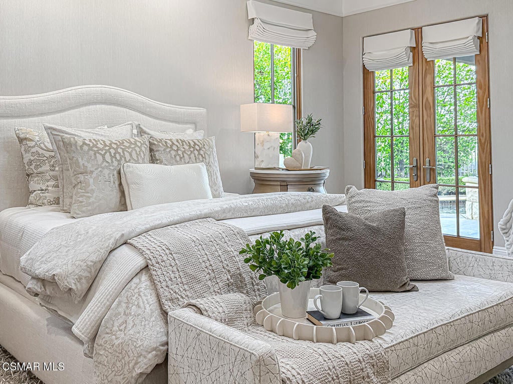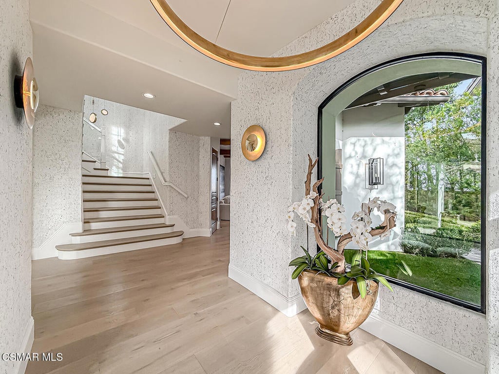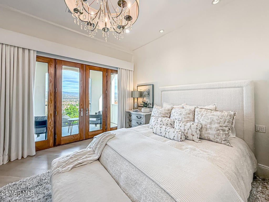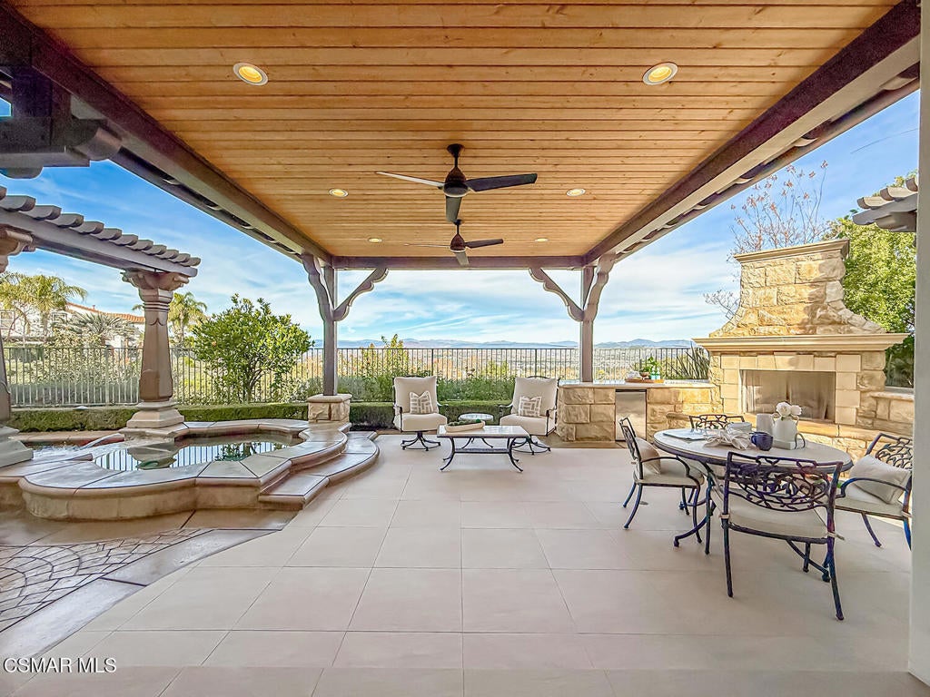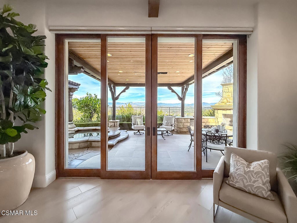 Welcome Home. The property is nestled within the prestigious, gated community of Westridge Estates. This exceptional residence offers privacy, beauty, and timeless elegance. The neighborhood features mature tree-lined streets, wide roadways, and low HOA dues--creating a peaceful and inviting atmosphere. Situated on a quiet cul-de-sac, the property enjoys breathtaking views of rolling mountains and treetops from the balcony. Inspired by Mediterranean architecture, the home showcases refined details and graceful lines--from smooth bullnose corners and curved archways to newly installed designer light fixtures that set a warm, sophisticated ambiance throughout. This residence has been extensively upgraded with superior materials and craftsmanship. From the impressive double-door entry to the added picture windows, every detail has been thoughtfully curated. Designer corkboard wallpaper with subtle metallic silver and gold accents flows throughout much of the first floor, adding texture and understated luxury. Designed for Living & Entertaining Offering approximately 5,652 square feet of living space (per assessor), the home is both expansive and inviting. The formal living room flows seamlessly into the dining room, while the open-concept family room and kitchen create an ideal setting for everyday living and entertaining. Warm faux wood beams add character and architectural interest. This is California living at its finest. Enjoy surround sound, a motorized Nano Wall that effortlessly connects indoor and outdoor spaces, and a resort-style backyard featuring an outdoor fireplace, built-in barbecue, private pool, and spa. A beautifully designed enclosed patio cover allows for year-round entertaining, while the grassy yard and fruit trees complete this serene retreat. Culinary Delight The chef's kitchen is as stunning as it is functional, filled with natural light and designed for both entertaining and serious cooking: Oversize island single slab Calcutta Gold Quartz plus countertops, and backsplashes Custom-built range hood with integrated spice storage Wolf 6-burner gas range with griddle and double ovens Stove top - Pot filler faucet Extensive custom cabinetry throughout Wolf stainless steel microwave, third oven, and warming drawer Sub-Zero refrigerator and freezer Sub-Zero refrigerator and freezer drawers Two stainless steel double dishwashers Under-counter ice machine Custom wine showcase cabinet with wine refrigerator and wine accessory drawer Farmhouse sink at the island plus a secondary double sink for added convenience. Comfort & Luxury The home offers five bedrooms and four-and-a-half bathrooms. Two of which are primary suites--one upstairs and one downstairs. The downstairs primary suite is a true sanctuary. An elevator, located just across the hall, provides easy access to the upstairs living areas--offering comfort, convenience, and accessibility. The staircase is a showpiece, with a captivating focal point from the newly installed light fixture. The space is amplified by the use of frameless glass railings that maximize light, enhance safety, and provide unobstructed views of your surroundings. Upstairs Living The second and third bedrooms upstairs have also been tastefully renovated, offering their own upgraded bathroom and private oversized closet. There is also a home office with custom-built-in cabinetry- showcasing your refined workspace. The upstairs primary suite is spacious, inviting, and filled with lots of luxury comforts. From the high ceilings, double French doors to gain access to your private balcony, to the frameless glass railings, and the Stunning view. The ensuite bathroom includes a soaking tub area, full-slab Taj Mahal Quartzite double shower with bench, inlay marble flooring, dual vanities, new countertops, and updated hardware. An upgraded laundry room completes the upper level, blending beauty with everyday functionality.
