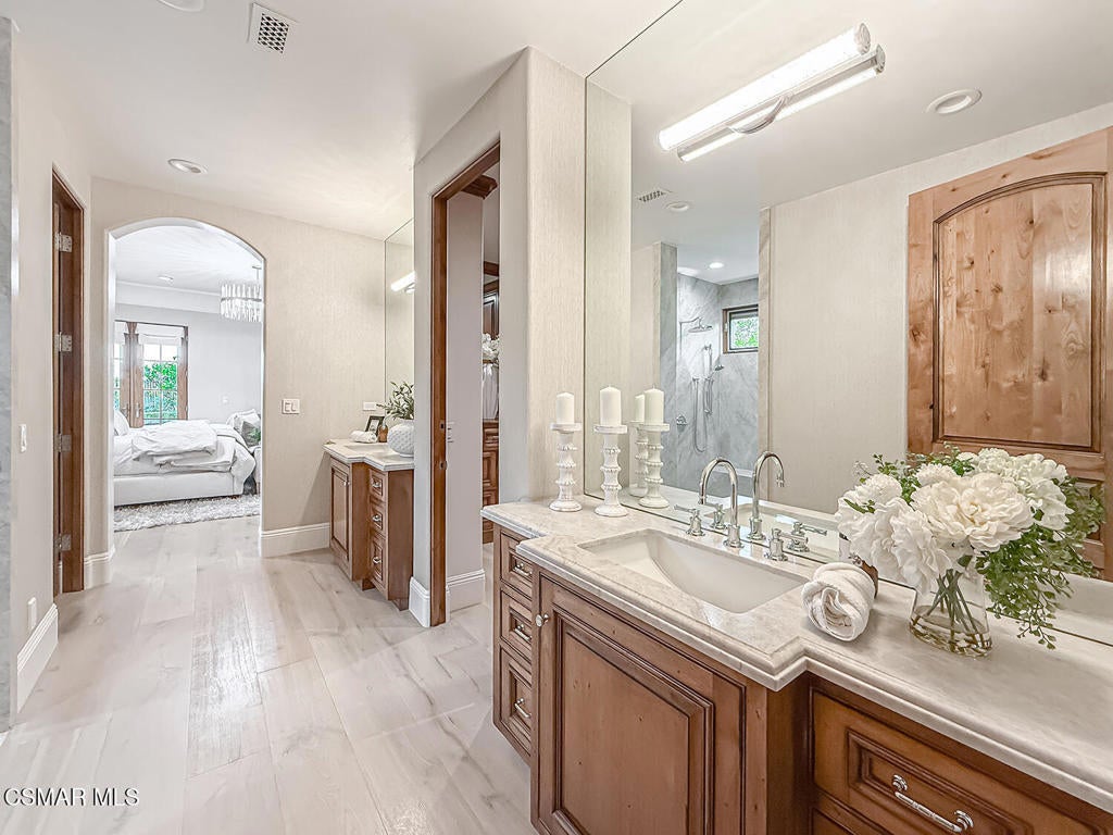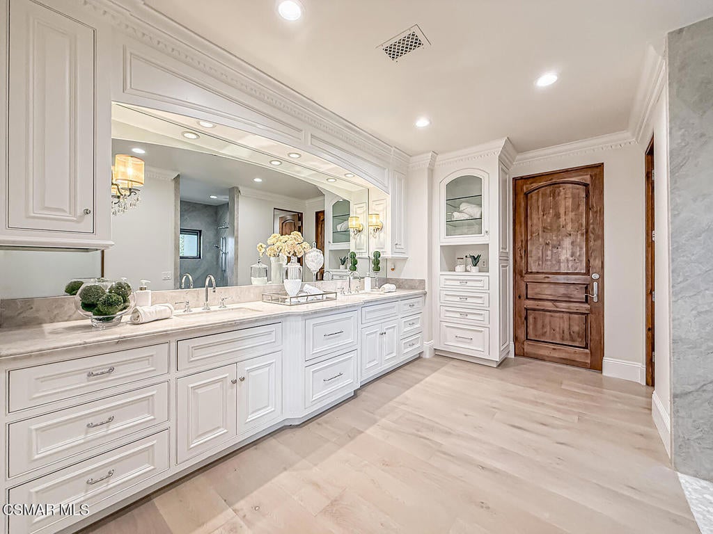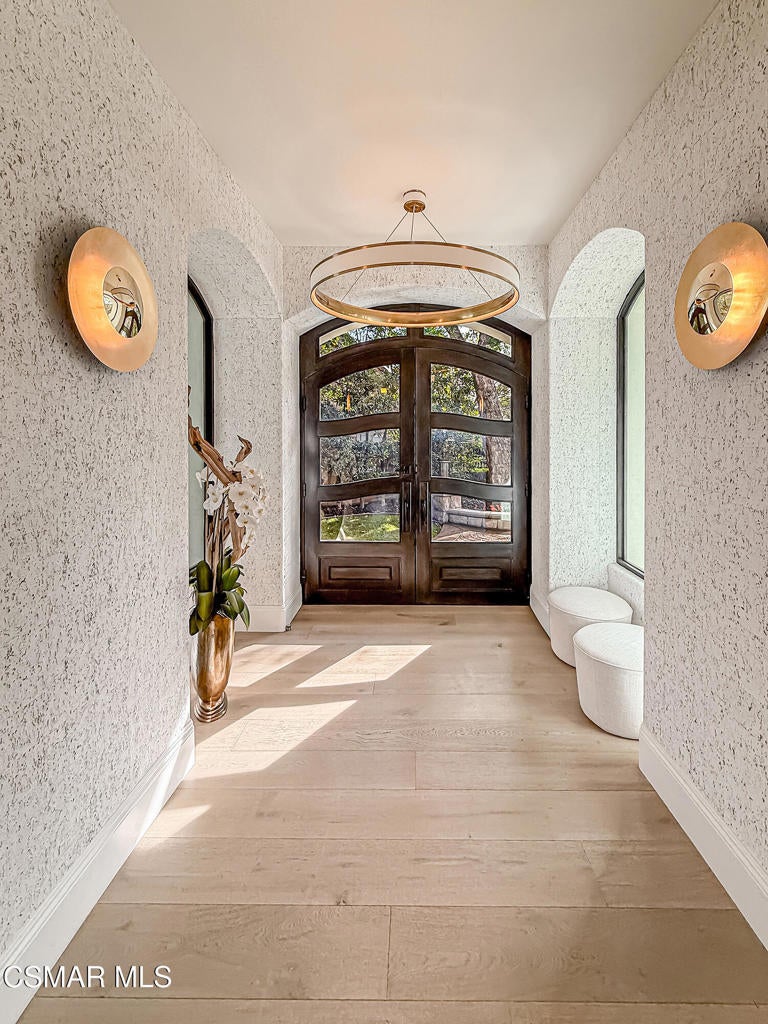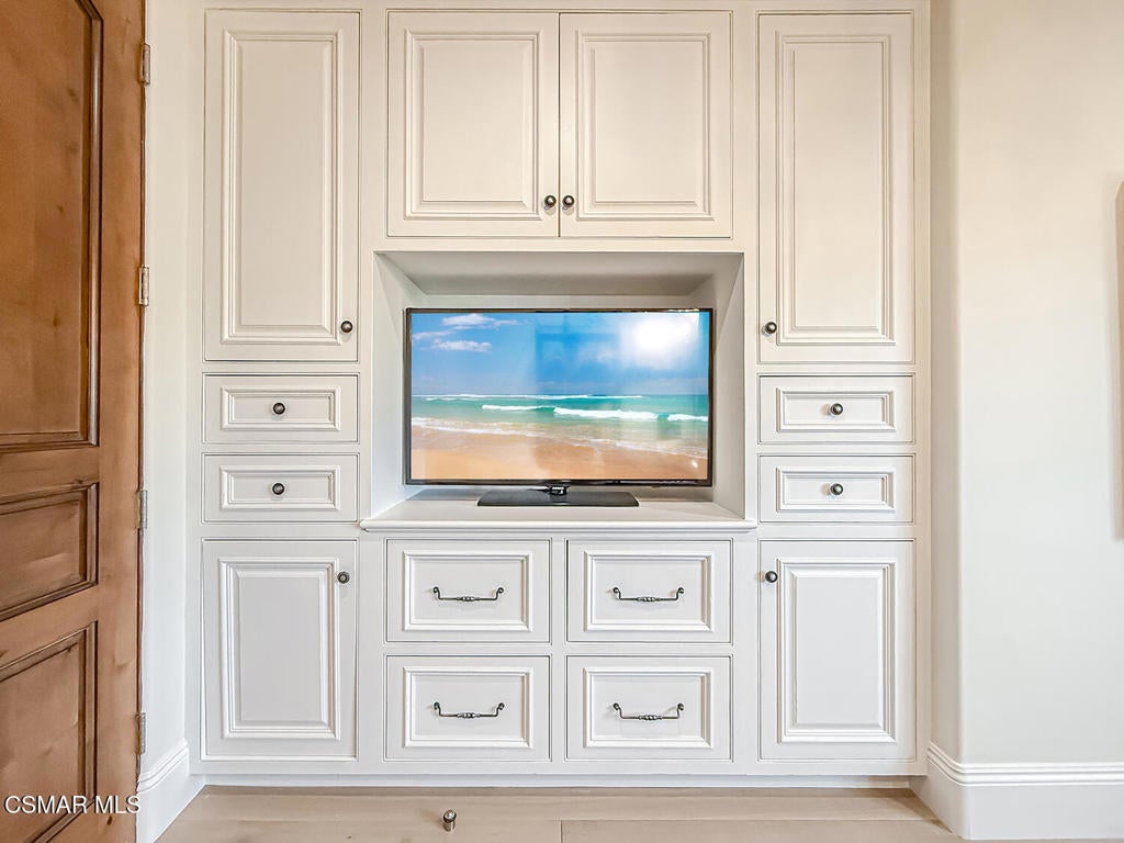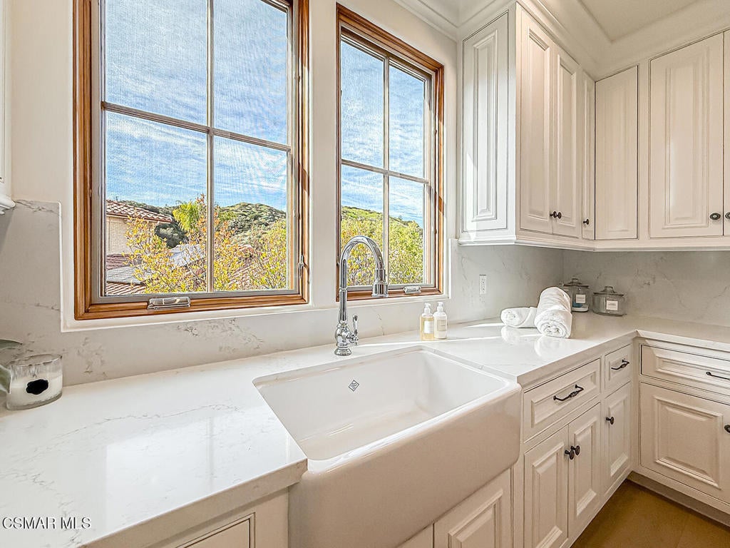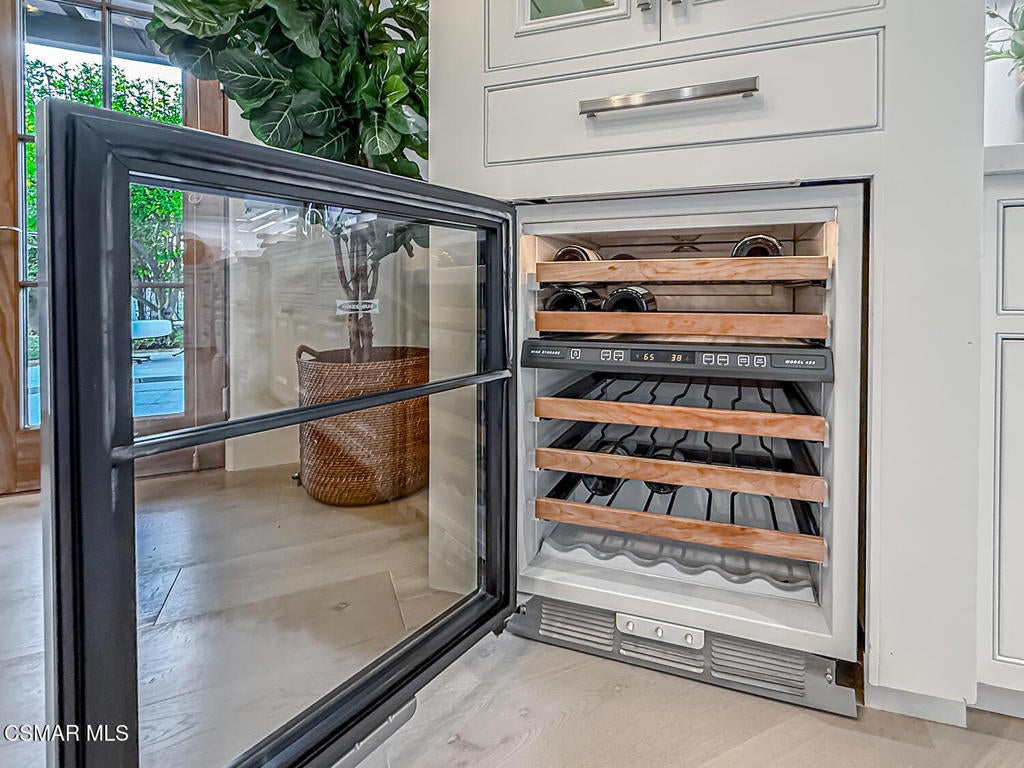 Welcome Home. The property is nestled within the prestigious, gated community of Westridge Estates. This exceptional residence offers privacy, beauty, and timeless elegance. The neighborhood features mature tree-lined streets, wide roadways, and low HOA dues--creating a peaceful and inviting atmosphere. Situated on a quiet cul-de-sac, the property enjoys breathtaking views of rolling mountains and treetops from the balcony. Inspired by Mediterranean architecture, the home showcases refined details and graceful lines--from smooth bullnose corners and curved archways to newly installed designer light fixtures that set a warm, sophisticated ambiance throughout. This residence has been extensively upgraded with superior materials and craftsmanship. From the impressive double-door entry to the added picture windows, every detail has been thoughtfully curated. Designer corkboard wallpaper with subtle metallic silver and gold accents flows throughout much of the first floor, adding texture and understated luxury. Designed for Living & Entertaining Offering approximately 5,652 square feet of living space (per assessor), the home is both expansive and inviting. The formal living room flows seamlessly into the dining room, while the open-concept family room and kitchen create an ideal setting for everyday living and entertaining. Warm faux wood beams add character and architectural interest. This is California living at its finest. Enjoy surround sound, a motorized Nano Wall that effortlessly connects indoor and outdoor spaces, and a resort-style backyard featuring an outdoor fireplace, built-in barbecue, private pool, and spa. A beautifully designed enclosed patio cover allows for year-round entertaining, while the grassy yard and fruit trees complete this serene retreat. Culinary Delight The chef's kitchen is as stunning as it is functional, filled with natural light and designed for both entertaining and serious cooking: Oversize island single slab Calcutta Gold Quartz plus countertops, and backsplashes Custom-built range hood with integrated spice storage Wolf 6-burner gas range with griddle and double ovens Stove top - Pot filler faucet Extensive custom cabinetry throughout Wolf stainless steel microwave, third oven, and warming drawer Sub-Zero refrigerator and freezer Sub-Zero refrigerator and freezer drawers Two stainless steel double dishwashers Under-counter ice machine Custom wine showcase cabinet with wine refrigerator and wine accessory drawer Farmhouse sink at the island plus a secondary double sink for added convenience. Comfort & Luxury The home offers five bedrooms and four-and-a-half bathrooms. Two of which are primary suites--one upstairs and one downstairs. The downstairs primary suite is a true sanctuary. An elevator, located just across the hall, provides easy access to the upstairs living areas--offering comfort, convenience, and accessibility. The staircase is a showpiece, with a captivating focal point from the newly installed light fixture. The space is amplified by the use of frameless glass railings that maximize light, enhance safety, and provide unobstructed views of your surroundings. Upstairs Living The second and third bedrooms upstairs have also been tastefully renovated, offering their own upgraded bathroom and private oversized closet. There is also a home office with custom-built-in cabinetry- showcasing your refined workspace. The upstairs primary suite is spacious, inviting, and filled with lots of luxury comforts. From the high ceilings, double French doors to gain access to your private balcony, to the frameless glass railings, and the Stunning view. The ensuite bathroom includes a soaking tub area, full-slab Taj Mahal Quartzite double shower with bench, inlay marble flooring, dual vanities, new countertops, and updated hardware. An upgraded laundry room completes the upper level, blending beauty with everyday functionality.