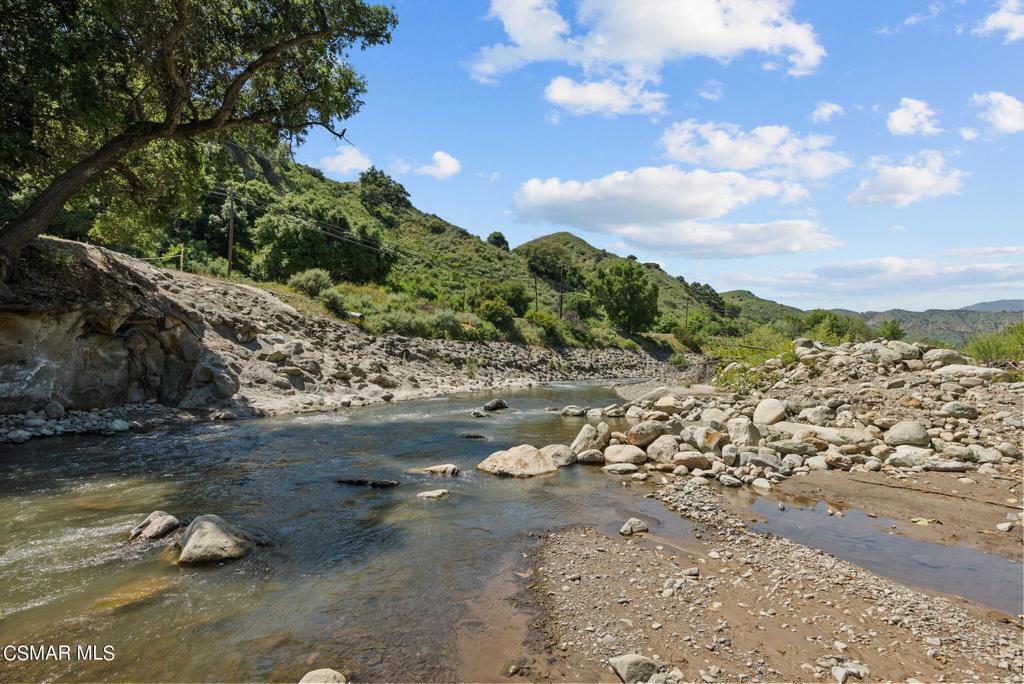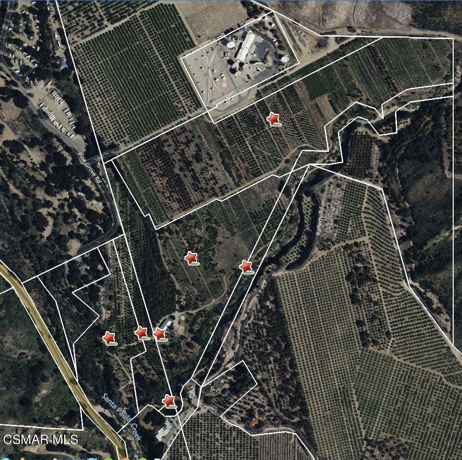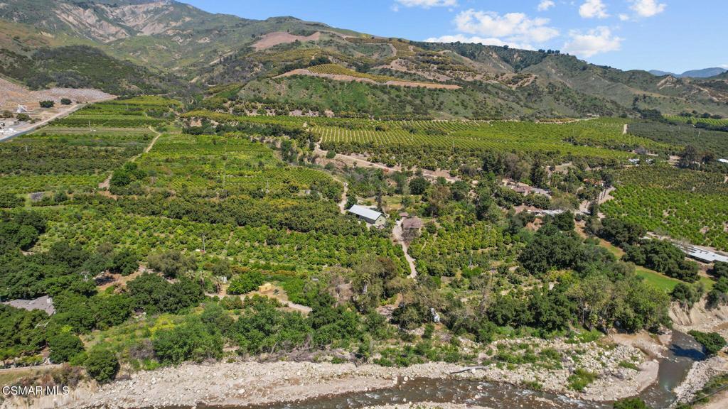 An ideal weekend getaway and rare opportunity to own over 59 acres of pure paradise. Privately gated and majestically bordered by Santa Paula Creek and Mud Creek, this extraordinary ranch offers a peaceful escape surrounded by flowing water, rolling acreage, and sweeping mountain and valley views. The property features excellent water resources, including adjudicated riparian rights from Santa Paula Creek, irrigation water for crops, and city water serving the residences, supporting both lifestyle enjoyment and agricultural use. Approximately 56 acres are planted with a thriving variety of mature fruit trees, including avocados, lemons, grapefruit, multiple orange varieties, apricots, figs, mulberries, and more, creating a beautiful and productive retreat setting. Two charming ranch residences provide flexibility and comfort. The main house (2 bed + 1.5 bath) offers living, dining, and laundry rooms, a remodeled kitchen with stainless steel appliances and Wolf range, granite countertops, and an updated primary bath with travertine, separate tub, and shower. A guest ranch house (2 bed + 1 bath) with fenced yard is ideal for guests or a caretaker. A spacious barn approx. 3,200 sq. ft. with three oversized bay doors provides excellent storage and versatility for ranch equipment, creative projects, or events, and plans for a potential new residence are in place with partial foundation completed, offering future expansion potential. Whether enjoying quiet mornings streamside, taking in the sounds of flowing water, or simply escaping the pace of everyday life, this is a one-of-a-kind sanctuary perfect as a weekend retreat, agricultural haven, or legacy estate.