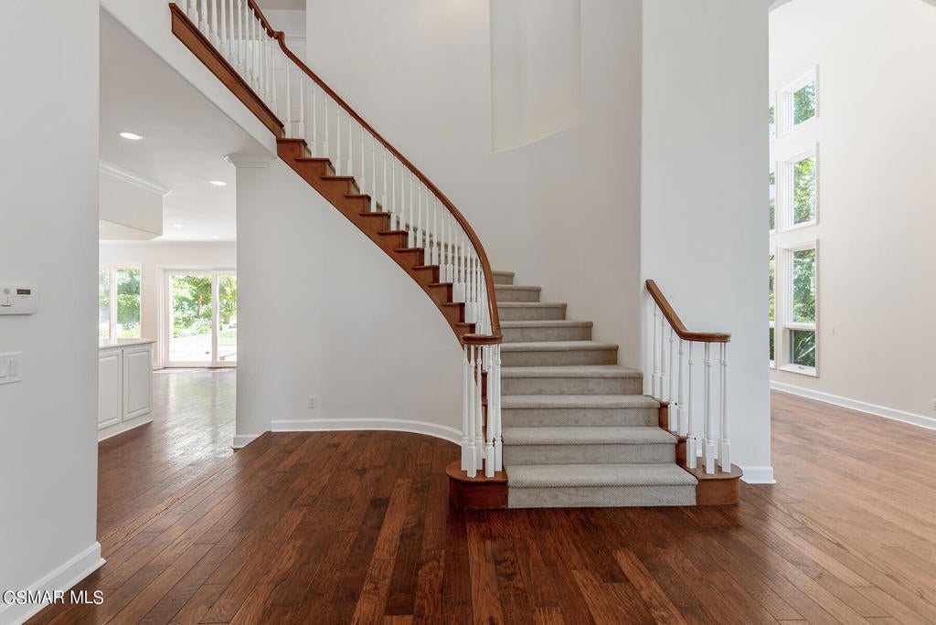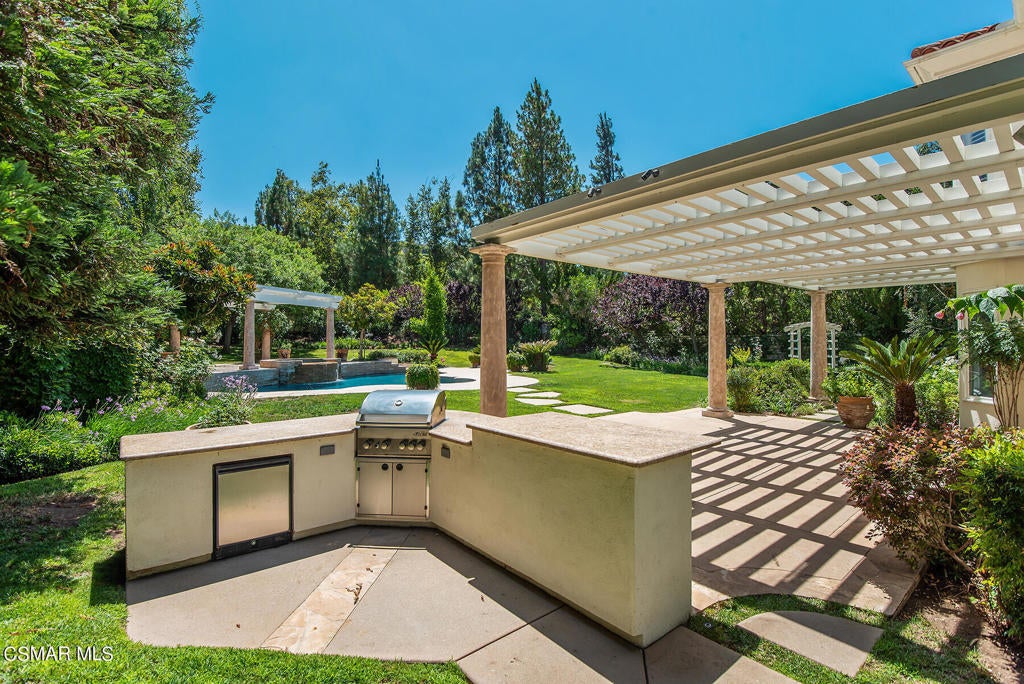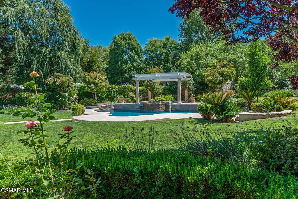 Sited on a beautiful tree-lined street in the heart of Westlake Village. One of the prettiest yards in Westlake! Park-like grounds with a new gazebo, newer refinished sparkling pool and spa. Meticulously maintained and updated Westlake Trails home. Dramatic vaulted ceilings in the formal living room with fireplace and formal dining room perfect for entertaining family and friends. Newly remodeed gourmet's island kitchen that opens to the family room with fireplace and wet bar. Primary suite features a fireplace and an additional closet along one wall. Ensuite down. Desirable and large media/play room or possible 5th bedroom. Desirable office/library downstairs with built-ins. Security system. Newer carpet and paint throughout. Newly remodeled baths. Newer landscaping. Property does not back to Lindero Canyon Rd. Award winning Las Virgenes School District. Close to the Lake, Westlake Tennis and Swim Club, The Landing with fine dining and shopping and Stonehaus! Close to walking, hiking and biking trails. Relax and entertain at this exceptional Westlake home.