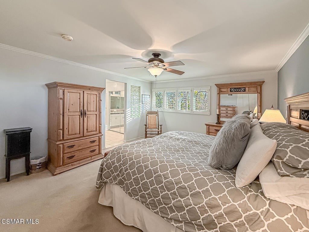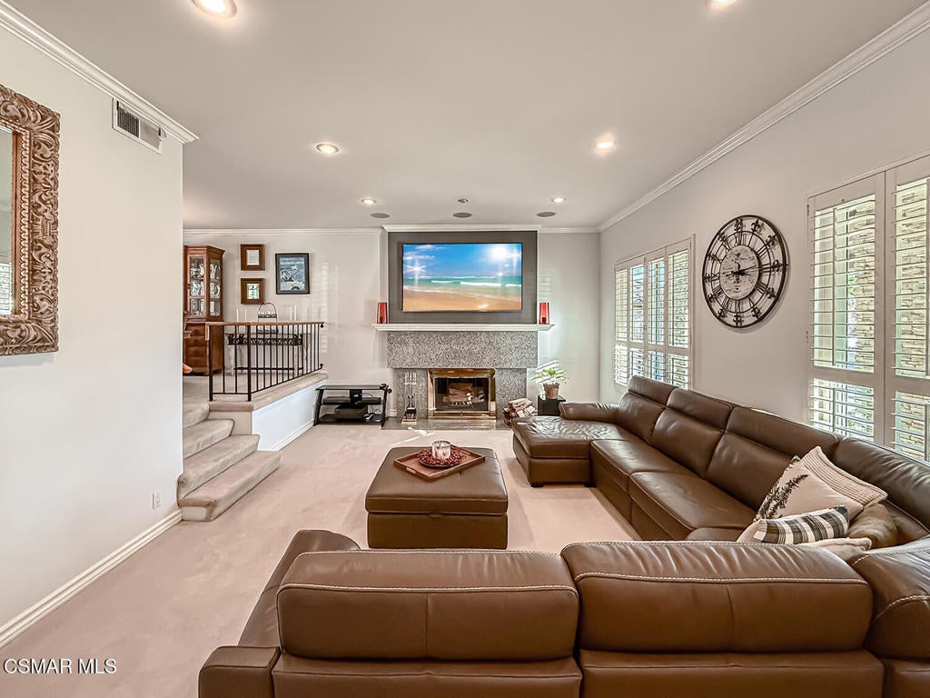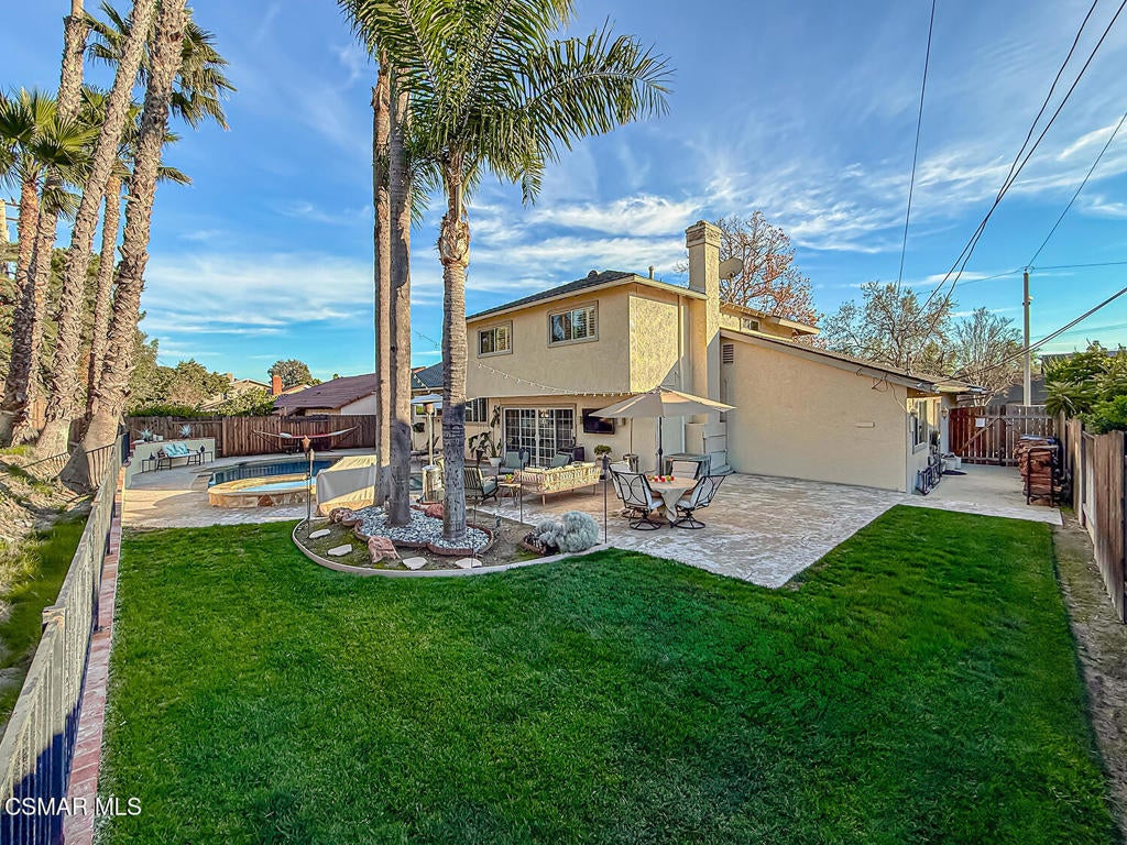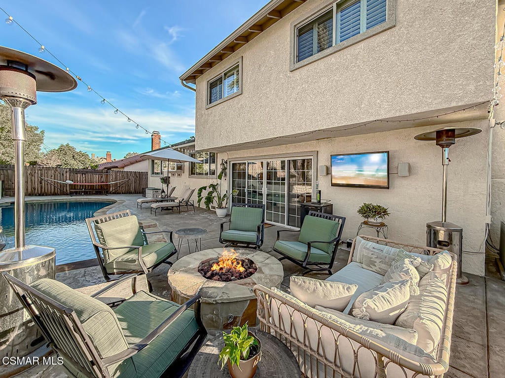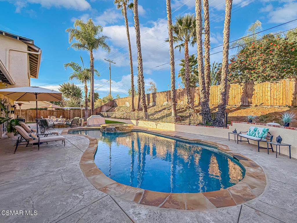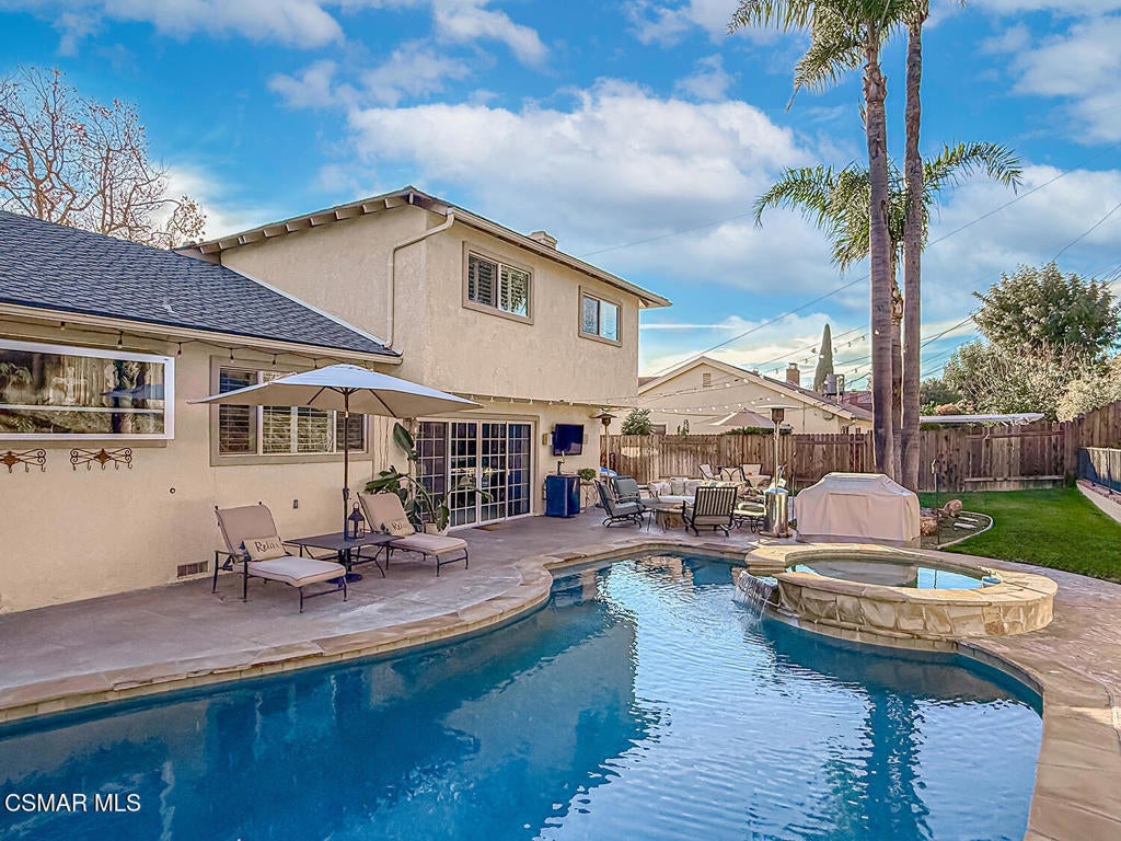Upgraded POOL Home with 5 Bedrooms, 3 Bathrooms, and a 3-Car Garage in Central Thousand Oaks--Set on a Wide Lot with Charming Curb Appeal, Flexible Living Spaces, and a Private Backyard Retreat! From the moment you arrive, this stunning home impresses with its handsomely redone stacked-stone accents, a brick-ribboned walking path, manicured landscaping, and an inviting front porch that sets a welcoming tone. Step through the elegant beveled-glass double entry doors and you're greeted by an open and BRIGHT interior with soaring ceilings, UPGRADED wood-like flooring, and natural light pouring in from tall windows and glass doors throughout. The Living Room creates an inviting space for conversation or relaxation with plantation shutters, recessed lighting, and a GRANITE-surfaced gas fireplace with a floating wood mantle. Adjacent, the Formal Dining Room provides the perfect setting for holiday meals and everyday entertaining, framed by plantation-shuttered windows and tall ceilings that enhance the sense of elegance and space.The GOURMET Kitchen is a chef's delight--highlighted by sprawling granite countertops, DOUBLE ovens, stainless-steel Frigidaire Gallery appliances (including a 5-burner GAS cooktop), a deep pantry with pull-out shelving, and a sunny informal dining area with backyard views. A garden window above the sink brings in additional light and adds charm to everyday meal prep. Just off the Kitchen, the Family Room feels both cozy and elevated with a DRAMATIC wall-length stone-surfaced fireplace, a fully equipped wet bar, sliding glass doors to the backyard, and an extra coat/storage closet.Downstairs, a 3/4 Bathroom has been UPGRADED with wood-like flooring, a stylish vanity, and a tile-walled shower with glass enclosure. Off the front entry sits a downstairs Bedroom/Office with glass French doors and plantation-shuttered windows--perfect as a private workspace or guest room. An additional Downstairs Bedroom near the laundry area is generously sized and outfitted with a ceiling fan, plantation shutters, and convenient access to the garage and bathroom--an ideal setup for multi-generational living.The Formal Laundry Room is located inside, upgraded with wood-like flooring and direct access to the finished 3-Car Garage, which includes built-in storage cabinetry and a pull-down ladder leading to a storage-ready attic. Upstairs, you'll find two more Secondary Bedrooms that offer comfortable accommodations with plantation shutters, bifold closets, ceiling fans, and views to the backyard. The Upstairs Hall Bathroom is complete with tile flooring, a tile-wrapped tub/shower combo, and built-in vanity for convenience and functionality.The Primary Suite is a peaceful upstairs retreat featuring a spacious bedroom layout with plantation-shuttered windows, ceiling fan, and ample closet space. Its en-suite bathroom includes tile flooring, a mirrored wardrobe closet, a tile-topped vanity, and a remodeled tile-walled shower with a frameless glass enclosure.The Backyard is an entertainer's paradise! Enjoy the pebble-finished in-ground pool and above-ground spa, surrounded by STAMPED colored concrete patios and multiple lounging and dining zones. A built-in stone-surfaced firepit adds warmth and ambiance, while mature palm trees and hillside greenery create a peaceful and PRIVATE setting. An upper hillside space offers potential for future landscaping or garden expansion.Additional highlights include elegant crown molding throughout the home and easy access to Thousand Oaks' best offerings--WALKABILITY to Wildwood Park's hiking & biking trails, tennis courts, soccer fields, and playgrounds. Close proximity to Los Robles Hospital, Thousand Oaks High School, the Janss Marketplace, and restaurants, with zoning for award-winning Conejo Valley Unified Schools. This is a truly special home offering SPACE, UPGRADES, and LOCATION!