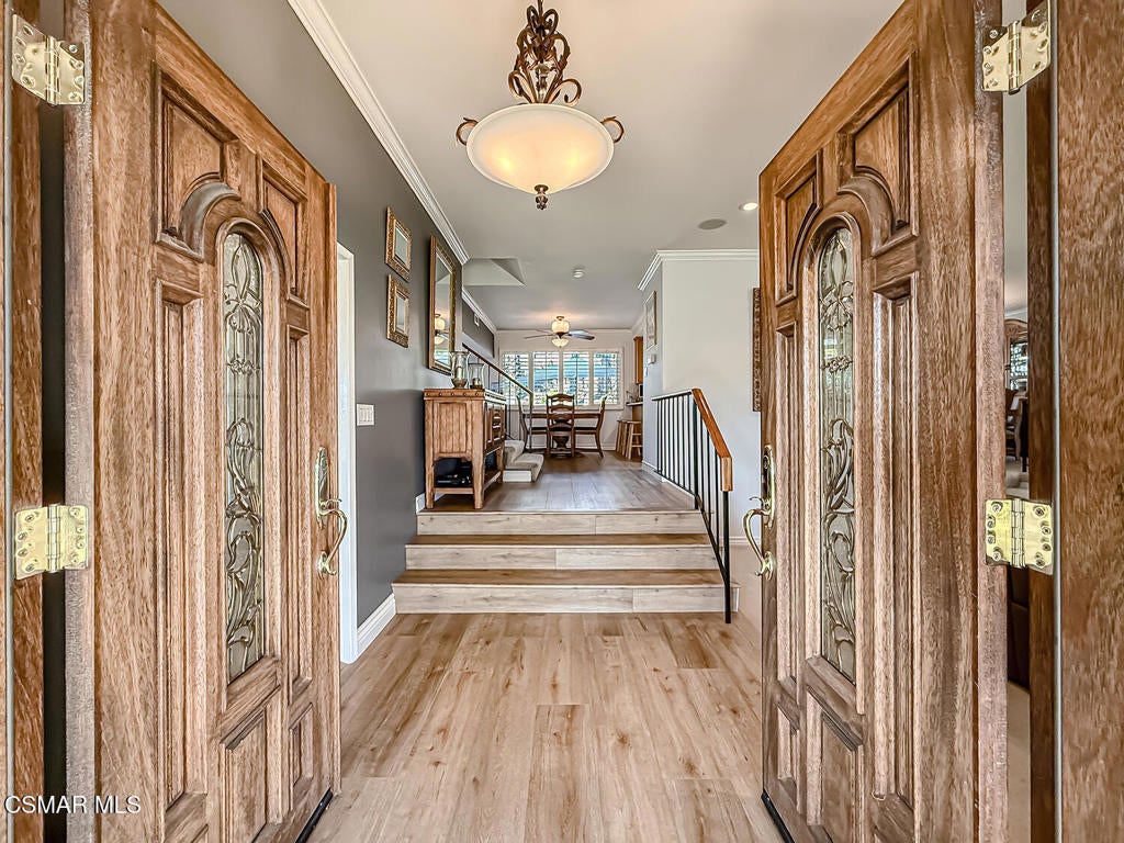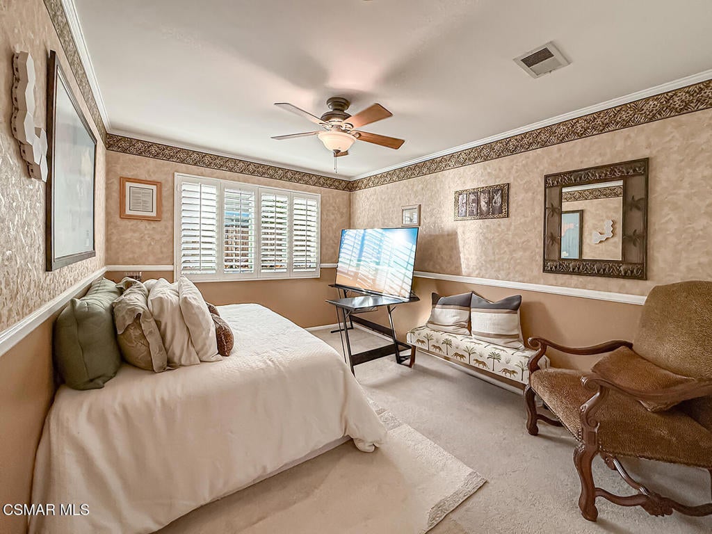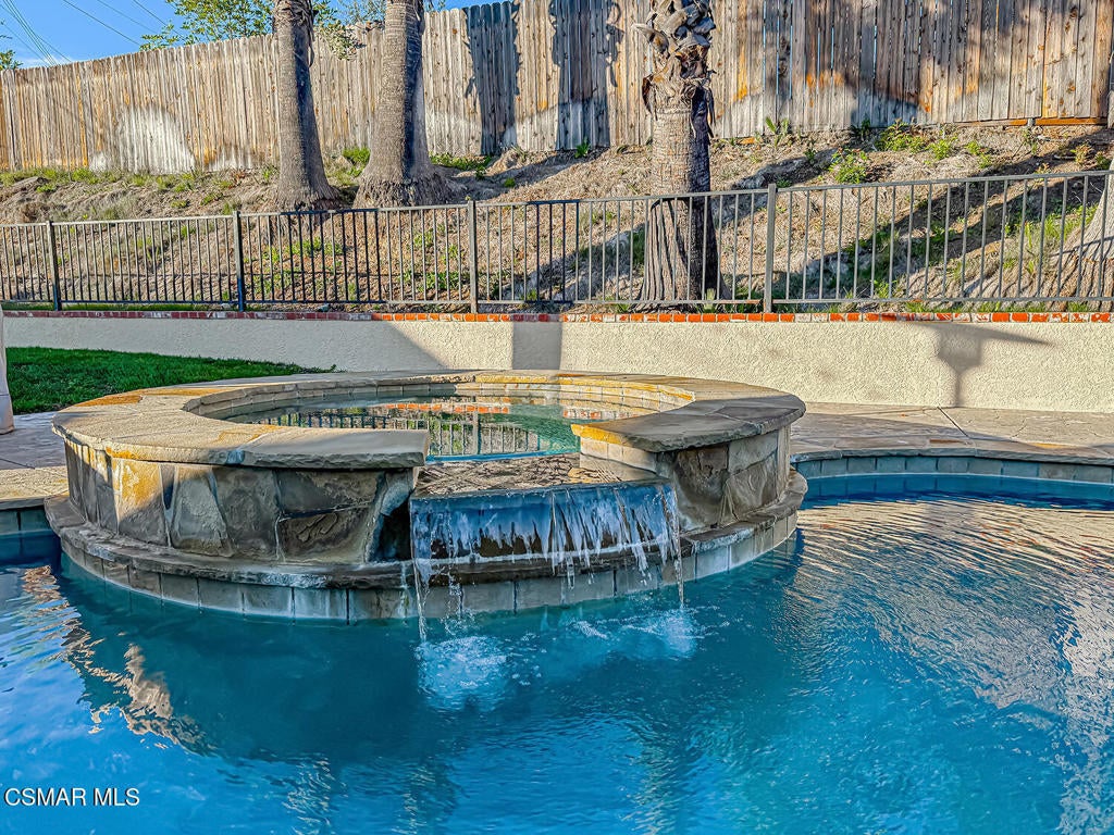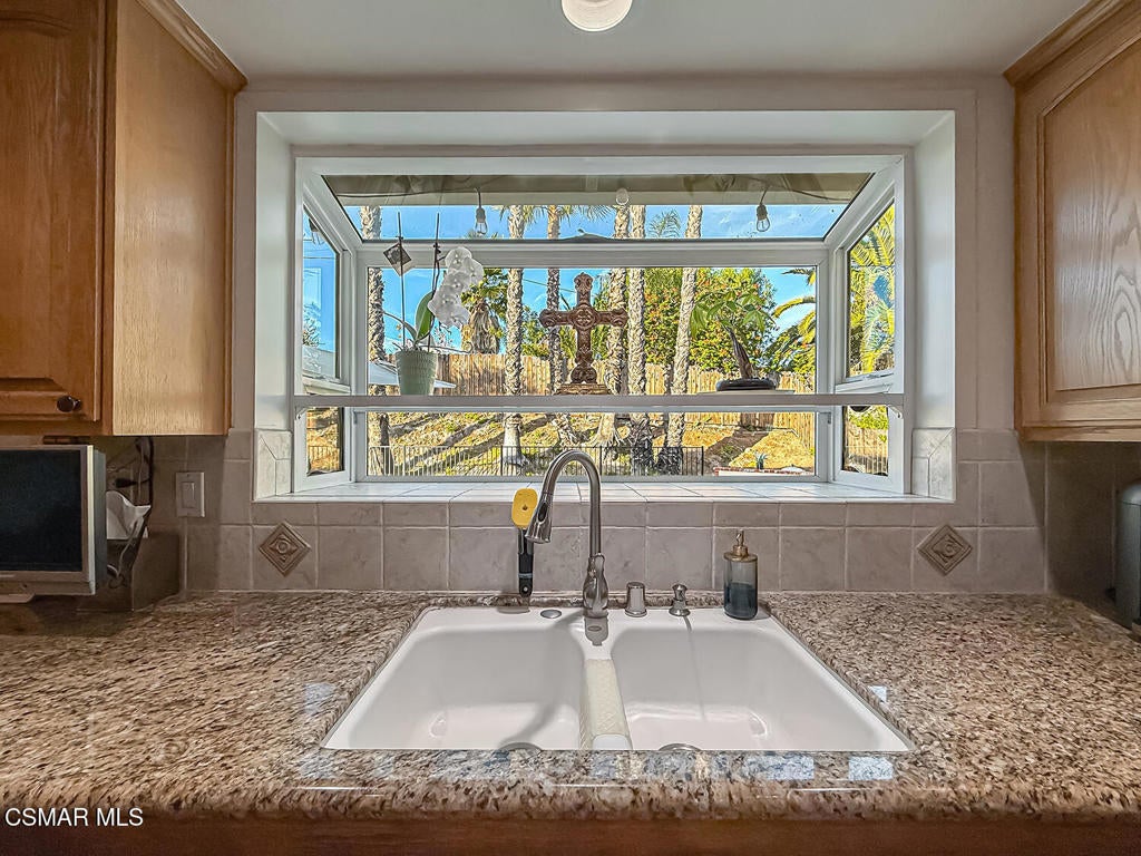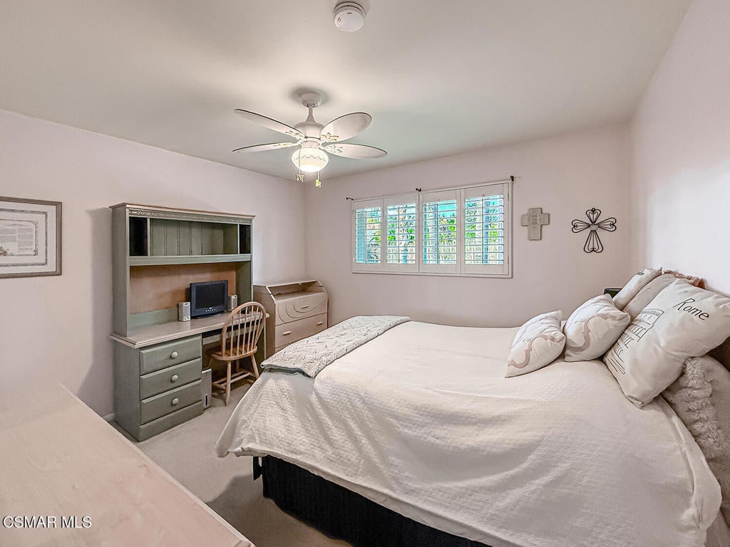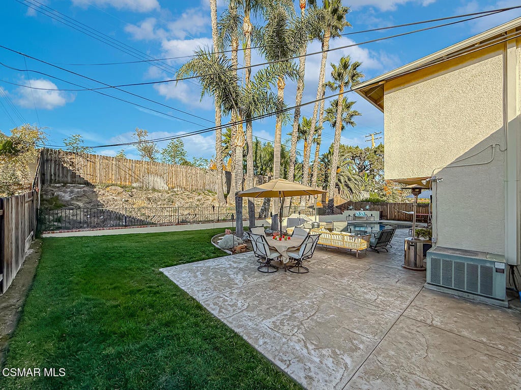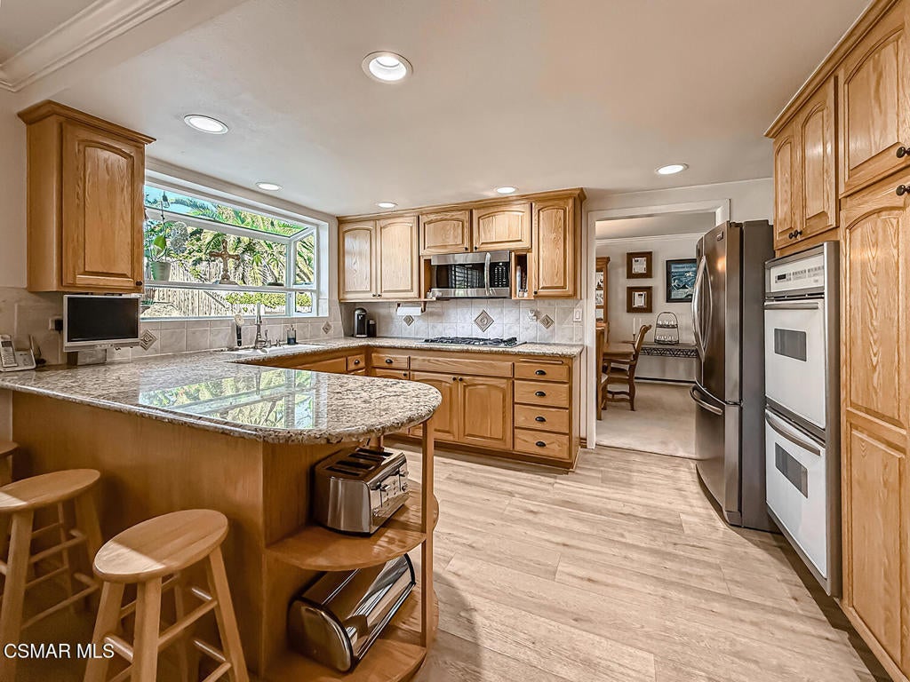Upgraded POOL Home with 5 Bedrooms, 3 Bathrooms, and a 3-Car Garage in Central Thousand Oaks--Set on a Wide Lot with Charming Curb Appeal, Flexible Living Spaces, and a Private Backyard Retreat! From the moment you arrive, this stunning home impresses with its handsomely redone stacked-stone accents, a brick-ribboned walking path, manicured landscaping, and an inviting front porch that sets a welcoming tone. Step through the elegant beveled-glass double entry doors and you're greeted by an open and BRIGHT interior with soaring ceilings, UPGRADED wood-like flooring, and natural light pouring in from tall windows and glass doors throughout. The Living Room creates an inviting space for conversation or relaxation with plantation shutters, recessed lighting, and a GRANITE-surfaced gas fireplace with a floating wood mantle. Adjacent, the Formal Dining Room provides the perfect setting for holiday meals and everyday entertaining, framed by plantation-shuttered windows and tall ceilings that enhance the sense of elegance and space.The GOURMET Kitchen is a chef's delight--highlighted by sprawling granite countertops, DOUBLE ovens, stainless-steel Frigidaire Gallery appliances (including a 5-burner GAS cooktop), a deep pantry with pull-out shelving, and a sunny informal dining area with backyard views. A garden window above the sink brings in additional light and adds charm to everyday meal prep. Just off the Kitchen, the Family Room feels both cozy and elevated with a DRAMATIC wall-length stone-surfaced fireplace, a fully equipped wet bar, sliding glass doors to the backyard, and an extra coat/storage closet.Downstairs, a 3/4 Bathroom has been UPGRADED with wood-like flooring, a stylish vanity, and a tile-walled shower with glass enclosure. Off the front entry sits a downstairs Bedroom/Office with glass French doors and plantation-shuttered windows--perfect as a private workspace or guest room. An additional Downstairs Bedroom near the laundry area is generously sized and outfitted with a ceiling fan, plantation shutters, and convenient access to the garage and bathroom--an ideal setup for multi-generational living.The Formal Laundry Room is located inside, upgraded with wood-like flooring and direct access to the finished 3-Car Garage, which includes built-in storage cabinetry and a pull-down ladder leading to a storage-ready attic. Upstairs, you'll find two more Secondary Bedrooms that offer comfortable accommodations with plantation shutters, bifold closets, ceiling fans, and views to the backyard. The Upstairs Hall Bathroom is complete with tile flooring, a tile-wrapped tub/shower combo, and built-in vanity for convenience and functionality.The Primary Suite is a peaceful upstairs retreat featuring a spacious bedroom layout with plantation-shuttered windows, ceiling fan, and ample closet space. Its en-suite bathroom includes tile flooring, a mirrored wardrobe closet, a tile-topped vanity, and a remodeled tile-walled shower with a frameless glass enclosure.The Backyard is an entertainer's paradise! Enjoy the pebble-finished in-ground pool and above-ground spa, surrounded by STAMPED colored concrete patios and multiple lounging and dining zones. A built-in stone-surfaced firepit adds warmth and ambiance, while mature palm trees and hillside greenery create a peaceful and PRIVATE setting. An upper hillside space offers potential for future landscaping or garden expansion.Additional highlights include elegant crown molding throughout the home and easy access to Thousand Oaks' best offerings--WALKABILITY to Wildwood Park's hiking & biking trails, tennis courts, soccer fields, and playgrounds. Close proximity to Los Robles Hospital, Thousand Oaks High School, the Janss Marketplace, and restaurants, with zoning for award-winning Conejo Valley Unified Schools. This is a truly special home offering SPACE, UPGRADES, and LOCATION!