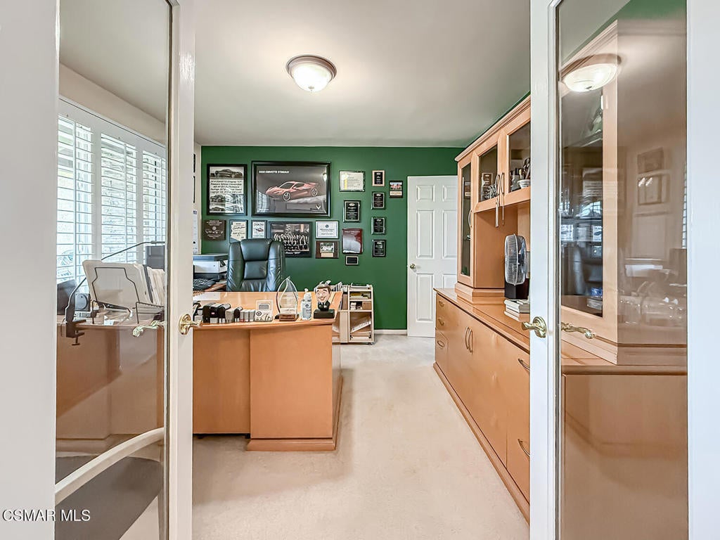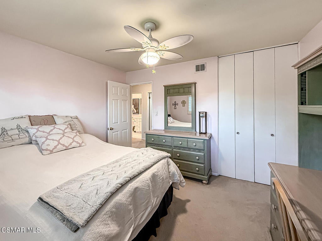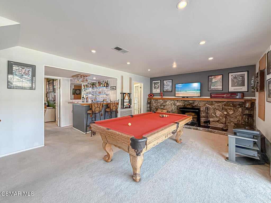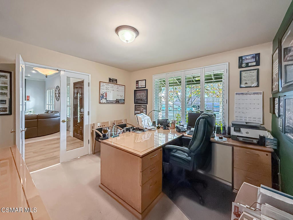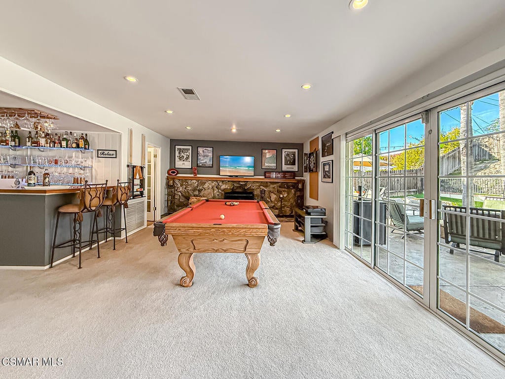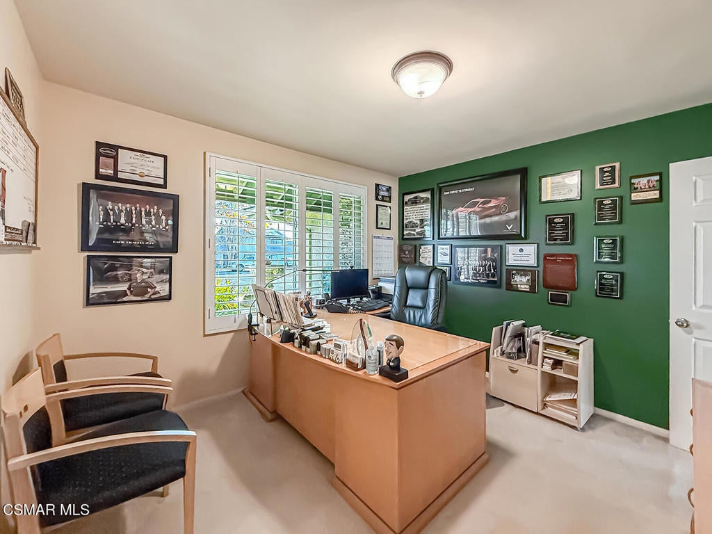 Upgraded POOL Home with 5 Bedrooms, 3 Bathrooms, and a 3-Car Garage in Central Thousand Oaks--Set on a Wide Lot with Charming Curb Appeal, Flexible Living Spaces, and a Private Backyard Retreat! From the moment you arrive, this stunning home impresses with its handsomely redone stacked-stone accents, a brick-ribboned walking path, manicured landscaping, and an inviting front porch that sets a welcoming tone. Step through the elegant beveled-glass double entry doors and you're greeted by an open and BRIGHT interior with soaring ceilings, UPGRADED wood-like flooring, and natural light pouring in from tall windows and glass doors throughout. The Living Room creates an inviting space for conversation or relaxation with plantation shutters, recessed lighting, and a GRANITE-surfaced gas fireplace with a floating wood mantle. Adjacent, the Formal Dining Room provides the perfect setting for holiday meals and everyday entertaining, framed by plantation-shuttered windows and tall ceilings that enhance the sense of elegance and space.The GOURMET Kitchen is a chef's delight--highlighted by sprawling granite countertops, DOUBLE ovens, stainless-steel Frigidaire Gallery appliances (including a 5-burner GAS cooktop), a deep pantry with pull-out shelving, and a sunny informal dining area with backyard views. A garden window above the sink brings in additional light and adds charm to everyday meal prep. Just off the Kitchen, the Family Room feels both cozy and elevated with a DRAMATIC wall-length stone-surfaced fireplace, a fully equipped wet bar, sliding glass doors to the backyard, and an extra coat/storage closet.Downstairs, a 3/4 Bathroom has been UPGRADED with wood-like flooring, a stylish vanity, and a tile-walled shower with glass enclosure. Off the front entry sits a downstairs Bedroom/Office with glass French doors and plantation-shuttered windows--perfect as a private workspace or guest room. An additional Downstairs Bedroom near the laundry area is generously sized and outfitted with a ceiling fan, plantation shutters, and convenient access to the garage and bathroom--an ideal setup for multi-generational living.The Formal Laundry Room is located inside, upgraded with wood-like flooring and direct access to the finished 3-Car Garage, which includes built-in storage cabinetry and a pull-down ladder leading to a storage-ready attic. Upstairs, you'll find two more Secondary Bedrooms that offer comfortable accommodations with plantation shutters, bifold closets, ceiling fans, and views to the backyard. The Upstairs Hall Bathroom is complete with tile flooring, a tile-wrapped tub/shower combo, and built-in vanity for convenience and functionality.The Primary Suite is a peaceful upstairs retreat featuring a spacious bedroom layout with plantation-shuttered windows, ceiling fan, and ample closet space. Its en-suite bathroom includes tile flooring, a mirrored wardrobe closet, a tile-topped vanity, and a remodeled tile-walled shower with a frameless glass enclosure.The Backyard is an entertainer's paradise! Enjoy the pebble-finished in-ground pool and above-ground spa, surrounded by STAMPED colored concrete patios and multiple lounging and dining zones. A built-in stone-surfaced firepit adds warmth and ambiance, while mature palm trees and hillside greenery create a peaceful and PRIVATE setting. An upper hillside space offers potential for future landscaping or garden expansion.Additional highlights include elegant crown molding throughout the home and easy access to Thousand Oaks' best offerings--WALKABILITY to Wildwood Park's hiking & biking trails, tennis courts, soccer fields, and playgrounds. Close proximity to Los Robles Hospital, Thousand Oaks High School, the Janss Marketplace, and restaurants, with zoning for award-winning Conejo Valley Unified Schools. This is a truly special home offering SPACE, UPGRADES, and LOCATION!