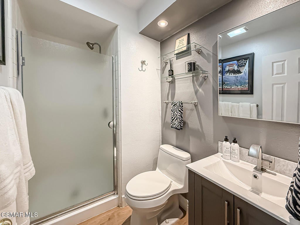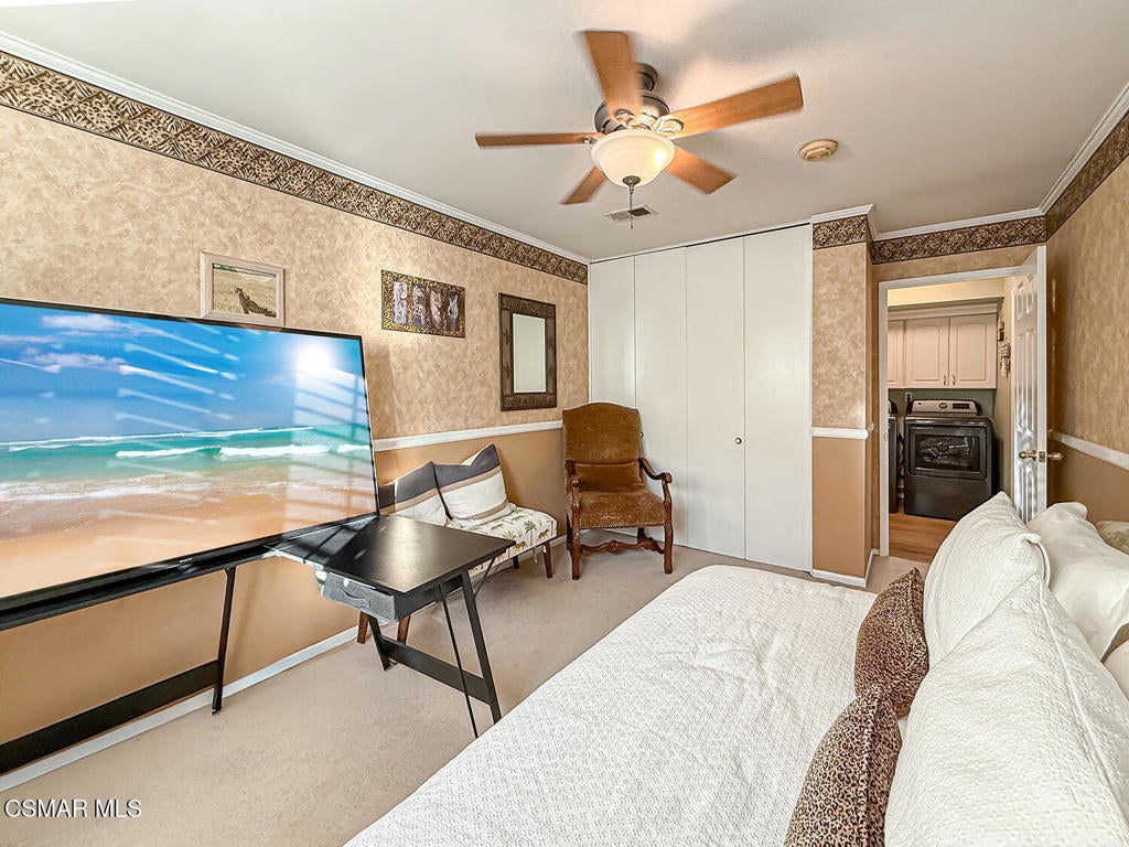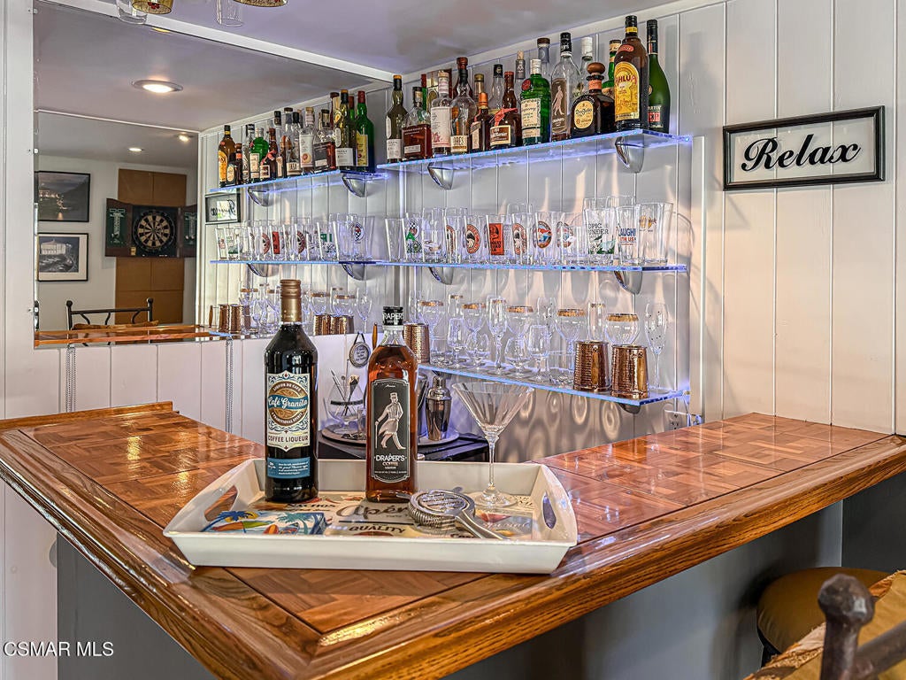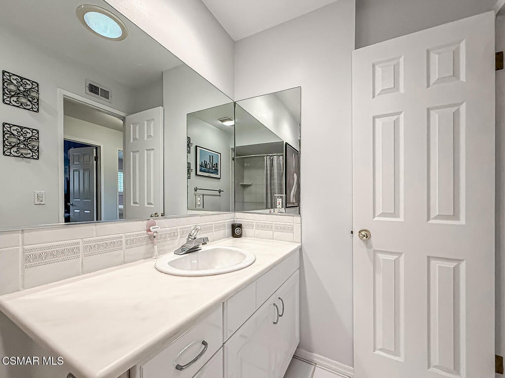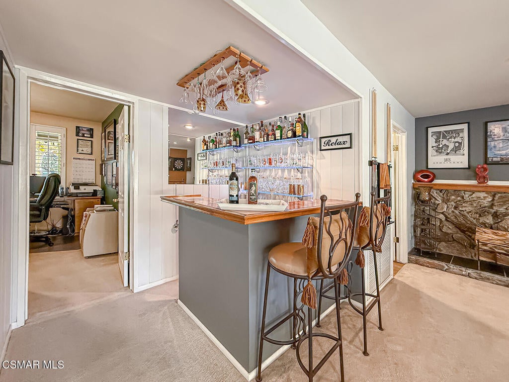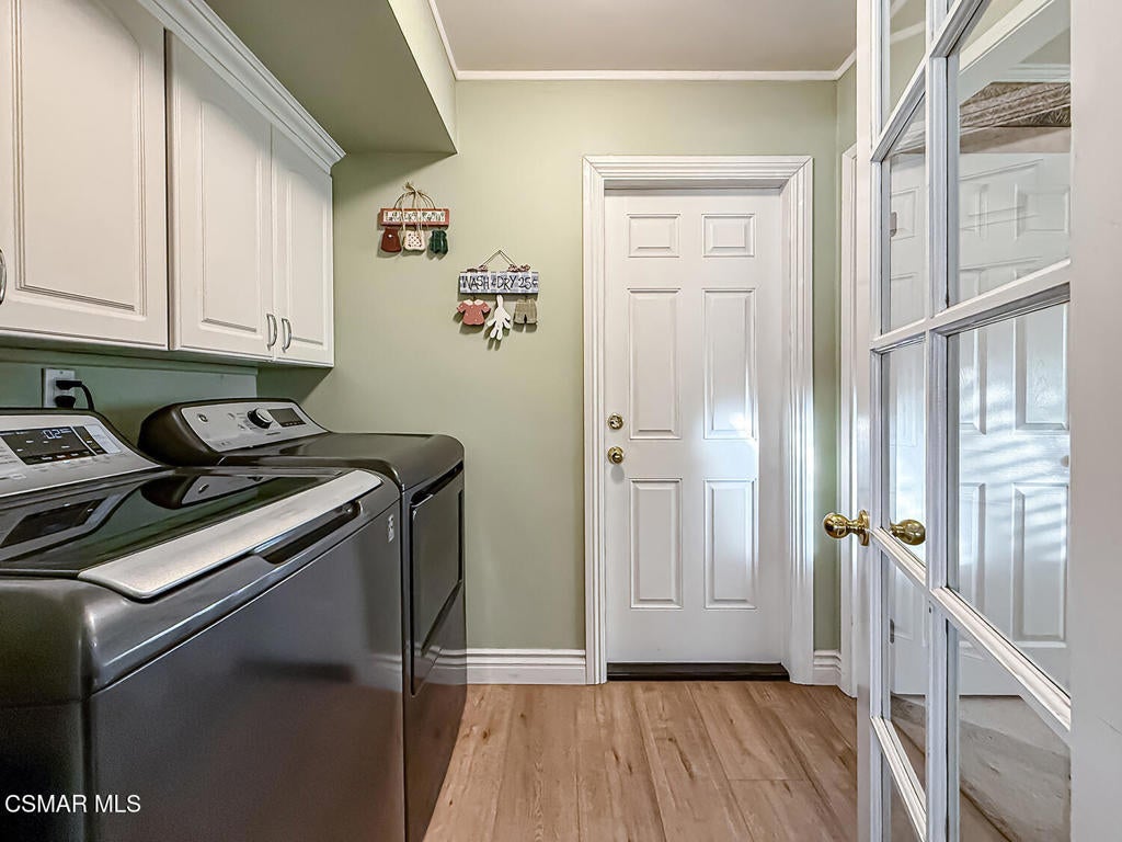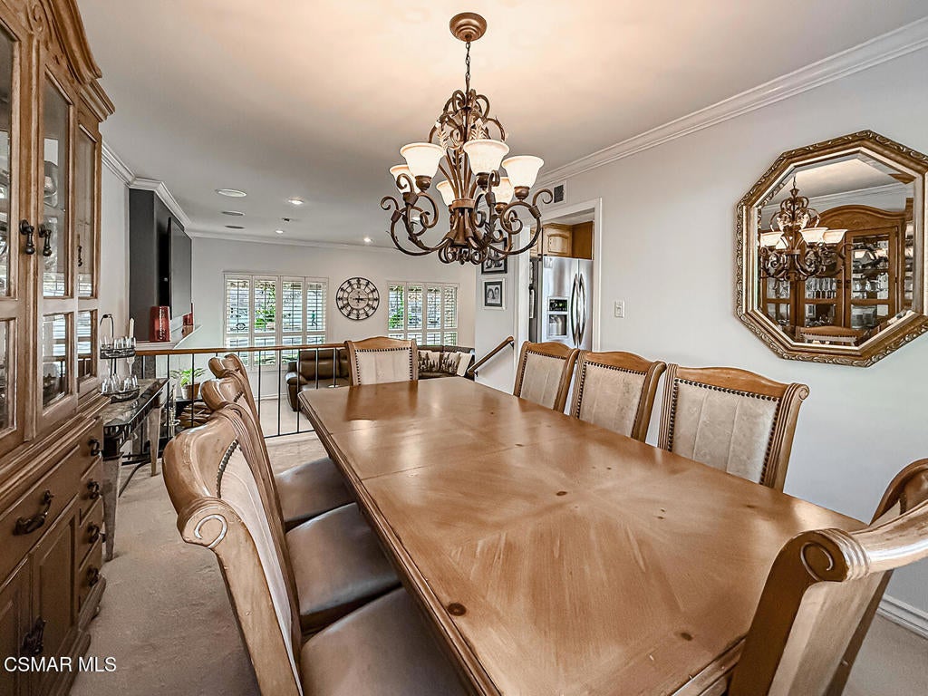 Upgraded POOL Home with 5 Bedrooms, 3 Bathrooms, and a 3-Car Garage in Central Thousand Oaks--Set on a Wide Lot with Charming Curb Appeal, Flexible Living Spaces, and a Private Backyard Retreat! From the moment you arrive, this stunning home impresses with its handsomely redone stacked-stone accents, a brick-ribboned walking path, manicured landscaping, and an inviting front porch that sets a welcoming tone. Step through the elegant beveled-glass double entry doors and you're greeted by an open and BRIGHT interior with soaring ceilings, UPGRADED wood-like flooring, and natural light pouring in from tall windows and glass doors throughout. The Living Room creates an inviting space for conversation or relaxation with plantation shutters, recessed lighting, and a GRANITE-surfaced gas fireplace with a floating wood mantle. Adjacent, the Formal Dining Room provides the perfect setting for holiday meals and everyday entertaining, framed by plantation-shuttered windows and tall ceilings that enhance the sense of elegance and space.The GOURMET Kitchen is a chef's delight--highlighted by sprawling granite countertops, DOUBLE ovens, stainless-steel Frigidaire Gallery appliances (including a 5-burner GAS cooktop), a deep pantry with pull-out shelving, and a sunny informal dining area with backyard views. A garden window above the sink brings in additional light and adds charm to everyday meal prep. Just off the Kitchen, the Family Room feels both cozy and elevated with a DRAMATIC wall-length stone-surfaced fireplace, a fully equipped wet bar, sliding glass doors to the backyard, and an extra coat/storage closet.Downstairs, a 3/4 Bathroom has been UPGRADED with wood-like flooring, a stylish vanity, and a tile-walled shower with glass enclosure. Off the front entry sits a downstairs Bedroom/Office with glass French doors and plantation-shuttered windows--perfect as a private workspace or guest room. An additional Downstairs Bedroom near the laundry area is generously sized and outfitted with a ceiling fan, plantation shutters, and convenient access to the garage and bathroom--an ideal setup for multi-generational living.The Formal Laundry Room is located inside, upgraded with wood-like flooring and direct access to the finished 3-Car Garage, which includes built-in storage cabinetry and a pull-down ladder leading to a storage-ready attic. Upstairs, you'll find two more Secondary Bedrooms that offer comfortable accommodations with plantation shutters, bifold closets, ceiling fans, and views to the backyard. The Upstairs Hall Bathroom is complete with tile flooring, a tile-wrapped tub/shower combo, and built-in vanity for convenience and functionality.The Primary Suite is a peaceful upstairs retreat featuring a spacious bedroom layout with plantation-shuttered windows, ceiling fan, and ample closet space. Its en-suite bathroom includes tile flooring, a mirrored wardrobe closet, a tile-topped vanity, and a remodeled tile-walled shower with a frameless glass enclosure.The Backyard is an entertainer's paradise! Enjoy the pebble-finished in-ground pool and above-ground spa, surrounded by STAMPED colored concrete patios and multiple lounging and dining zones. A built-in stone-surfaced firepit adds warmth and ambiance, while mature palm trees and hillside greenery create a peaceful and PRIVATE setting. An upper hillside space offers potential for future landscaping or garden expansion.Additional highlights include elegant crown molding throughout the home and easy access to Thousand Oaks' best offerings--WALKABILITY to Wildwood Park's hiking & biking trails, tennis courts, soccer fields, and playgrounds. Close proximity to Los Robles Hospital, Thousand Oaks High School, the Janss Marketplace, and restaurants, with zoning for award-winning Conejo Valley Unified Schools. This is a truly special home offering SPACE, UPGRADES, and LOCATION!