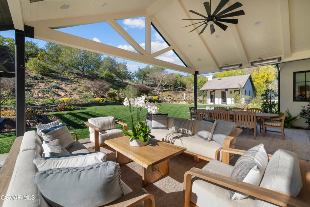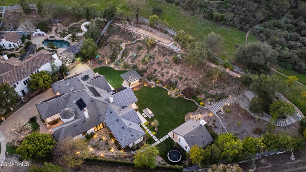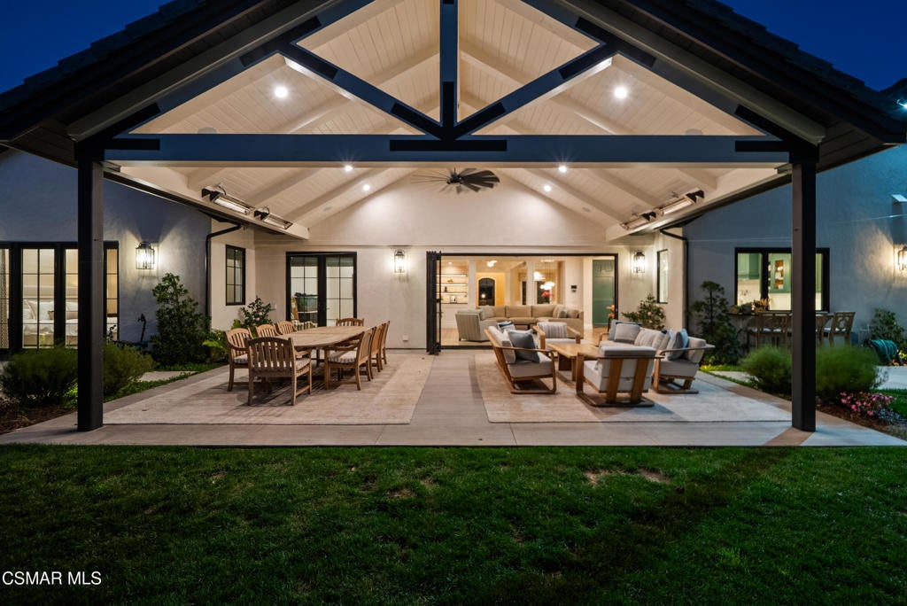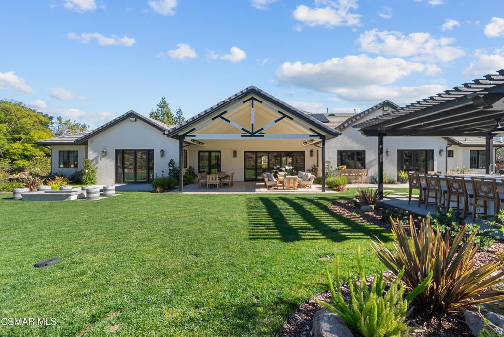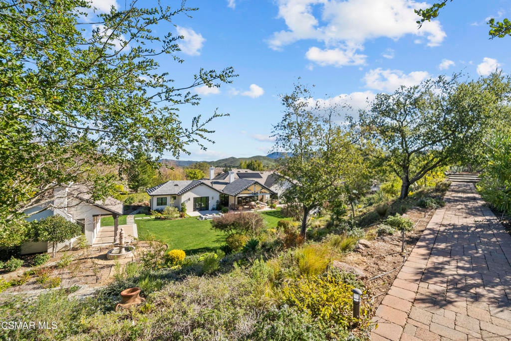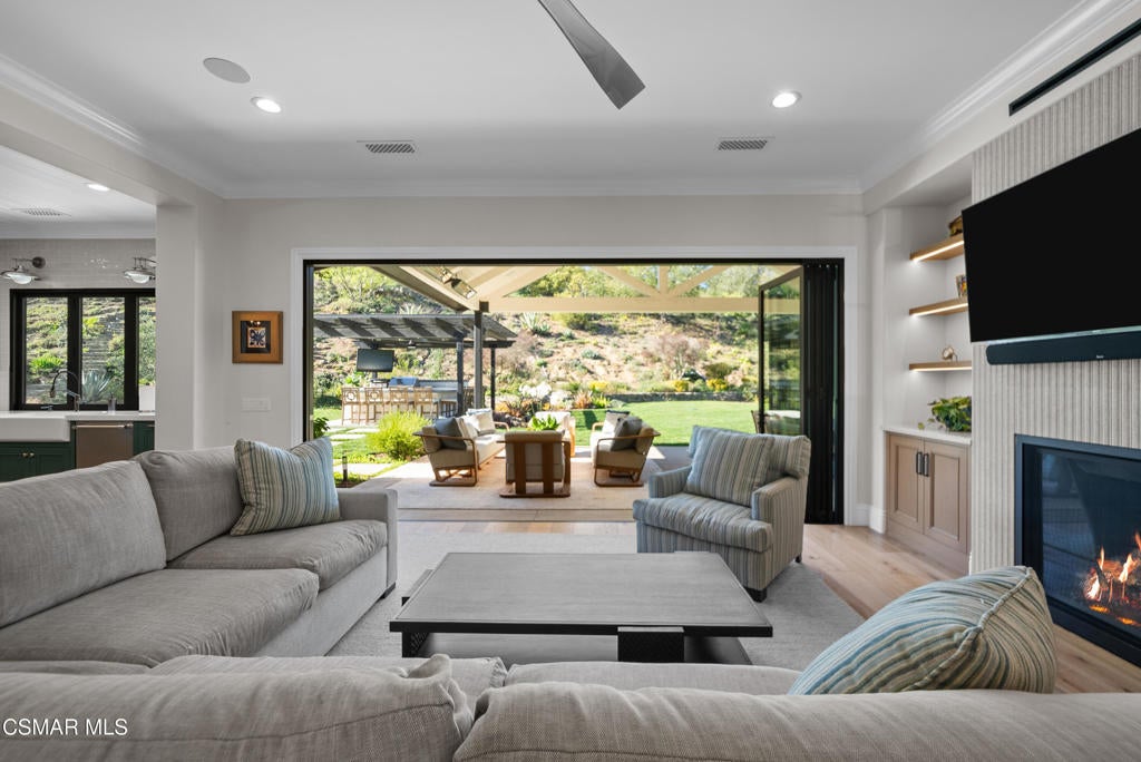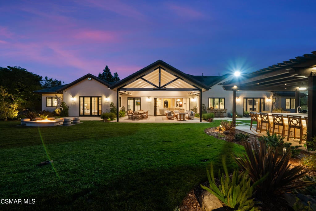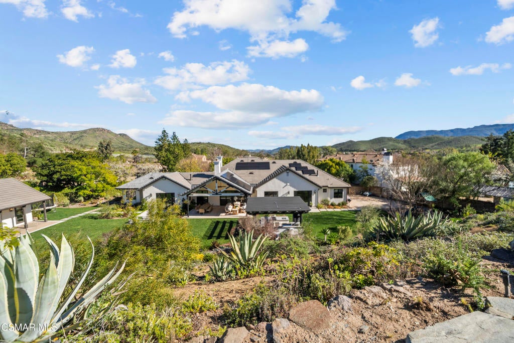 A refined blend of timeless design and true California indoor-outdoor living, set on nearly 1.5 acres at the end of a quiet cul-de-sac within the gated Palermo community of Dos Vientos.From the moment you arrive, this single-story estate makes a lasting impression. Step inside and be guided through light-filled spaces defined by wide-plank engineered wood flooring, custom crown molding throughout, new windows and doors, and carefully curated designer lighting all part of an extensive remodel that began in 2021.At the heart of the home is a statement kitchen, thoughtfully designed for both everyday living and effortless entertaining. Anchored by a generous center island, the kitchen features quartz countertops, a built-in refrigerator, dual dishwashers, two sinks, and soft-close cabinetry and drawers combining luxury with exceptional functionality. The kitchen flows seamlessly into the family room, where expansive accordion doors open wide to the covered patio, creating a true indoor-outdoor experience.The floor plan offers exceptional flexibility with two primary suites, allowing the future owner to decide which best fits their lifestyle. The original primary suite is generously sized and privately situated, while the second primary suite completed in 2023 is accessed through a den that can serve as a home office. This newer suite features a spacious walk-in closet and a well-appointed primary bath, creating a serene sanctuary within the home.In total, the main residence offers five bedrooms and four-and-a-half bathrooms, all thoughtfully laid out on a single level. The additional bedrooms and bathrooms have also been remodeled, maintaining the same level of quality and finish found throughout the home.A detached casita with its own bedroom and full bath offers a private, self-contained space separate from the main residence ideal for an in-law suite, nanny quarters, guest accommodations, or a flexible retreat tailored to the new owner's needs.Outdoors, a resort-style backyard unfolds, framed by mountain views and exceptional privacy. Completed in 2024, the outdoor kitchen features a built-in BBQ, two burners, a warming drawer, sink, and bar-height seating, all set beneath a wood pergola structure ideal for entertaining. A custom fire pit creates a natural gathering space for evenings under the stars. The grounds are further enhanced by mature citrus trees, including lemon, lime, orange, and pomegranate, adding both charm and a true California lifestyle element. Steps lead up the hillside to an elevated seating area and a private bocce ball court, creating a truly unique outdoor retreat.The two-car garage is finished with an epoxy floor and recessed can lighting, offering versatility beyond traditional parking. Whether used as a home gym, workshop, creative space, or casual hangout area, this space is designed to adapt to a variety of lifestyles.Additional highlights include an updated HVAC system with new ductwork, Tesla solar with four Tesla Powerwalls, a three-car garage, a striking temperature-controlled wine wall, and access to nearby hiking trails, parks, and the natural beauty that defines Dos Vientos.Spanning approximately 4,875 square feet and thoughtfully designed to accommodate a variety of lifestyles, this single-story estate is set within one of the area's most sought-after gated communities, offering an exceptional blend of space, privacy, and refined living.