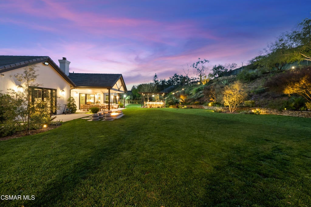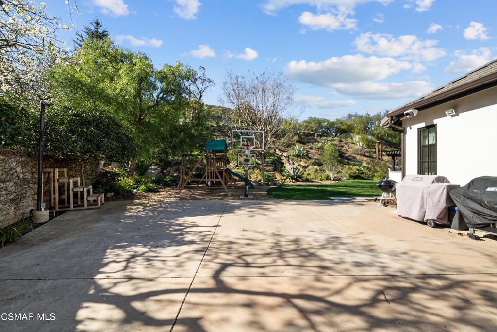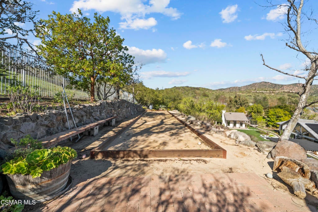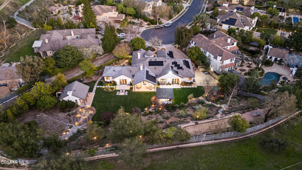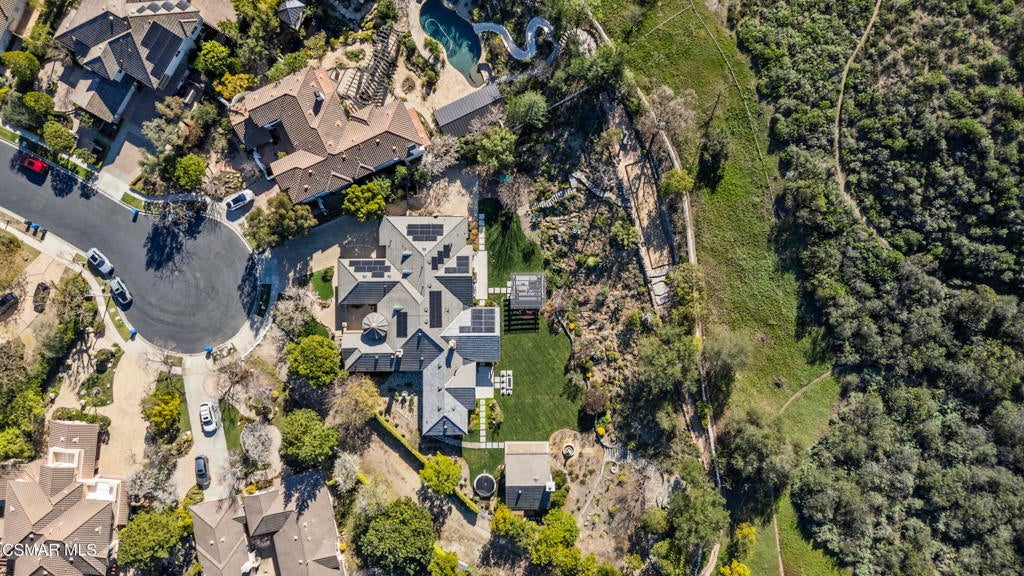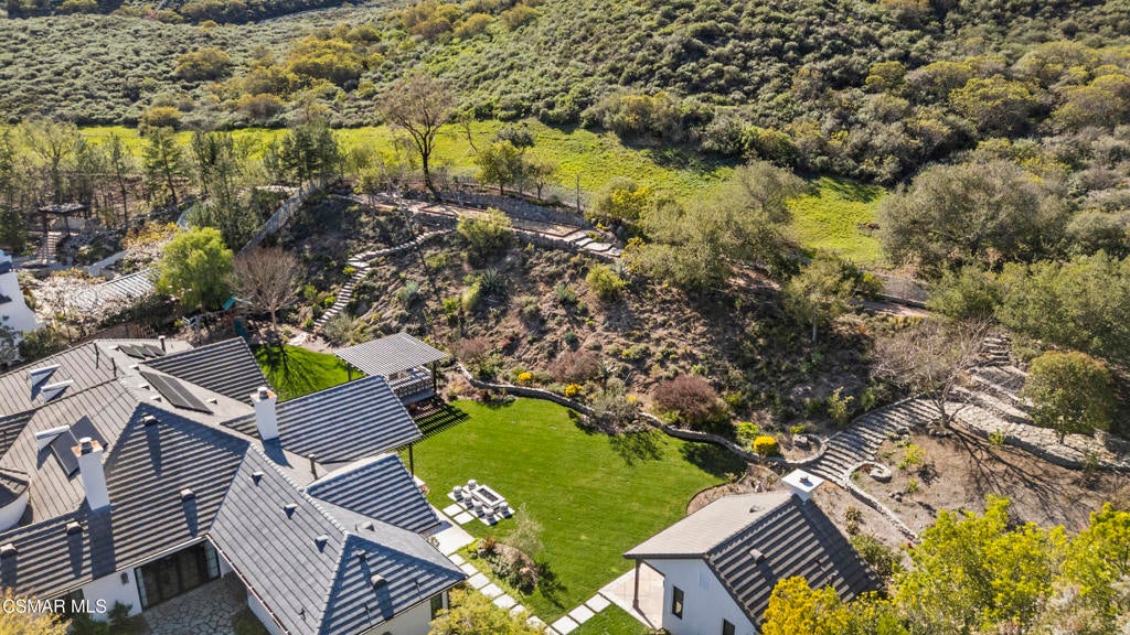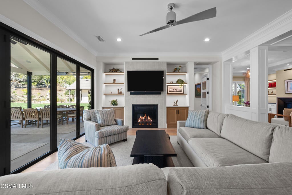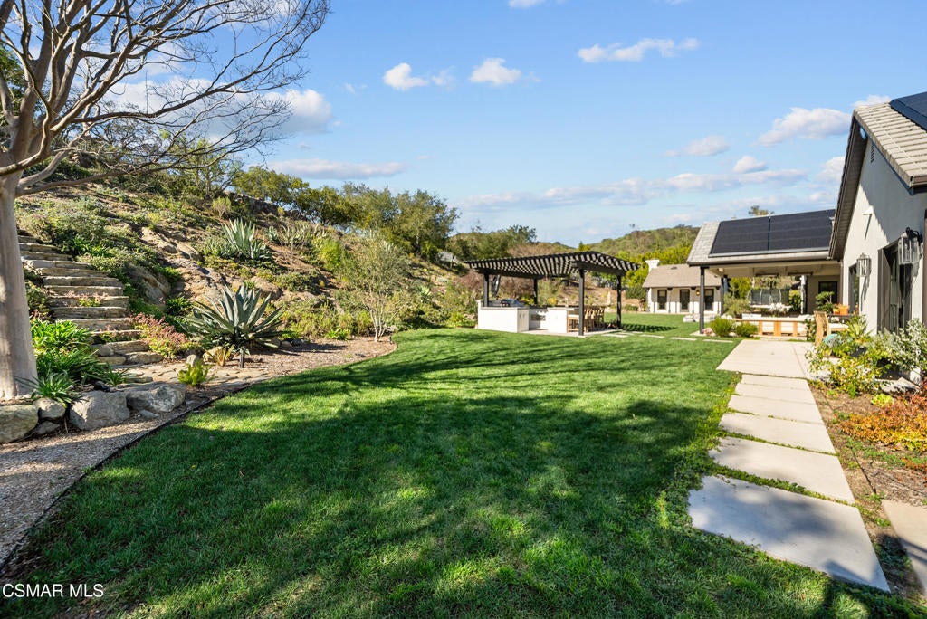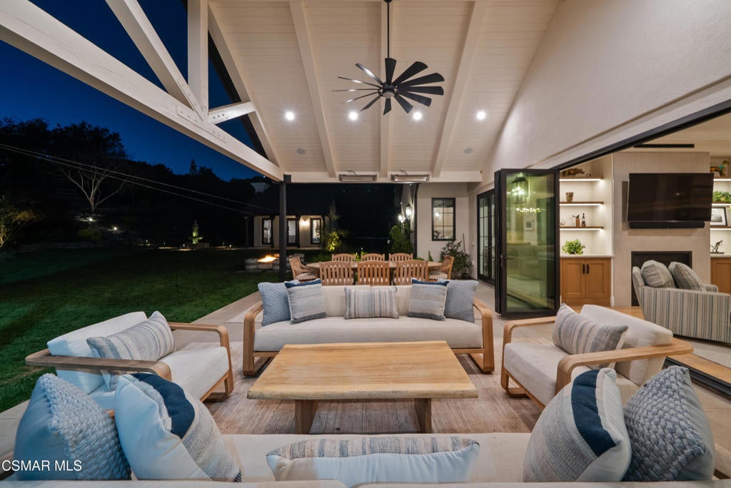 A refined blend of timeless design and true California indoor-outdoor living, set on nearly 1.5 acres at the end of a quiet cul-de-sac within the gated Palermo community of Dos Vientos.From the moment you arrive, this single-story estate makes a lasting impression. Step inside and be guided through light-filled spaces defined by wide-plank engineered wood flooring, custom crown molding throughout, new windows and doors, and carefully curated designer lighting all part of an extensive remodel that began in 2021.At the heart of the home is a statement kitchen, thoughtfully designed for both everyday living and effortless entertaining. Anchored by a generous center island, the kitchen features quartz countertops, a built-in refrigerator, dual dishwashers, two sinks, and soft-close cabinetry and drawers combining luxury with exceptional functionality. The kitchen flows seamlessly into the family room, where expansive accordion doors open wide to the covered patio, creating a true indoor-outdoor experience.The floor plan offers exceptional flexibility with two primary suites, allowing the future owner to decide which best fits their lifestyle. The original primary suite is generously sized and privately situated, while the second primary suite completed in 2023 is accessed through a den that can serve as a home office. This newer suite features a spacious walk-in closet and a well-appointed primary bath, creating a serene sanctuary within the home.In total, the main residence offers five bedrooms and four-and-a-half bathrooms, all thoughtfully laid out on a single level. The additional bedrooms and bathrooms have also been remodeled, maintaining the same level of quality and finish found throughout the home.A detached casita with its own bedroom and full bath offers a private, self-contained space separate from the main residence ideal for an in-law suite, nanny quarters, guest accommodations, or a flexible retreat tailored to the new owner's needs.Outdoors, a resort-style backyard unfolds, framed by mountain views and exceptional privacy. Completed in 2024, the outdoor kitchen features a built-in BBQ, two burners, a warming drawer, sink, and bar-height seating, all set beneath a wood pergola structure ideal for entertaining. A custom fire pit creates a natural gathering space for evenings under the stars. The grounds are further enhanced by mature citrus trees, including lemon, lime, orange, and pomegranate, adding both charm and a true California lifestyle element. Steps lead up the hillside to an elevated seating area and a private bocce ball court, creating a truly unique outdoor retreat.The two-car garage is finished with an epoxy floor and recessed can lighting, offering versatility beyond traditional parking. Whether used as a home gym, workshop, creative space, or casual hangout area, this space is designed to adapt to a variety of lifestyles.Additional highlights include an updated HVAC system with new ductwork, Tesla solar with four Tesla Powerwalls, a three-car garage, a striking temperature-controlled wine wall, and access to nearby hiking trails, parks, and the natural beauty that defines Dos Vientos.Spanning approximately 4,875 square feet and thoughtfully designed to accommodate a variety of lifestyles, this single-story estate is set within one of the area's most sought-after gated communities, offering an exceptional blend of space, privacy, and refined living.