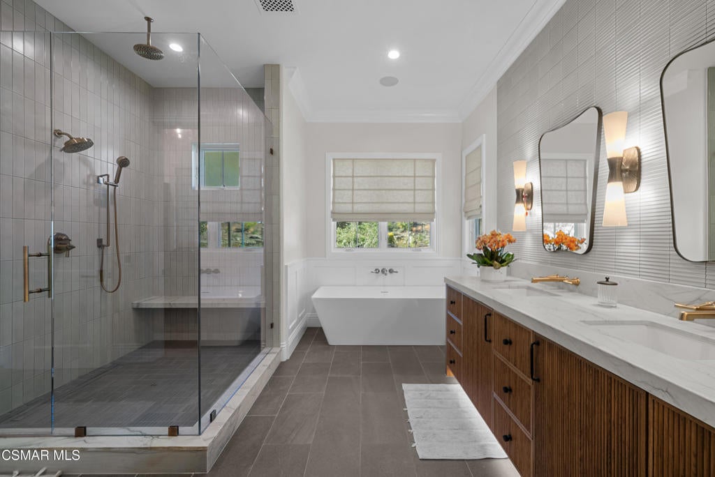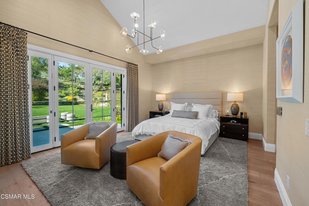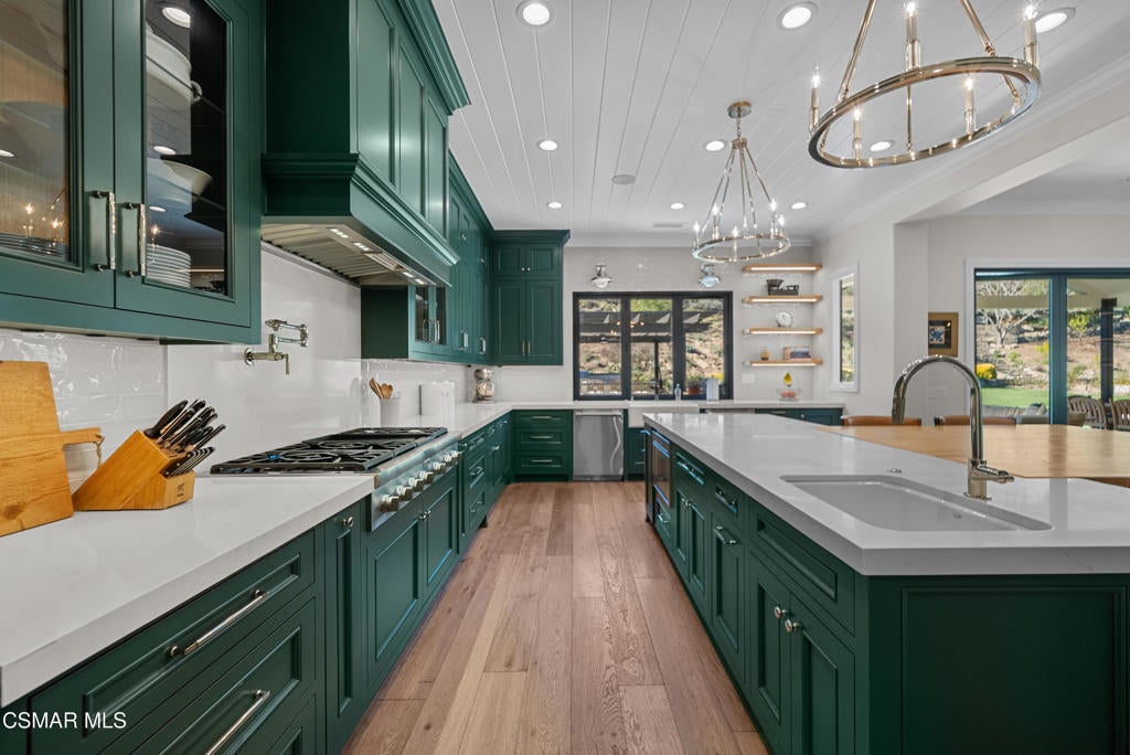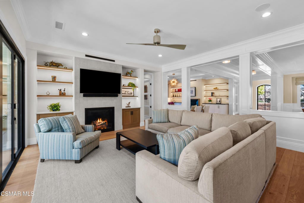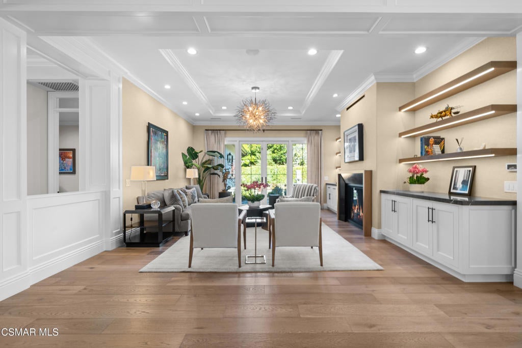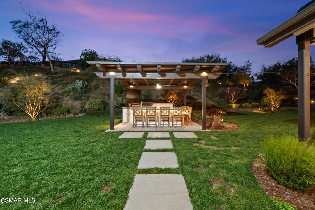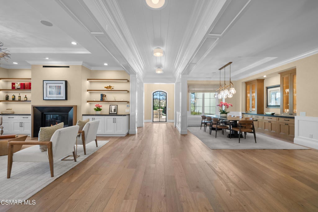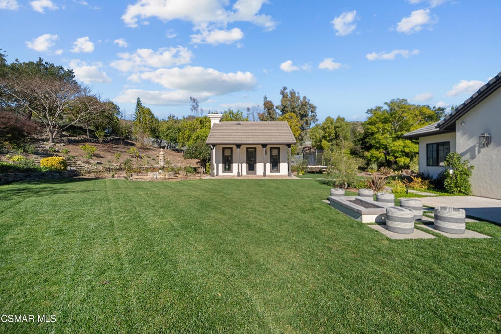 A refined blend of timeless design and true California indoor-outdoor living, set on nearly 1.5 acres at the end of a quiet cul-de-sac within the gated Palermo community of Dos Vientos.From the moment you arrive, this single-story estate makes a lasting impression. Step inside and be guided through light-filled spaces defined by wide-plank engineered wood flooring, custom crown molding throughout, new windows and doors, and carefully curated designer lighting all part of an extensive remodel that began in 2021.At the heart of the home is a statement kitchen, thoughtfully designed for both everyday living and effortless entertaining. Anchored by a generous center island, the kitchen features quartz countertops, a built-in refrigerator, dual dishwashers, two sinks, and soft-close cabinetry and drawers combining luxury with exceptional functionality. The kitchen flows seamlessly into the family room, where expansive accordion doors open wide to the covered patio, creating a true indoor-outdoor experience.The floor plan offers exceptional flexibility with two primary suites, allowing the future owner to decide which best fits their lifestyle. The original primary suite is generously sized and privately situated, while the second primary suite completed in 2023 is accessed through a den that can serve as a home office. This newer suite features a spacious walk-in closet and a well-appointed primary bath, creating a serene sanctuary within the home.In total, the main residence offers five bedrooms and four-and-a-half bathrooms, all thoughtfully laid out on a single level. The additional bedrooms and bathrooms have also been remodeled, maintaining the same level of quality and finish found throughout the home.A detached casita with its own bedroom and full bath offers a private, self-contained space separate from the main residence ideal for an in-law suite, nanny quarters, guest accommodations, or a flexible retreat tailored to the new owner's needs.Outdoors, a resort-style backyard unfolds, framed by mountain views and exceptional privacy. Completed in 2024, the outdoor kitchen features a built-in BBQ, two burners, a warming drawer, sink, and bar-height seating, all set beneath a wood pergola structure ideal for entertaining. A custom fire pit creates a natural gathering space for evenings under the stars. The grounds are further enhanced by mature citrus trees, including lemon, lime, orange, and pomegranate, adding both charm and a true California lifestyle element. Steps lead up the hillside to an elevated seating area and a private bocce ball court, creating a truly unique outdoor retreat.The two-car garage is finished with an epoxy floor and recessed can lighting, offering versatility beyond traditional parking. Whether used as a home gym, workshop, creative space, or casual hangout area, this space is designed to adapt to a variety of lifestyles.Additional highlights include an updated HVAC system with new ductwork, Tesla solar with four Tesla Powerwalls, a three-car garage, a striking temperature-controlled wine wall, and access to nearby hiking trails, parks, and the natural beauty that defines Dos Vientos.Spanning approximately 4,875 square feet and thoughtfully designed to accommodate a variety of lifestyles, this single-story estate is set within one of the area's most sought-after gated communities, offering an exceptional blend of space, privacy, and refined living.