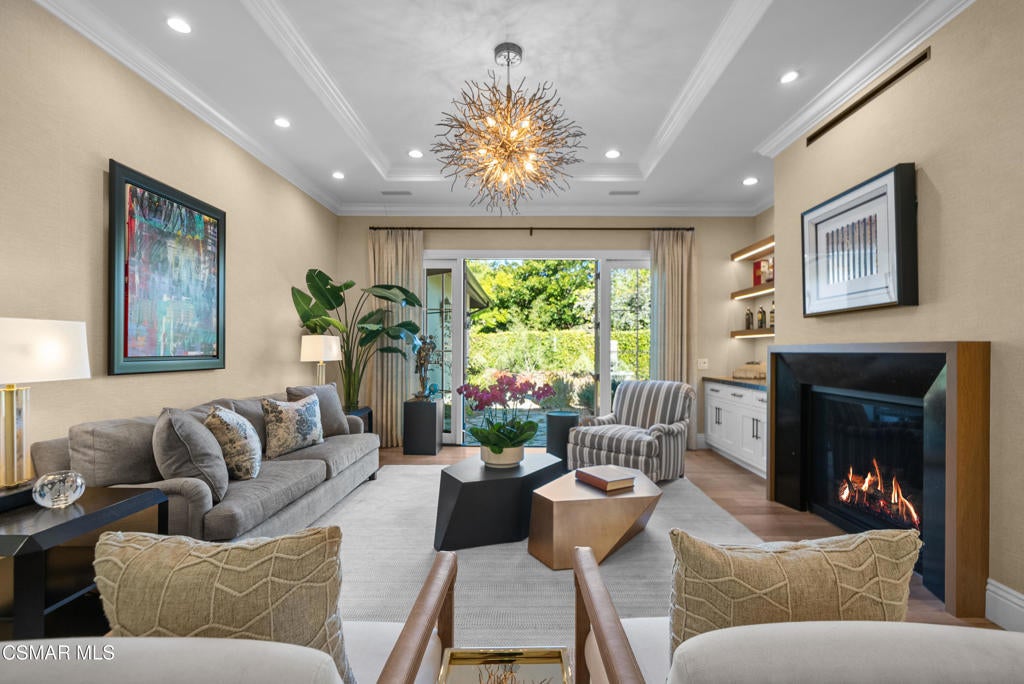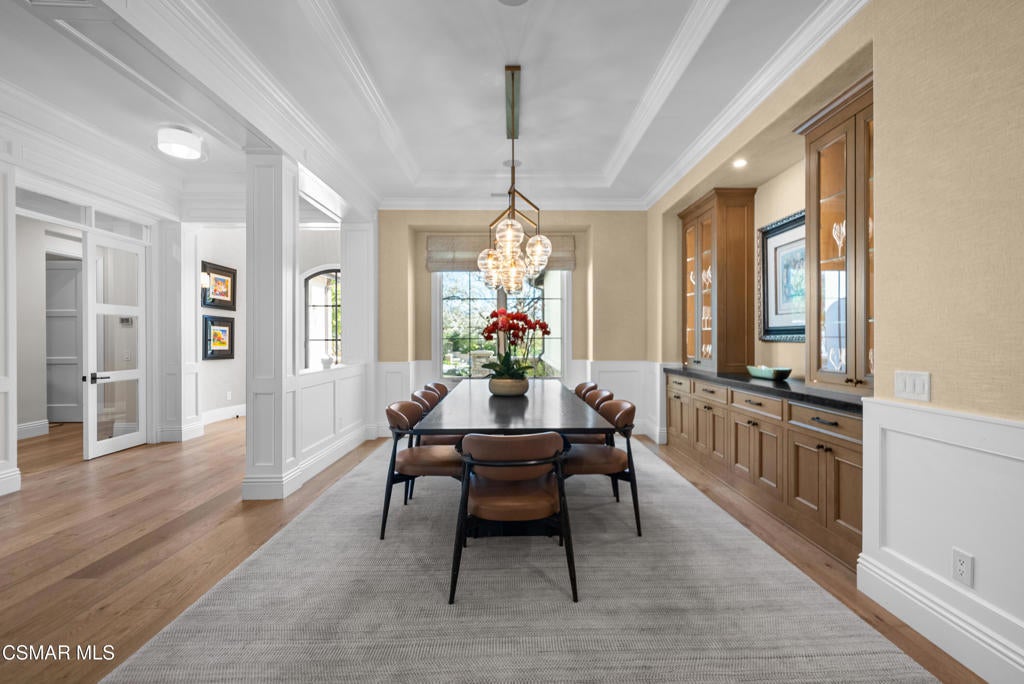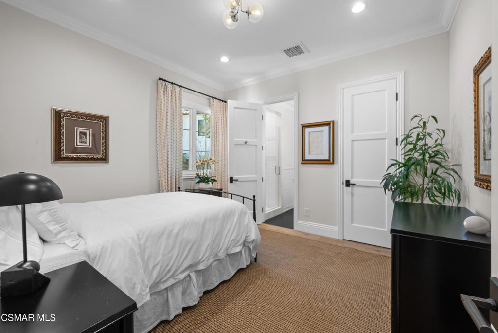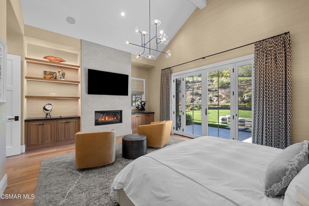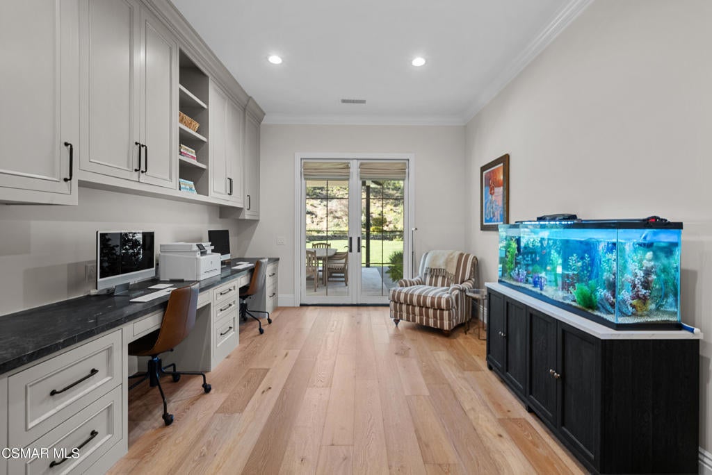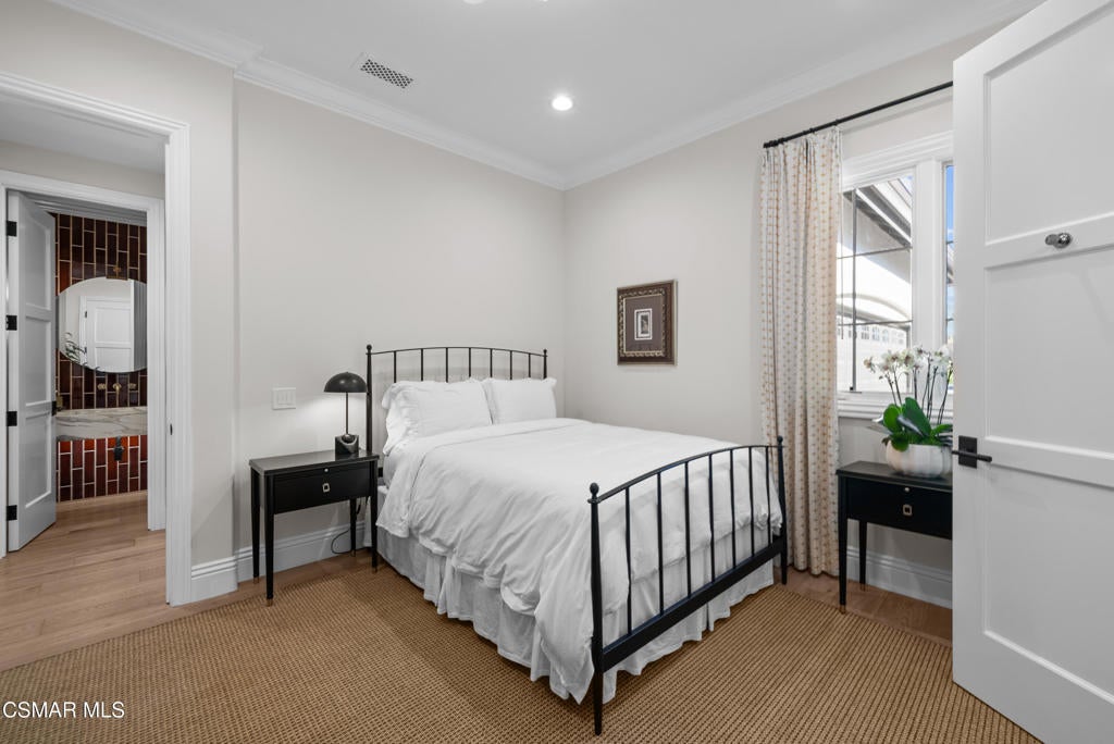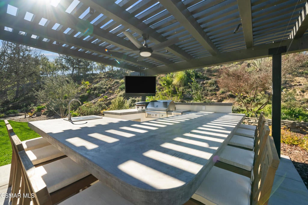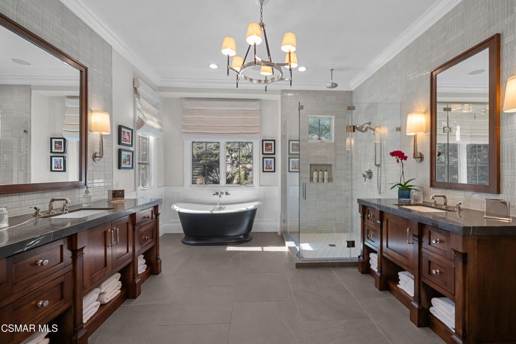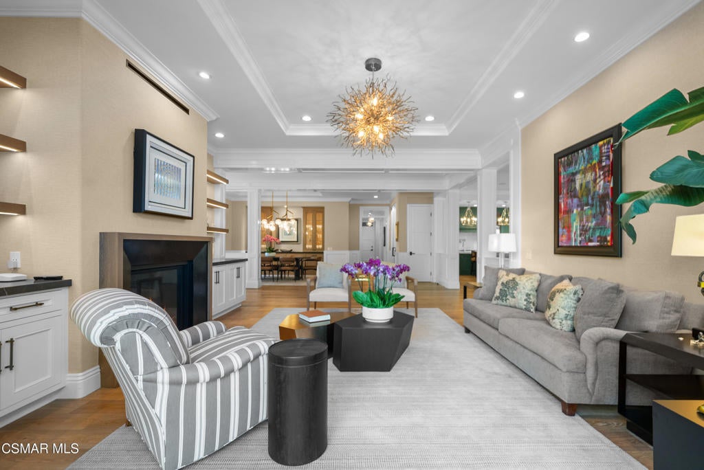 A refined blend of timeless design and true California indoor-outdoor living, set on nearly 1.5 acres at the end of a quiet cul-de-sac within the gated Palermo community of Dos Vientos.From the moment you arrive, this single-story estate makes a lasting impression. Step inside and be guided through light-filled spaces defined by wide-plank engineered wood flooring, custom crown molding throughout, new windows and doors, and carefully curated designer lighting all part of an extensive remodel that began in 2021.At the heart of the home is a statement kitchen, thoughtfully designed for both everyday living and effortless entertaining. Anchored by a generous center island, the kitchen features quartz countertops, a built-in refrigerator, dual dishwashers, two sinks, and soft-close cabinetry and drawers combining luxury with exceptional functionality. The kitchen flows seamlessly into the family room, where expansive accordion doors open wide to the covered patio, creating a true indoor-outdoor experience.The floor plan offers exceptional flexibility with two primary suites, allowing the future owner to decide which best fits their lifestyle. The original primary suite is generously sized and privately situated, while the second primary suite completed in 2023 is accessed through a den that can serve as a home office. This newer suite features a spacious walk-in closet and a well-appointed primary bath, creating a serene sanctuary within the home.In total, the main residence offers five bedrooms and four-and-a-half bathrooms, all thoughtfully laid out on a single level. The additional bedrooms and bathrooms have also been remodeled, maintaining the same level of quality and finish found throughout the home.A detached casita with its own bedroom and full bath offers a private, self-contained space separate from the main residence ideal for an in-law suite, nanny quarters, guest accommodations, or a flexible retreat tailored to the new owner's needs.Outdoors, a resort-style backyard unfolds, framed by mountain views and exceptional privacy. Completed in 2024, the outdoor kitchen features a built-in BBQ, two burners, a warming drawer, sink, and bar-height seating, all set beneath a wood pergola structure ideal for entertaining. A custom fire pit creates a natural gathering space for evenings under the stars. The grounds are further enhanced by mature citrus trees, including lemon, lime, orange, and pomegranate, adding both charm and a true California lifestyle element. Steps lead up the hillside to an elevated seating area and a private bocce ball court, creating a truly unique outdoor retreat.The two-car garage is finished with an epoxy floor and recessed can lighting, offering versatility beyond traditional parking. Whether used as a home gym, workshop, creative space, or casual hangout area, this space is designed to adapt to a variety of lifestyles.Additional highlights include an updated HVAC system with new ductwork, Tesla solar with four Tesla Powerwalls, a three-car garage, a striking temperature-controlled wine wall, and access to nearby hiking trails, parks, and the natural beauty that defines Dos Vientos.Spanning approximately 4,875 square feet and thoughtfully designed to accommodate a variety of lifestyles, this single-story estate is set within one of the area's most sought-after gated communities, offering an exceptional blend of space, privacy, and refined living.
