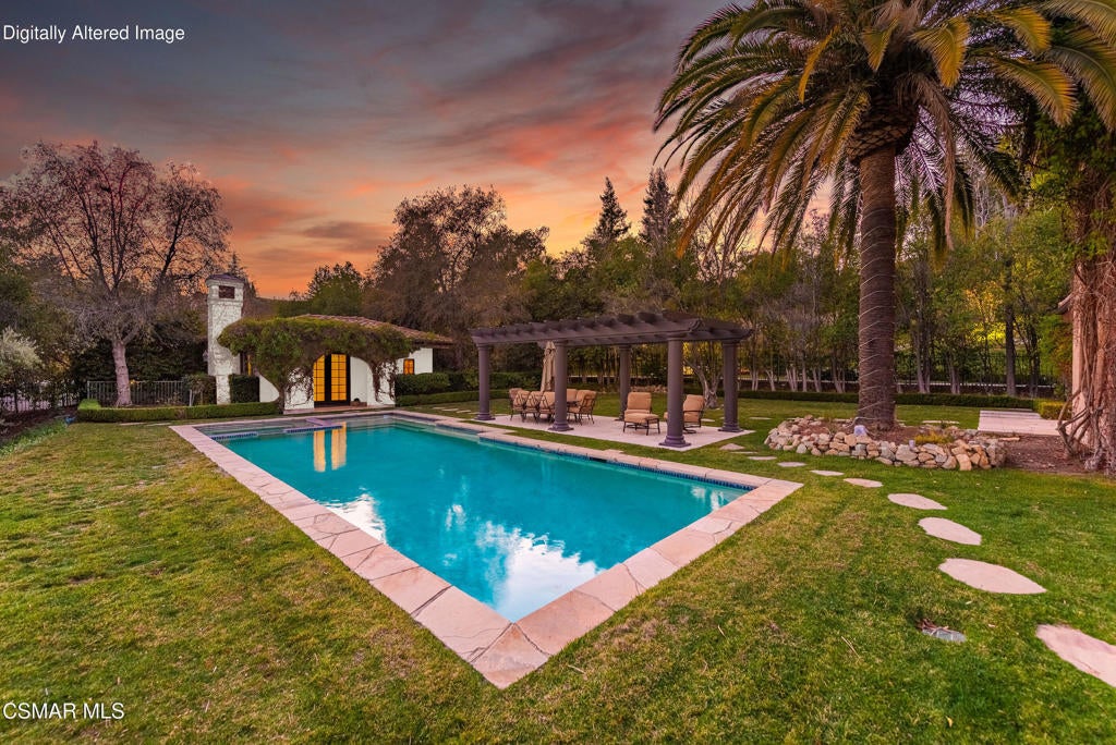 Tuscan perfection! Timeless! Set on a tranquil 1.5-acre cul-de-sac lot, this Italian Villa in Westlake Village stands as one of the most sought-after estates in the area. Designed for those who appreciate luxury living and entertaining, this European-inspired residence offers incredible mountain views and ultimate privacy, all within the exclusive Country Club Estates community. With approximately 11,000 square feet of living space, the home seamlessly blends classic elegance with modern comforts.The grand formal living room welcomes you with soaring ceilings and ample natural light, while a cozy library offers a quiet retreat. The expansive gourmet kitchen, ideally located next to the family room, is a chef's dream. It features a distressed wood-beamed coffered ceiling, custom copper accents, a full wet bar, and a wine cellar. A striking fireplace anchors the space, making it perfect for both casual family gatherings and formal entertaining. Adjacent to the kitchen, the formal dining room opens to a covered loggia, where you can enjoy a heated outdoor dining patio and a comfortable lounge area for year-round entertaining.On the main level, you'll find a private apartment suite that offers a separate living space, kitchen, and bedroom, all with direct access to the backyard. It's the ideal set-up for guests or multi-generational living, providing both comfort and privacy.Up the grand staircase, the master retreat awaits--spacious and serene, with a beautiful marble fireplace as its centerpiece. Two generous walk-in closets provide ample storage, and the luxurious en-suite bathrooms offer a spa-like experience, complete with a soaking tub and separate sauna. This level also features four additional well-sized secondary bedrooms, each with its own en-suite bathroom, ensuring plenty of space for family and guests.Designed with Southern California's indoor/outdoor lifestyle in mind, the estate's expansive grounds include a separate casita/pool house, complete with a fireplace, kitchenette, and full bath--perfect for poolside gatherings or as a guest retreat. Lush, manicured lawns surround the property, along with formal gardens that add beauty and privacy. The centerpiece of the backyard is a sparkling pool and spa, all set against a backdrop of breathtaking mountain views.This estate truly offers the best of California living, where every detail has been thoughtfully designed to provide both luxury and comfort. Whether enjoying intimate family time indoors or hosting large gatherings outdoors, this home offers the perfect setting for every occasion.