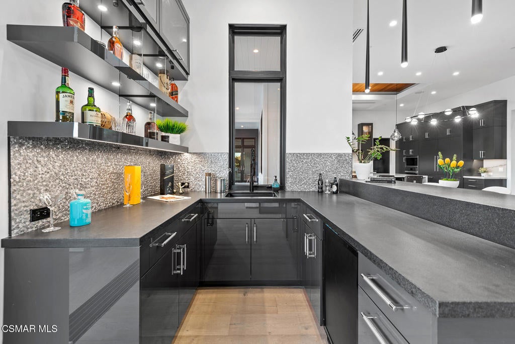 The absolute premier newly built North Ranch estate. An awe inspiring contemporary farmhouse with an ideal cul-de-sac location in upper North Ranch! Privately gated trophy custom on over two acres with stunning mountain views! No expense was spared to create this true masterpiece! Livable as mostly one level, this amazing open concept floor plan spans over 7000 square feet. Features include a grand 'great room' with 10 foot multi-slide Fleetwood glass doors, floor to ceiling stone fireplace and a beautifully designed soaring ceiling with wood accents. There is also a separate theater/bonus room (6th bedroom), two sided glass wine cellar, walk in wet bar and so much more! Up the floating stairs you will find an additional family room and two large secondary en-suite bedrooms, one of which serves as a second primary suite option. Perfect for guest quarters! The home is elevator ready if desired. The main level primary suite is extraordinary. There are two large walk in closets, tremendous fireplace, sitting room and a Four Seasons quality bathroom with steam shower and soaker tub. The resort quality grounds are second to none. There is a 90 foot infinity pool enhanced by fire & water features. There is also 1300 square feet of covered outdoor living, barbecue center and massive manicured lawns. Other amenities include a smart home and solar systems, FIVE car garage, Sonos sound, security cameras, large glass pivot front door and so much more. A very exciting estate to hit North Ranch.