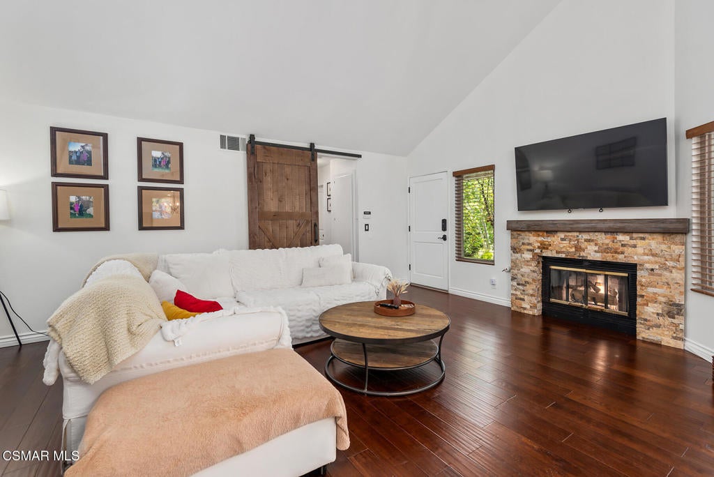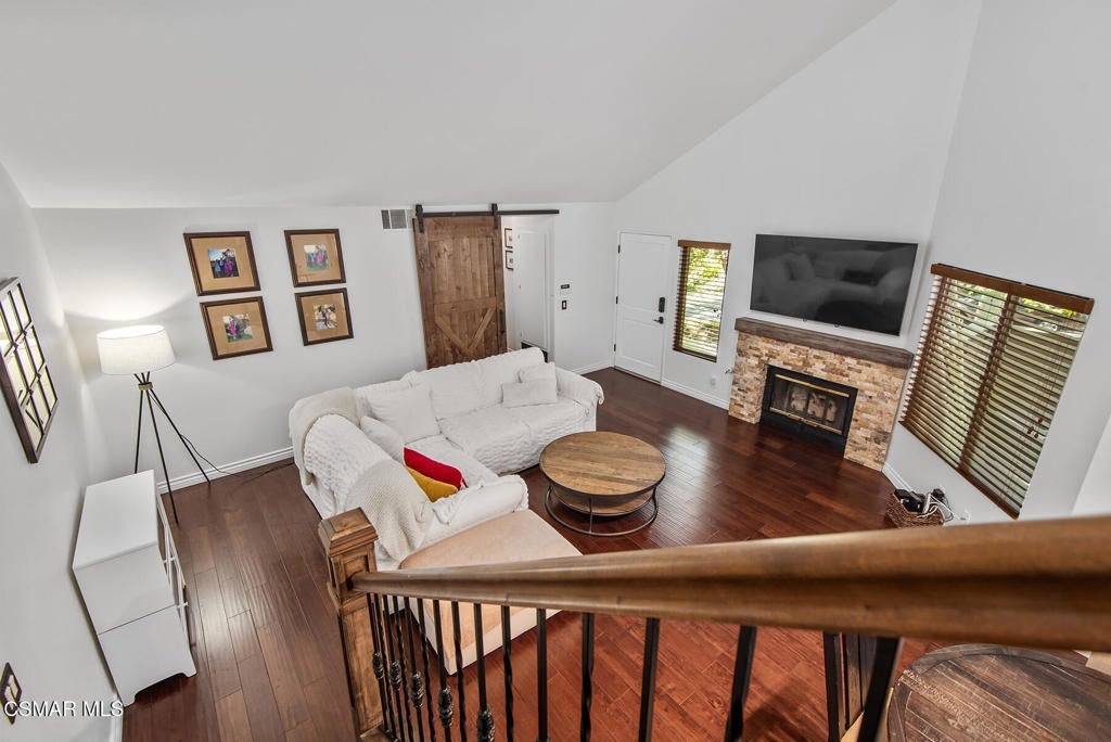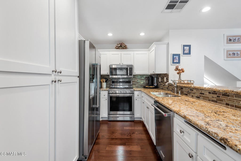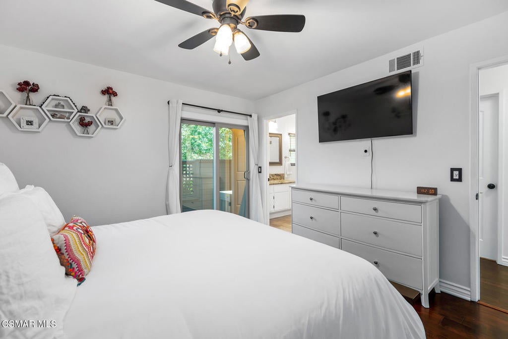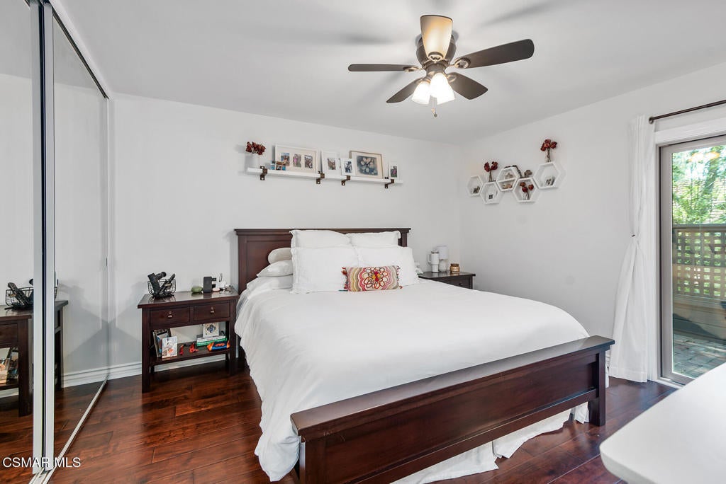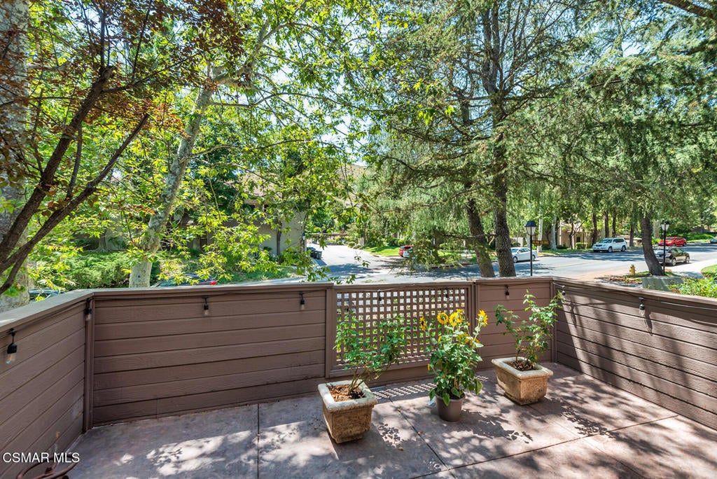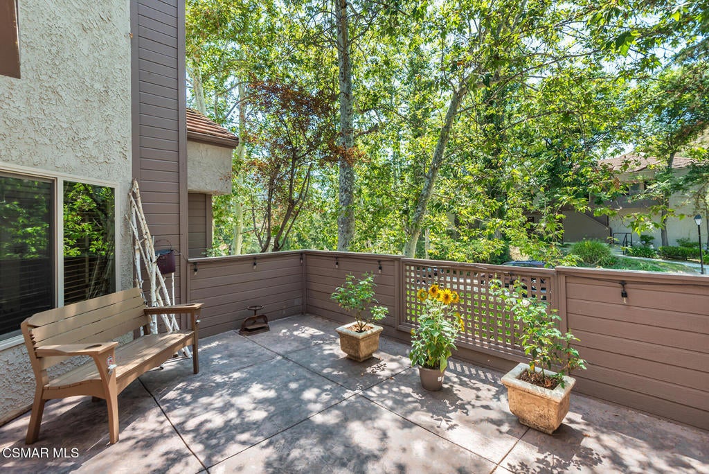 Stunning 2 bedroom, 2 bath townhome nestled in the quiet, highly desirable neighborhood of Hidden Canyon in Westlake Village. Premier end unit with highly sought after floor plan boasts a downstairs primary bedroom and an upstairs bedroom with an ensuite bathroom. This immaculate, turn-key home features stunning wood/like laminate flooring, freshly painted interior, dual pane windows and custom lighting, fixtures and upgrades throughout. Gorgeous kitchen includes granite countertops with glass tile backsplash, beautiful white cabinetry, and high end stainless steel appliances. Living room with stacked stone gas fireplace, wood blinds and separate dining area with custom chandelier and slider to outside patio. Downstairs primary bedroom has ceiling fan, mirrored closet doors and slider to private outside patio. Beautiful primary ensuite bathroom features white vanity with granite counters, oversize shower with subway tile and glass enclosure and custom lighting and fixtures. Upstairs bedroom has plantation shutters, ensuite bathroom and boasts the same beautiful features as the primary. Staircase has custom iron railing and wood handrails, and a private nook under the stairs for additional space. Oversize direct access 2 car garage with custom storage. Great neighborhood with multiple pools, spas and close to hiking/biking trails, shopping, restaurants and award winning schools. Come make it yours!