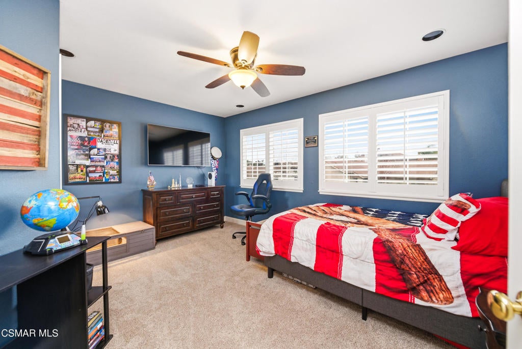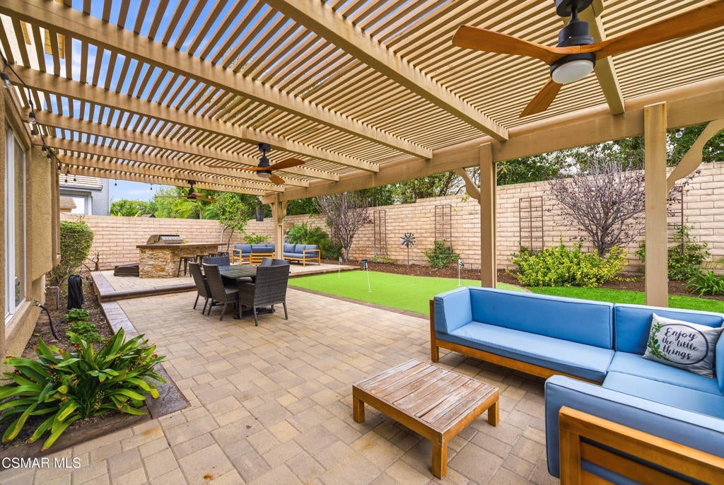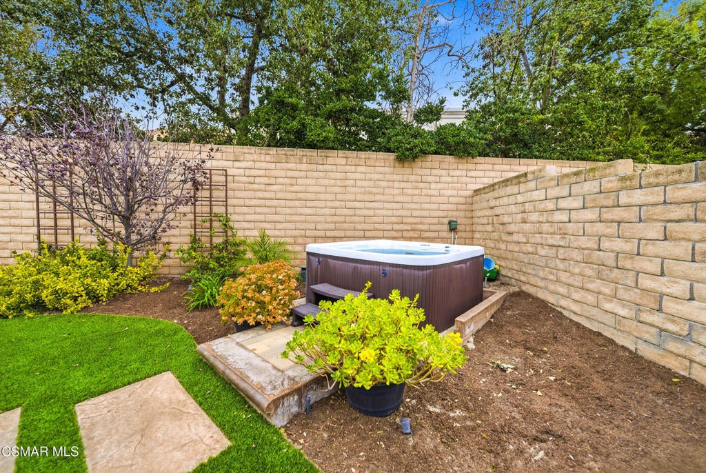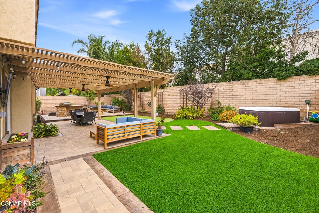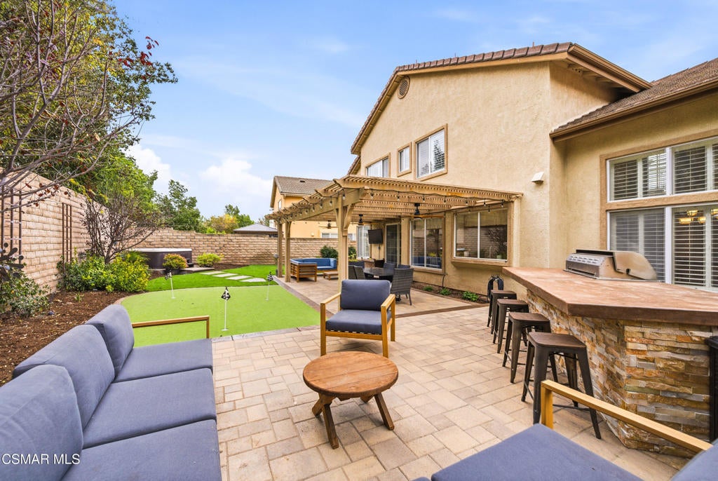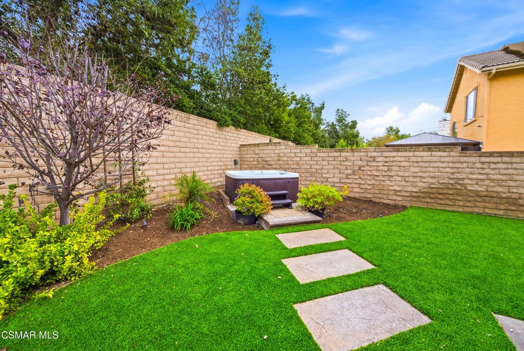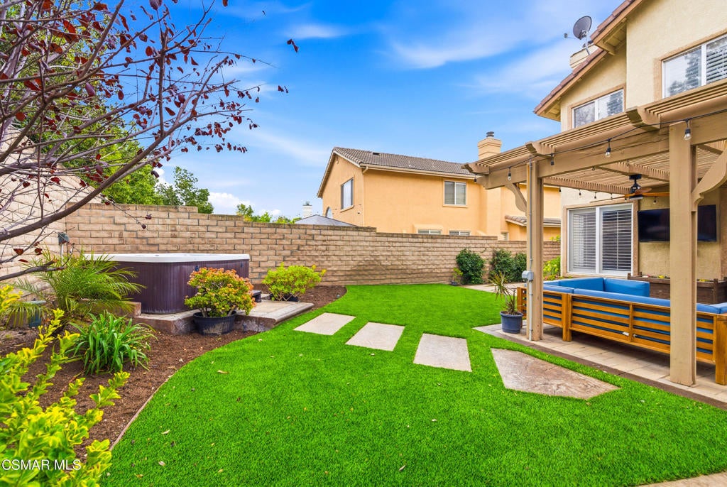Refined Luxury Living with Owned Solar in the Heart of Simi Valley! Welcome to 2696 Santa Ynez Avenue, an exceptional 5-bedroom, 3-bathroom residence with a DOWNSTAIRS Bedroom and Bath offering 2,608 square feet of thoughtfully designed living space on a beautifully curated 7,000 square foot lot. This home blends comfort, sophistication, and effortless California indoor-outdoor living. From the moment you arrive, the custom stamped concrete and meticulously designed hardscapes create striking curb appeal and set the tone for what awaits inside. Step through the doors to discover a light-filled, expansive floor plan enhanced by vaulted ceilings and newer water-resistant laminate flooring throughout, delivering a fresh, modern aesthetic with seamless flow from room to room. The spacious living areas are designed for both elevated entertaining and everyday comfort. Home boasts a separate living and family room containing a beautiful stone fireplace with custom mantle, ceiling fan, and access to the rear yard. The well-appointed kitchen opens effortlessly to the main gathering spaces, creating an inviting atmosphere ideal for hosting. Kitchen hi-lights include modern light fixtures, stainless steel appliances (including double ovens), loads of cabinet and storage space, a center island, granite countertops with attractive tile backsplash, and a large eat in kitchen area. The downstairs is finished off by a bedroom currently used as an office, laundry area with cabinetry and an upgraded full bathroom. Bathroom has large vanity with beautiful sink and finishes, and a shower over tub set up. Upstairs and beyond, generously sized bedrooms provide privacy and flexibility, while the primary suite offers a serene retreat with ample space to unwind. Upstairs you will find newer carpeting with a long hallway separating the primary and secondary bedrooms. Primary bedroom is good-sized with a ceiling fan, room for a sitting area, walk in closet and direct access to your en-suite bathroom. Gorgeous bathroom has dual vanities with tons of counter space, tile flooring and separate soaking tub and standalone shower accentuated by the tile work. Secondary bedrooms are all good-sized containing ceiling fans, and mirrored closet doors. Hallway bath has dual vanities and a separate bath area. The backyard is a true private oasis. Enjoy evenings under the stars in the above-ground jacuzzi, entertain guests around the built-in BBQ, and appreciate the beautifully finished stamped concrete and hardscape design that transforms the outdoor space into a resort-inspired setting. Backyard also includes a covered patio space, putting green, fountain, and citrus trees. Adding to the home's value and efficiency is an owned solar system, offering sustainable living and long-term energy savings without compromise. Upgrades also include newer water heater, 220 electric in garage for car charging, shutters throughout the home. Ideally located near parks, schools, shopping, and dining, this exceptional residence offers the perfect balance of luxury, functionality, and lifestyle.