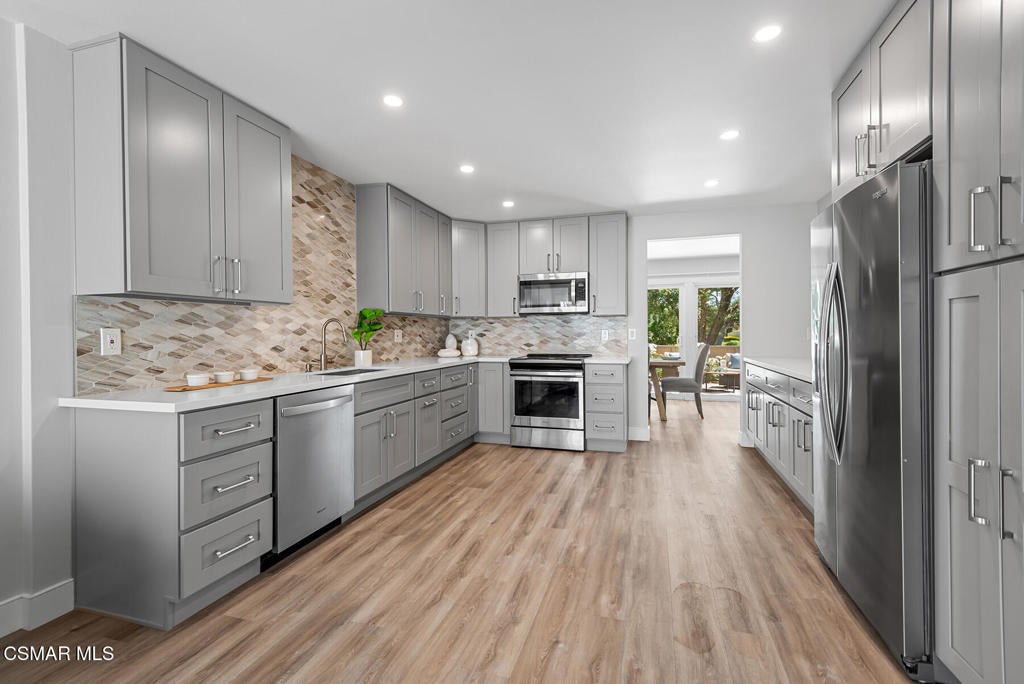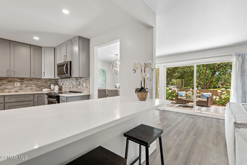 Beautifully Remodeled Turn-Key Townhome in Lakeshore. Welcome to this stunning, move-in-ready townhome nestled in the highly sought-after Lakeshore community, right in the heart of Westlake Village. Perfectly situated on a desirable cul-de-sac, this home offers the ideal blend of style, comfort, and convenience--just steps from one of three swimming pools, a pickleball/paddle tennis court, sand volleyball, a sandy beach, and a private lake dock. Inside, you'll find a gorgeously renovated kitchen featuring quartz countertops, stainless steel appliances, and a spacious eat-in area that opens onto a charming front patio. The open-concept floor plan flows seamlessly with luxury plank flooring throughout the main living areas. A breakfast bar connects the kitchen to the inviting living room, complete with a decorative fireplace. Enjoy serene views of the greenbelt and mature trees from the dining and living rooms, both opening to a peaceful back patio--ideal for indoor-outdoor living.Upstairs are three generously sized bedrooms with vaulted ceilings and abundant natural light, plus two beautifully updated full bathrooms. The primary suite is a true retreat, offering space, comfort, and timeless finishes.Additional features include: Convenient indoor laundry room with washer & dryer Detached 2-car garage with added storage Central location with easy access to the 101 freeway Located in the award-winning Las Virgenes School DistrictThe Lakeshore community offers resort-style amenities and is just minutes from Westlake Village's best attractions, including the Sunday Farmer's Market, Stonehaus, upscale and casual dining, boutique shopping, and scenic walking paths.This is the perfect opportunity to live in one of the most desirable communities in Westlake Village--a wonderful place to call home.