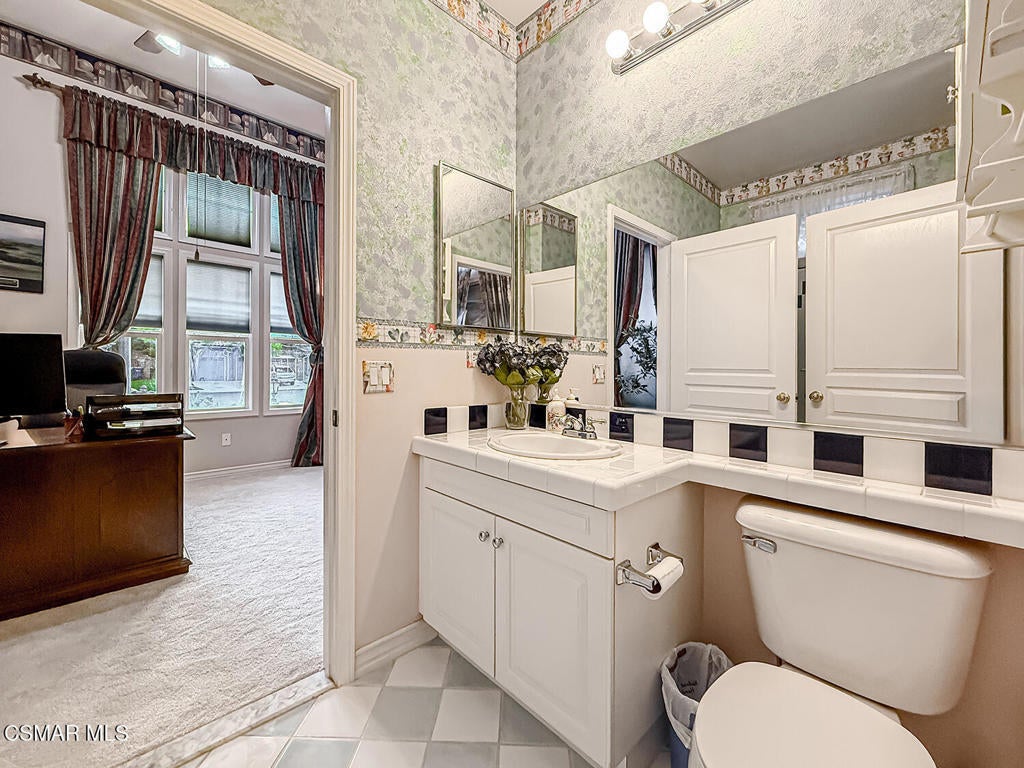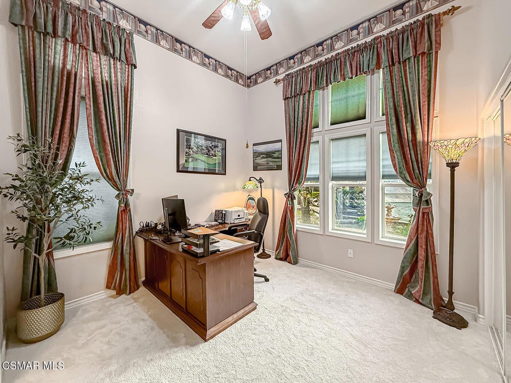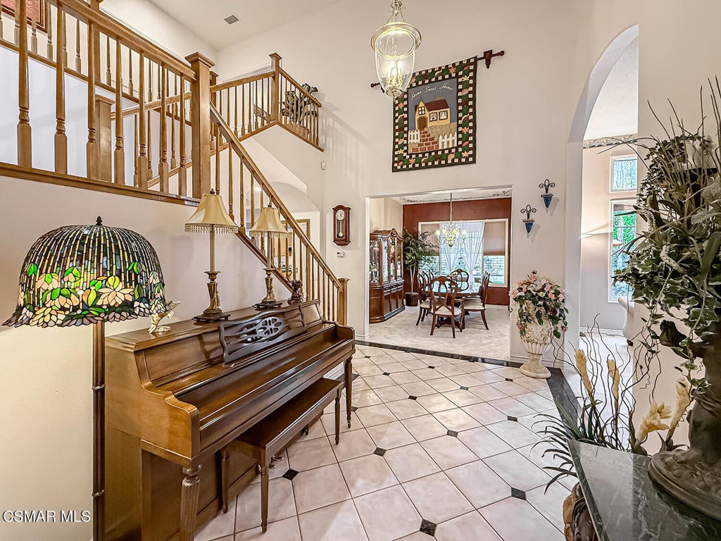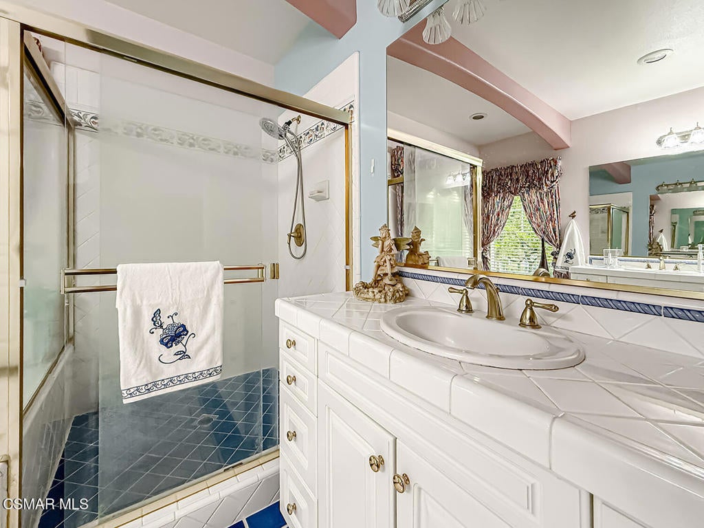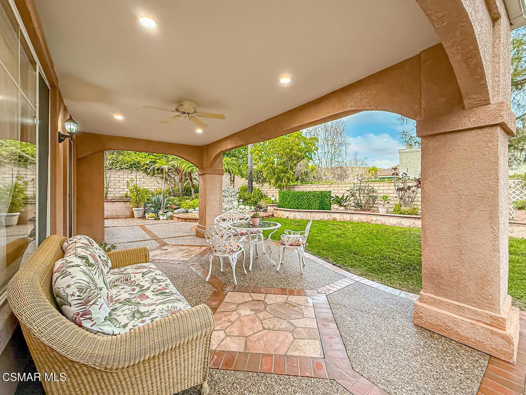 Located in the highly sought-after gated community of Long Canyon, this rarely available model sits on a quiet cul-de-sac adjacent to a scenic greenbelt and offers beautiful park and hillside views. Residents enjoy resort-style amenities including community pools, three recreation rooms, and a fully equipped gym, all included through the HOA.This spacious five-bedroom, four-and-a-half-bath residence features two bedrooms and two-and-a-half baths conveniently located on the main level, making it ideal for guests or multi-generational living.A grand entry welcomes you with a custom-designed ceiling detail and upgraded light fixture, leading into elegant living spaces that include a formal dining room and a chef's kitchen overlooking the expansive family room. The kitchen showcases custom tile flooring, a designer backsplash, under-sink water filtration, and high-quality finishes throughout. Travertine flooring enhances the warmth of the family room, while new carpet, upgraded semi-gloss paint, custom draperies, upgraded baseboards, and LED lighting throughout the home add a fresh and refined feel.Upstairs offers three spacious bedrooms, including a luxurious primary suite featuring gold fixtures, upgraded lighting, extra-large mirrors in the primary bathroom, and a double-sided mirrored closet door. A custom-designed window enhances one of the upstairs bedrooms, bringing in beautiful natural light. Additional interior upgrades include a tankless water heater with recirculating pump (only two years old), cabinets in the laundry room, an upgraded ceiling fan in the study, a downstairs bathroom with sliding door enclosure, and built-in cabinetry in the garage for added storage.The outdoor living spaces are equally impressive and designed for both relaxation and entertaining. The backyard features a custom low-maintenance landscape design, a private in-ground spa with waterfall fully controlled via internet, and brand-new spa equipment including filter, heater, controls, blower, and hedge covering. A round seating area provides the perfect gathering spot, while the concrete patio includes a ceiling fan, built-in LED lighting, and a freshly painted patio cover.One of the home's standout features is the custom-designed oversized balcony overlooking the park, complete with elegant pilasters, lighting, and electrical outlets. The balcony includes a Pella sliding door with built-in retractable blinds and was recently upgraded with beautiful wood-simulated porcelain tile flooring just one year ago.Additional exterior highlights include a block fence surrounding the property for privacy and a custom-designed side gate.This exceptional property combines thoughtful custom upgrades, functional living space, and a premier location within the highly desirable Long Canyon community.