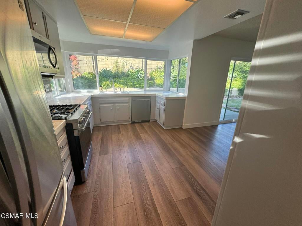 Single story 3 bedroom 2 bath home exclusive Mountain Valley Racket Club neighborhood in the center of Simi Valley. Spacious floor plan with a large living room, spacious formal dining room which also makes a great work at home space, remodeled kitchen with stainless steels appliances; large family room with slider access to the rear yard. Spacious primary suite with attached 3/4 bath. 2 additional bedrooms and full hall bath, indoor laundry. Central Air and heat. Attached 2 car garage with added storage. Patio and DG plus a hand built gazebo (hammock ready) rear yard. Large corner lot. The Racquet Club features a community pool and tennis courts plus a large community / recreation room. Close proximity to schools, shopping, parks and restaurants.