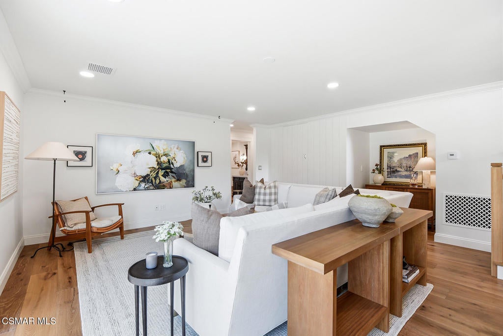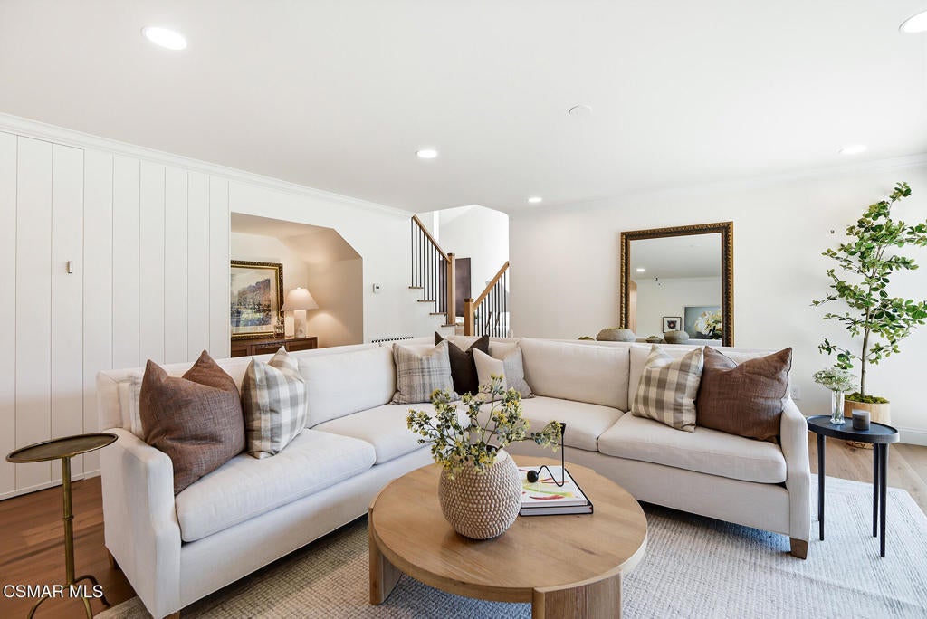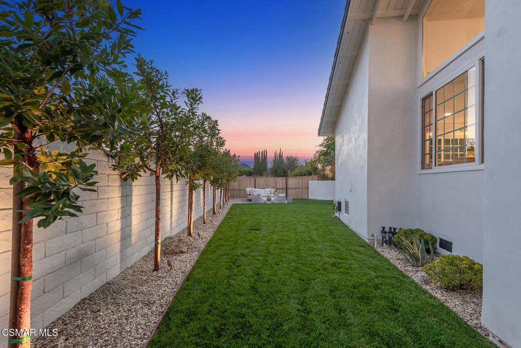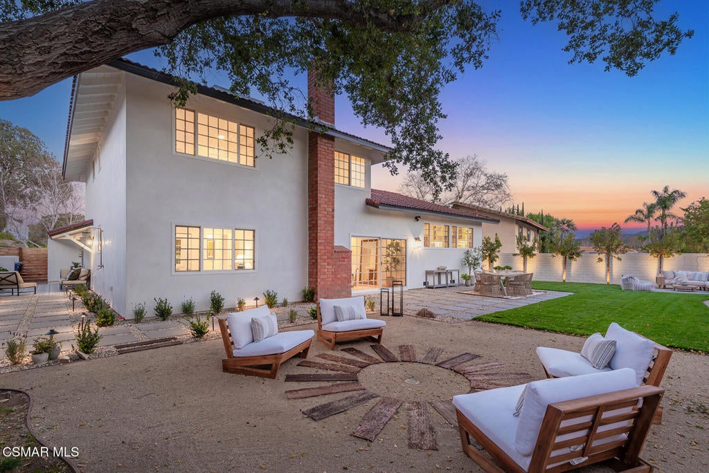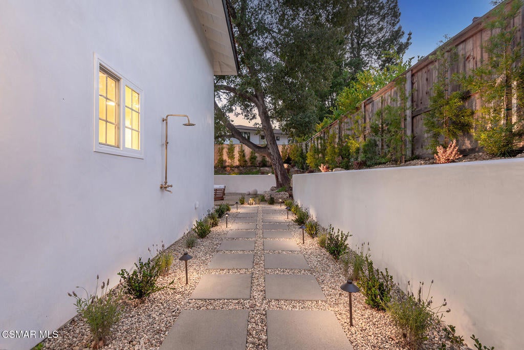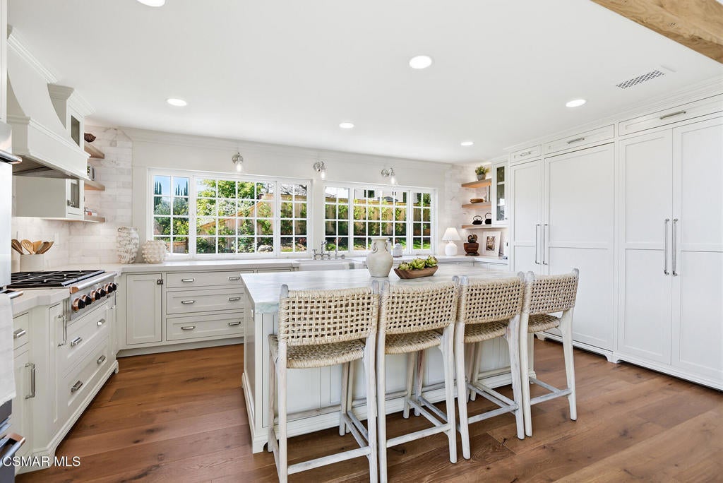 TURN-KEY, FULLY RENOVATED HOME IN WESTLAKE VILLAGE. Beautifully reimagined home with an emphasis on craftsmanship and timeless materials, this comprehensively renovated 4 bedroom, 3.5 bath residence blends classic architecture with modern living. Nine-inch engineered hardwood floors run throughout the home, complemented by high ceilings, refurbished beams, raised upstairs ceilings, and Level 4 smooth walls and ceilings that create a clean architectural backdrop. Crown molding, custom door casings, and a custom white oak bannister add refined millwork detail, while Arhaus lighting, Emtek polished nickel hardware, recessed LED lighting, and custom vent covers complete the interior.The kitchen has been completely reimagined with a permitted structural wall removal creating open flow around a striking 7.5-foot leathered quartzite island with seating for four. Custom inset cabinetry with soft-close drawers and integrated organizers is paired with Caesarstone countertops, a Shaws farmhouse sink, Graff polished nickel fixtures, and integrated GE Monogram appliances alongside a Dacor six-burner range with double ovens and warming drawer.All bathrooms have been fully renovated with marble tile, furniture-style vanities, Caesarstone surfaces, and polished nickel finishes. A custom-designed powder room serves as a standout design feature with a vintage vanity, quartzite backsplash, Anthropologie lighting, designer wallpaper, and a concealed hidden door. A custom laundry room offers built-in cabinetry, designer tile, and an integrated laundry chute.The exterior has been refreshed with smooth stucco finishes, newly designed landscaping, and paver pathways connecting multiple outdoor seating areas, along with a private courtyard patio and outdoor shower.Additional improvements include a finished garage with smoothed walls, epoxy flooring, new Clopay garage doors, new water heater, and an upgraded electrical panel ready for EV charging.Located within the attendance boundaries of Westlake Elementary School, Colina Middle School, and Westlake High School.