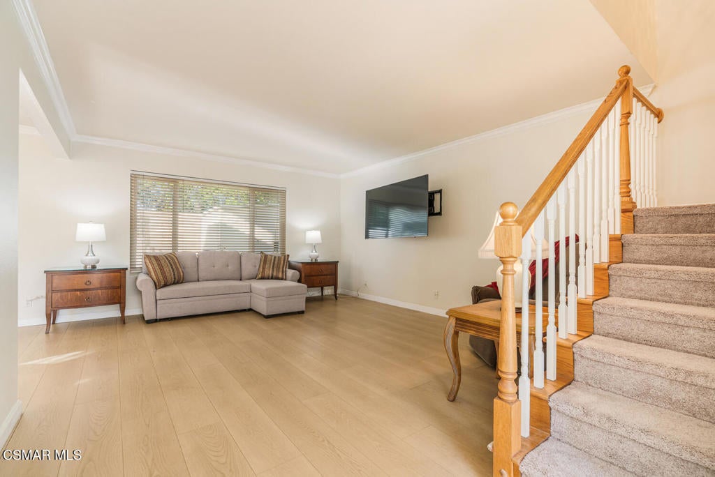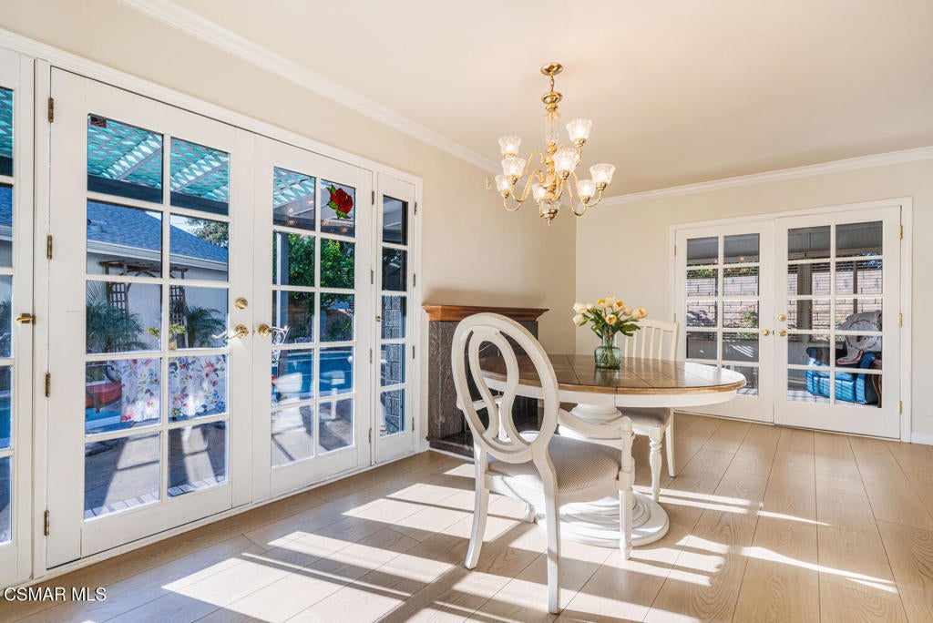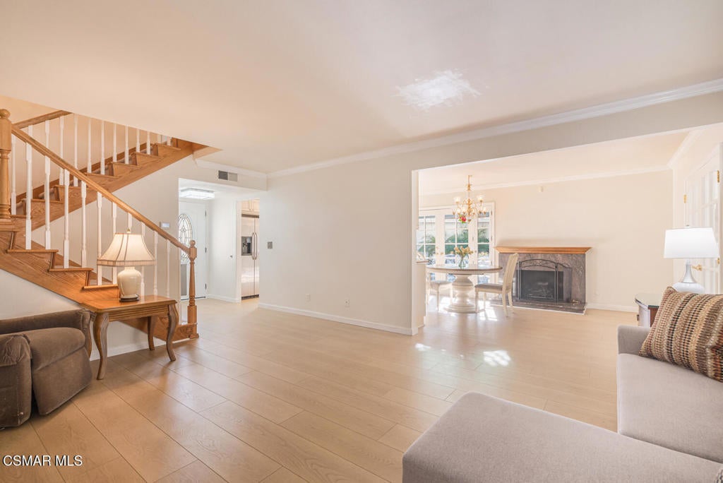 This well-designed home on a cul-de-sac is centrally located in Agoura Hills. At entry, be greeted by a great room illuminated by its large window and crown moldings. There is an adjacent dining or sitting area with a fireplace; a cozy enclosed climate controlled sun room; and the kitchen with upgraded paneled cabinetry, two garden windows, and a sliding door to the side covered patio and backyard. The kitchen features: granite countertops; a six burner stove; updated pullouts; a microwave; and recess lighting. On the ground floor there is a guest bathroom. The covered entry area includes both the home's front door and an exterior door to the 2-car garage; the garage has additional space for a washer and dryer, a window, and cabinetry. Tour upstairs appreciating the convenient switchback staircase, on the second floor there is a pull down ladder for access to the attic area. The primary bedroom has a window overlooking the backyard. The primary bathroom has a granite countertop with sink and a combo shower bathtub. Windows brighten the other two cheerful upstairs bedrooms which have access to the upstairs third hall bathroom with an enclosed shower and bathtub. Enjoy your backyard entertaining and lounging with its free form pool and spa; and the built-in BBQ center includes a compact refrigerator. Other features and amenities: mirror wardrobes; ceiling fans; a storage shed; and located close to the home's community pool, tennis and pickleball courts, driving range, and golf course; also close to public schools, parks, trails, mountain biking, shopping, and other recreation.