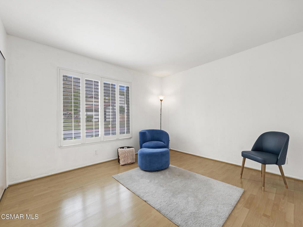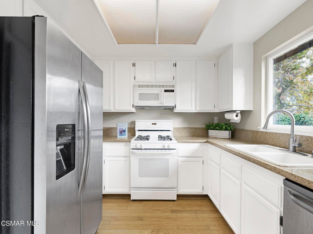 Welcome to one of Oak Park's quietest and most desirable settings--an ideal single-story retreat that offers immense privacy, peaceful surroundings, and open views of treetops and distant hills. Fully detached home and set within a charming community known for its low HOA fees, this rare residence presents a unique opportunity to own one of the few true single-level homes available in the neighborhood.Inside, the home unfolds with warmth and natural light. An inviting foyer leads to the expansive living room, where vaulted ceilings, hardwood flooring, and a classic brick fireplace with a white mantle create an elegant yet comfortable gathering space. The living room blends seamlessly with the dining area, both enjoying views of the backyard through large windows that frame the greenery outside.The adjacent kitchen is bright and cheerful, offering white cabinetry, granite countertops, new appliances and a wide picture window overlooking the private backyard--perfect for enjoying morning sun and tranquil outdoor views. This open layout makes everyday living and entertaining both easy and enjoyable.Each of the home's two bedrooms functions as a private suite, complete with its own full bath--one finished with granite counters, the other with quartz. The thoughtful single-level design means no interior steps, enhanced by hard-surface flooring throughout, upgraded LED recessed lighting, dual-pane windows, central heating and air, and a durable concrete tile roof.The backyard is a wonderful extension of the home: fully fenced, private, and designed for outdoor enjoyment. A spacious patio and generous grassy area are surrounded by citrus trees and natural landscape views--an ideal space for relaxing, gardening, play, or entertaining. An attached two-car garage adds convenience and additional storage.Residents enjoy a beautifully maintained community complete with a sparkling pool and spa, front yard landscape maintenance through the HOA, and the added security of living in a nationally recognized Firewise Community. Parks, tennis courts, scenic walking and hiking trails, shopping, dining, and access to the 101 freeway are all nearby, along with award-winning Oak Park schools.Offering comfort, convenience, privacy, and an exceptional location, this special home is perfect for anyone seeking an easy, single-level lifestyle in one of Oak Park's most beloved neighborhoods.